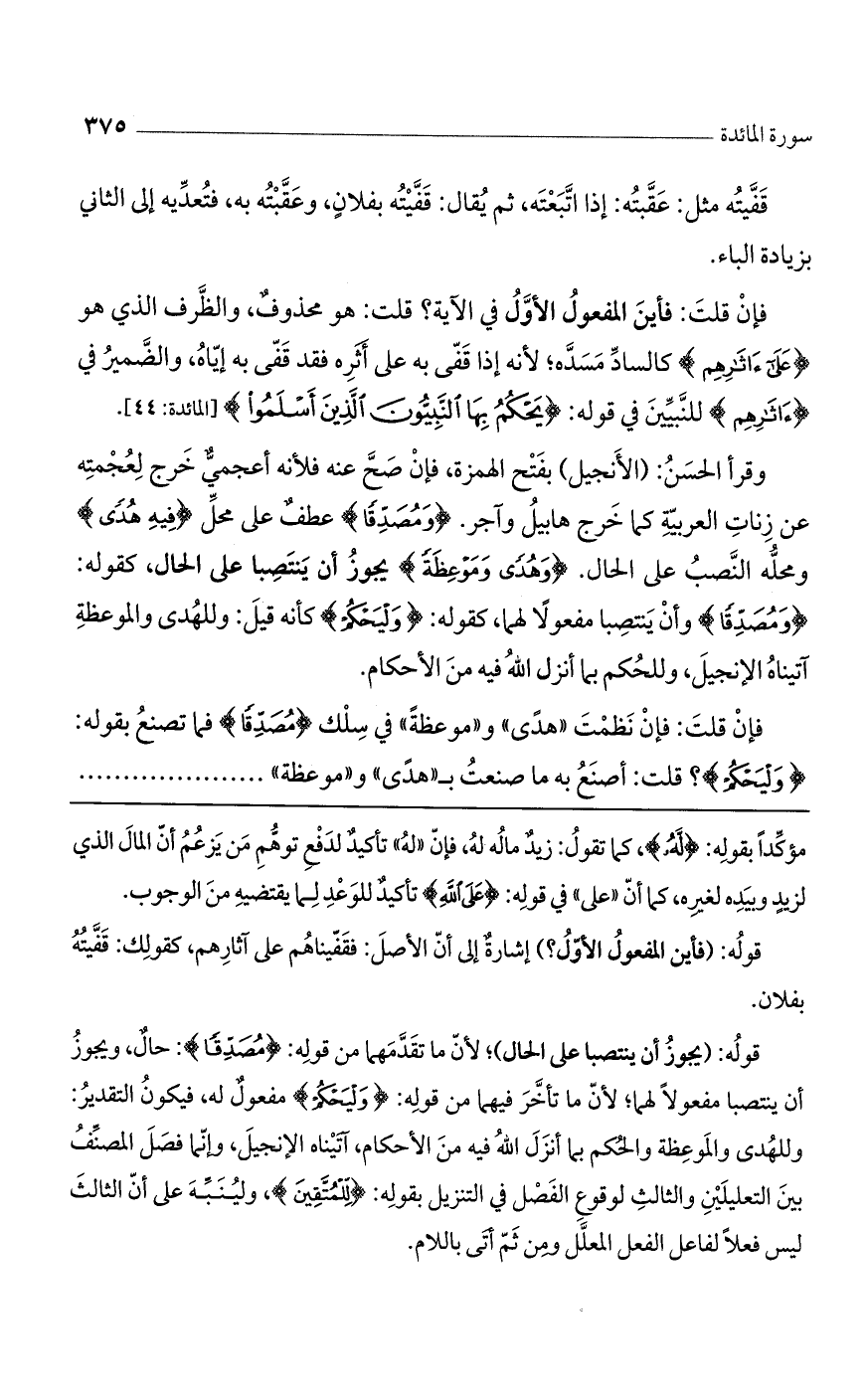 فإن قلت: فإن نظمت "هُدىً" و"مَوْعِظَةً" في سلك (مصدقاً) فما تصنع بقوله: (وليحكم)؟ قلت: أصنع به ما صنعت بـ"هدى" و"موعظة"