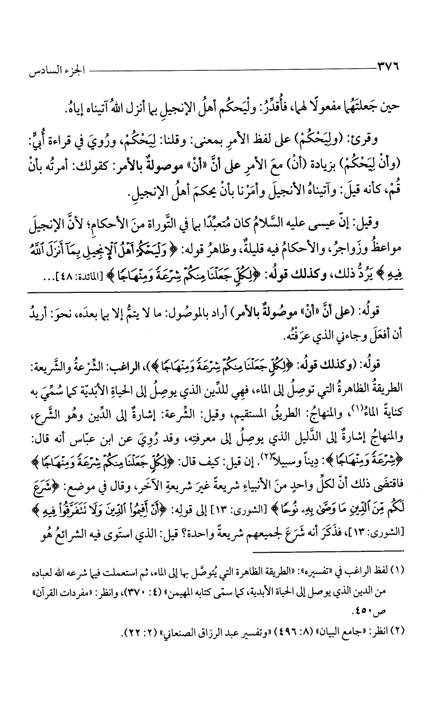 قوله: (وكذلك قوله: {لِكُلٍّ جَعَلْنَا مِنْكُمْ شِرْعَةً وَمِنْهَاجاً}، الراغب: الشرعة والشريعة: الطريقة الظاهرة التي توصل إلى الماء، فهي للدين الذي يوصل إلى الحياة الأبدية كما سُمي به كناية الماء، والمنهاج: الطريق المستقيم، وقيل: الشرعة: إشارة إلى الدين وهو الشرع، والمنهاج إشارة إلى الدليل الذي يوصل إلى معرفته، وقد رُوي عن ابن عباس أنه قال: {شِرْعَةً وَمِنْهَاجاً}: ديناً وسبيلاً. إن قيل: كيف قال: {لِكُلٍّ جَعَلْنَا مِنْكُمْ شِرْعَةً وَمِنْهَاجاً} فاقتضى ذلك أن لكل واحد من الأنبياء شريعة غير شريعة الآخر، وقال في موضع: {شَرَعَ لَكُمْ مِنْ الدِّينِ مَا وَصَّى بِهِ نُوحاً} [الشورى: 13] إلى قوله: {أَنْ أَقِيمُوا الدِّينَ وَلا تَتَفَرَّقُوا فِيهِ} [الشورى: 13]، فذكر أنه شرع لجميعهم شريعة واحدة؟ قيل: الذي استوى فيه الشرائع هو