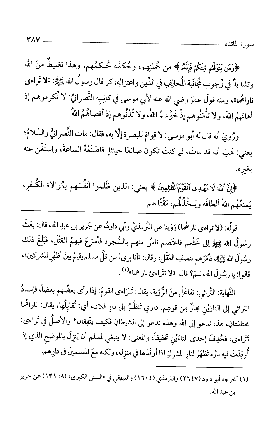 قوله: (لا تراءى ناراهما) روينا عن الترمذي وأبي داود، عن جرير بن عبد الله، قال: بعث رسول الله صلى الله عليه وسلم إلى خثعم فاعتصم ناس منهم بالسجود فأسرع فيهم القتل، فبلغ ذلك رسول الله صلى الله عليه وسلم، فأمرهم بنصف العقل، وقال: "أنا برئ من كل مسلم يقيم بين أظهر المشركين"، قالوا: يا رسول الله، لم؟ قال: "لا تتراءى ناراهما".
