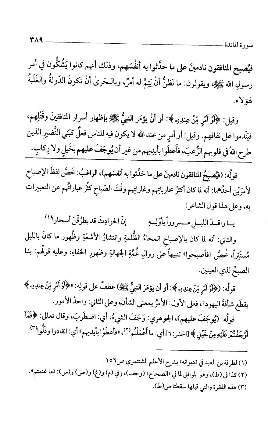 قوله: (فيصبح المنافقون نادمين على ما حدثوا به أنفسهم)، الراغب: خص لفظ الإصباح لأمرين أحدهما: أنه لما كان أكثر محارباتهم وغاراتهم وقت الصباح كثر عباراتهم عن التعبيرات به، وعلى هذا قول الشاعر: