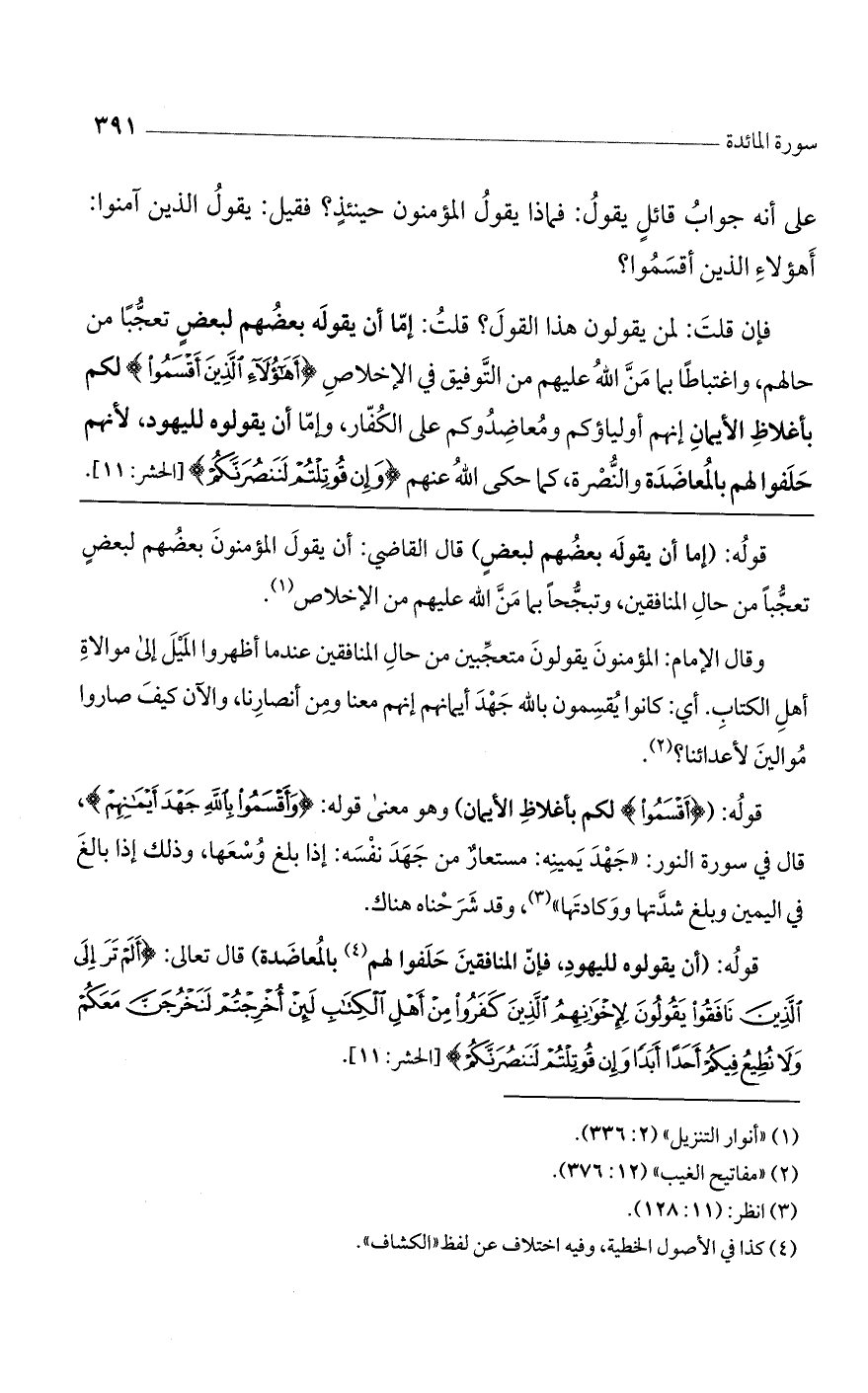 وقال الإمام: المؤمنون يقولون متعجبين من حال المنافقين عندما أظهروا الميل إلى موالاة أهل الكتاب. أي: كانوا يقسمون بالله جهد أيمانهم إنهم معنا ومن أنصارنا، والآن كيف صاروا موالين لأعدائنا؟
