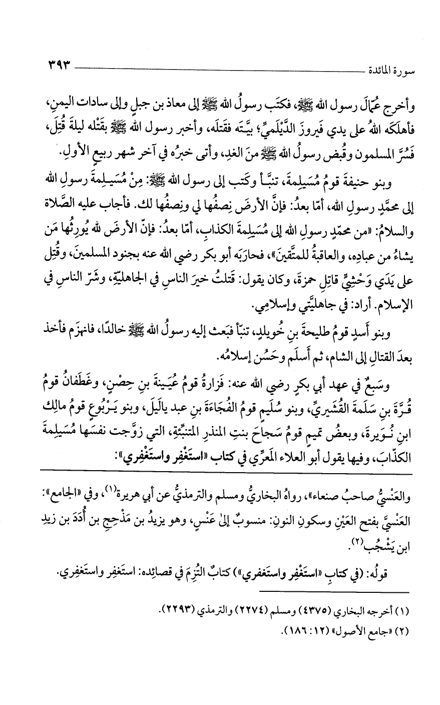 وبنو حنيفة قوم مسيلمة، تنبأ وكتب إلى رسول اللَّه صلى اللَّه عليه وسلم: من مسيلمة رسول اللَّه إلى محمدٍ رسول اللَّه، أمّا بعد: فإن الأرض نصفها لي ونصفها لك. فأجاب عليه الصلاة والسلام: «من محمد رسول اللَّه إلى مسيلمة الكذاب. أما بعد، فإن الأرض للَّه يورثها من يشاء من عباده والعاقبة للمتقين»، فحاربه أبو بكر رضي اللَّه عنه بجنود المسلمين، وقتل على يدي وحشي قاتل حمزة، وكان يقول: قتلت خير الناس في الجاهلية، وشرّ الناس في الإسلام، أراد في جاهليتى وإسلامى.