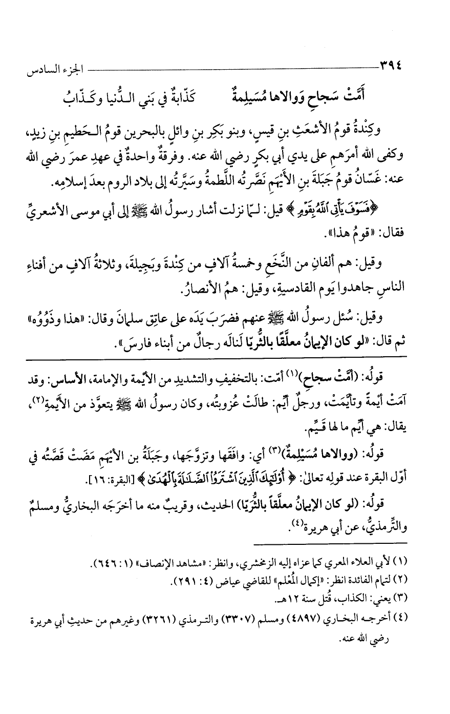 أمَّتْ سجَاحٌ وَوَالاهَا مُسَيْلِمَةٌ ... كَذَّابَةٌ فِى بَنِى الدُّنْيَا وَكَذَّابُ