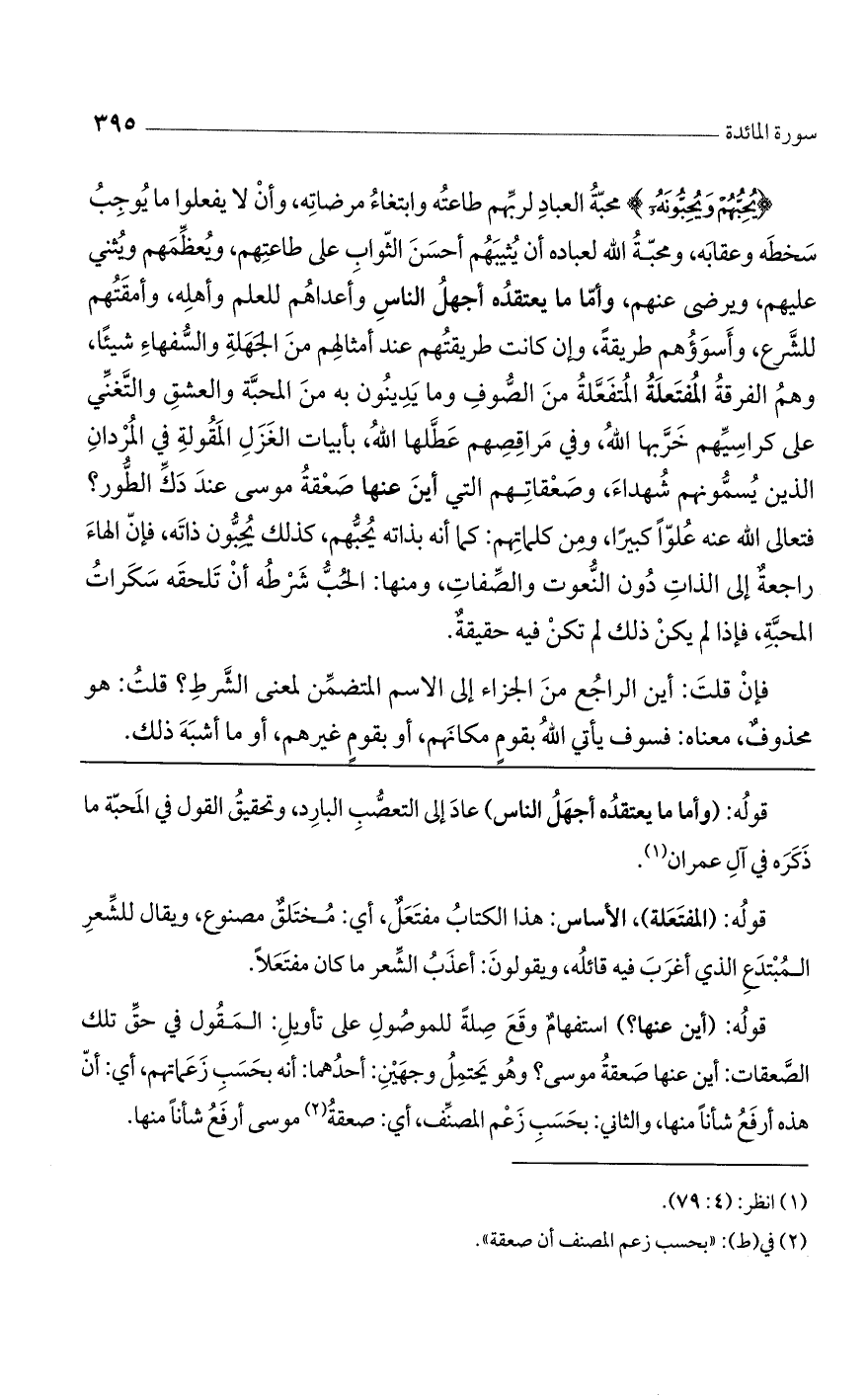 (يُحِبُّهُمْ وَيُحِبُّونَهُ) محبة العباد لربهم طاعته وابتغاء مرضاته، وأن لا يفعلوا ما يوجب سخطه وعقابه. ومحبة اللَّه لعباده أن يثيبهم أحسن الثواب على طاعتهم ويعظمهم ويثني عليهم ويرضى عنهم، وأما ما يعتقده أجهل الناس وأعداهم للعلم وأهله، وأمقتهم للشرع وأسوؤهم طريقةً، وإن كانت طريقتهم عند أمثالهم من الجهلة والسفهاء شيئاً، وهم الفرقة المفتعلة المتفعلة من الصوف وما يدينون به من المحبة والعشق والتغني على كراسيهم خربها اللَّه، وفي مراقصهم عطلها اللَّه، بأبيات الغزل المقولة في المردان الذين يسمونهم شهداء، وصعقاتهم التي أين عنها صعقة موسى عند دكّ الطور، فتعالى اللَّه عنه علواً كبيراً، ومن كلماتهم: كما أنه بذاته يحبهم، كذلك يحبون ذاته، فإنّ الهاء راجعة إلى الذات دون النعوت والصفات. ومنها: الحب شرطه أن تلحقه سكرات المحبة، فإذا لم يكن ذلك لم تكن فيه حقيقةٌ.