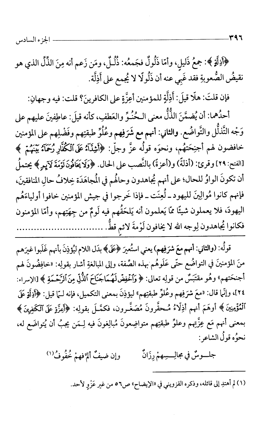 أحدهما: أن يضمن الذلّ معنى الحنوّ والعطف، كأنه قيل: عاطفين عليهم على وجه التذلل والتواضع. والثاني: أنهم مع شرفهم وعلو طبقتهم وفضلهم على المؤمنين خافضون لهم أجنحتهم، ونحوه قوله عز وجل: (أَشِدَّاءُ عَلَى الْكُفَّارِ رُحَماءُ بَيْنَهُمْ) [الفتح: 29] وقرئ: (أذلةً) و (أعزةً) بالنصب على الحال. (وَلا يَخافُونَ لَوْمَةَ لائِمٍ) يحتمل أن تكون الواو للحال؛ على أنهم يجاهدون وحالهم في المجاهدة خلاف حال المنافقين، فإنهم كانوا موالين لليهود - لعنت - فإذا خرجوا في جيش المؤمنين خافوا أولياءهم اليهود، فلا يعملون شيئاً مما يعلمون أنه يلحقهم فيه لوم من جهتهم. وأما المؤمنون فكانوا يجاهدون لوجه اللَّه لا يخافون لومة لائم قط .........