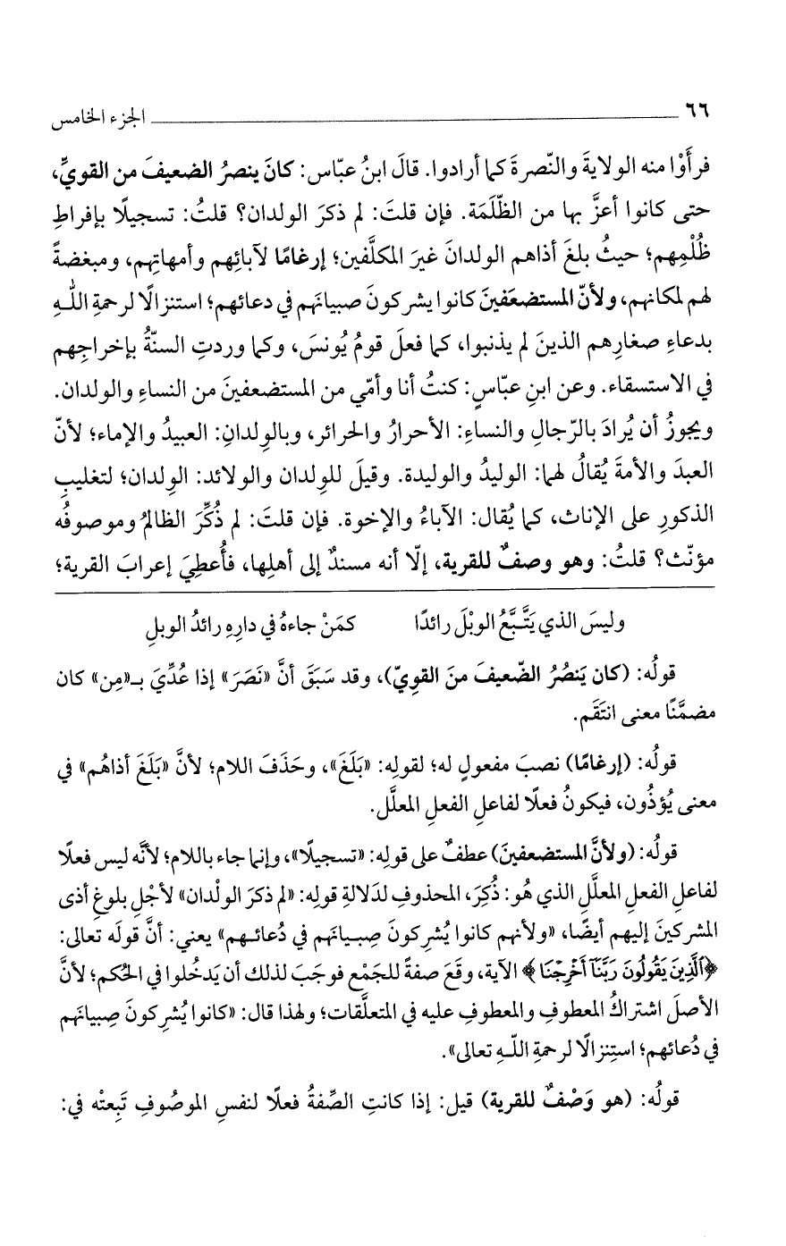 قوله: (ولأن المستضعفين) عطفٌ على قوله: ((تسجيلاً))، وإنما جاء باللام؛ لأنه ليس فعلاً لفاعل الفعل المعلل الذي هو: ذكر، المحذوف لدلالة قوله: ((لم ذكر الولدان)) لأجل بلوغ أذى المشركين إليهم أيضاً، ((ولأنهم كانوا يشركون صبيانهم في دعائهم)) يعني: أن قوله تعالى: (الَّذِينَ يَقُولُونَ رَبَّنَا أَخْرِجْنَا) الآية، وقع صفةً للجمع فوجب لذلك أن يدخلوا في الحكم؛ لأن الأصل اشتراك المعطوف والمعطوف عليه في المتعلقات؛ ولهذا قال: ((كانوا يشركون صبيانهم في دعائهم؛ استنزالاً لرحمة الله تعالى)).