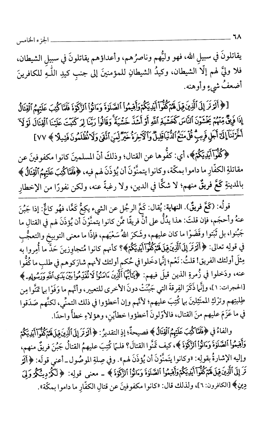 (كُفُّوا أَيْدِيَكُمْ)، أي: كفوها عن القتال؛ وذلك أن المسلمين كانوا مكفوفين عن مقاتلة الكفار ما داموا بمكة، وكانوا يتمنون أن يؤذن لهم فيه، (فَلَمَّا كُتِبَ عَلَيْهِمُ الْقِتالُ) بالمدينة كع فريق منهم؛ لا شكا في الدين، ولا رغبة عنه، ولكن نفوراً من الإخطار