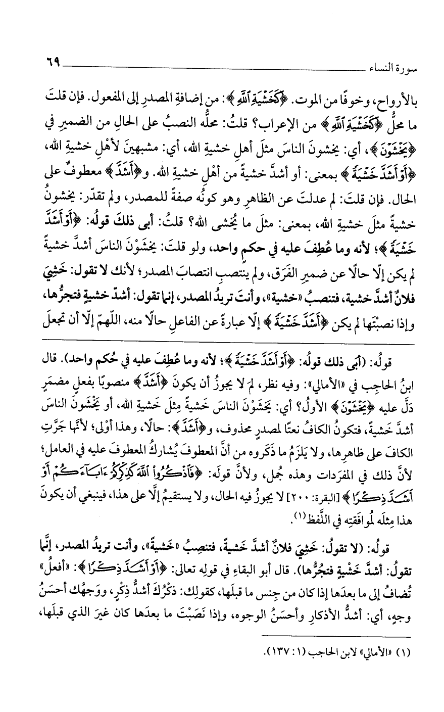 قوله: (أبى ذلك قوله: (أَوْ أَشَدَّ خَشْيَةً)؛ لأنه وما عطف عليه في حكم واحد). قال ابن الحاجب في ((الأمالي)): وفيه نظر، لم لا يجوز أن يكون (أَشَدَّ) منصوباً بفعلٍ مضمرٍ دل عليه (يَخْشَوْنَ) الأول؟ أي: يخشون الناس خشيةً مثل خشية الله، أو يخشون الناس أشد خشيةً، فتكون الكاف نعتاً لمصدرٍ محذوف، و (أَشَدَّ): حالاً، وهذا أولى؛ لأنها جرت الكاف على ظاهرها، ولا يلزم ما ذكروه من أن المعطوف يشارك المعطوف عليه في العامل؛ لأن ذلك في المفردات وهذه جمل، ولأن قوله: (فَاذْكُرُوا اللَّهَ كَذِكْرِكُمْ آبَاءَكُمْ أَوْ أَشَدَّ ذِكْرًا) [البقرة: 200] لا يجوز فيه الحال، ولا يستقيم إلا على هذا، فينبغي أن يكون هذا مثله لموافقته في اللفظ.