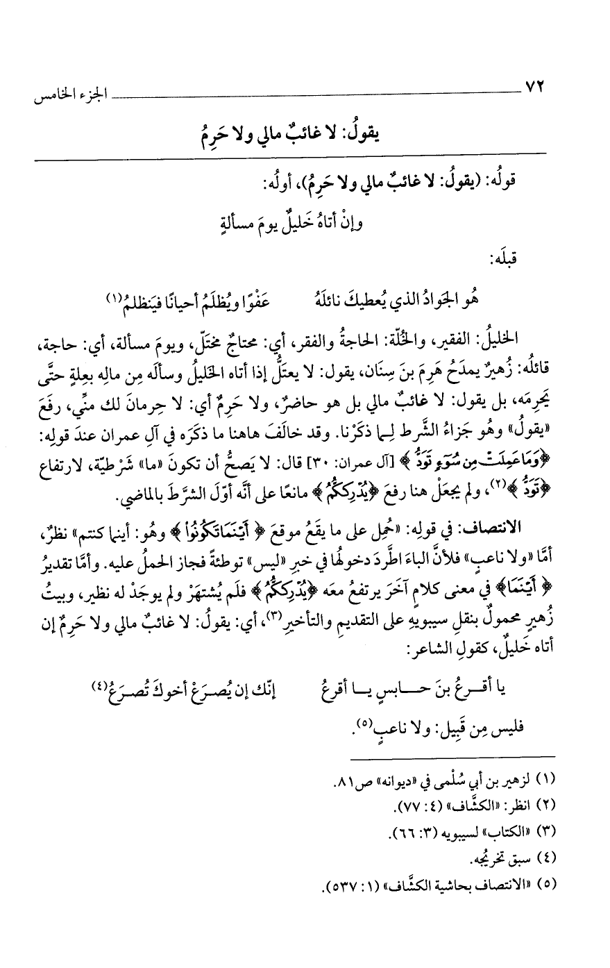 الخليل: الفقير، والخلة: الحاجة والفقر، أي: محتاج مختل، ويوم مسألة، أي: حاجة، قائله: زهير يمدح هرم بن سنان، يقول: لا يعتل إذا أتاه اخلي وسأله من ماله بعلةٍ حتى يحرمه، بل يقول: لا غائب مالي بل هو حاضر، ولا حرم أي: لا حرمان لك مني، رفع ((يقول)) وهو جزاء الشرط لما ذكرنا. وقد خاف ها هنا ما ذكره في آل عمران عند قوله: (ومَا عَمِلَتْ مِن سُوءٍ تَوَدُّ) [آل عمران: 30] قال: لا يصح أن تكون ((ما)) شرطية، لارتفاع (تَوَدُّ)، ولم يجعل هن رفع (يُدْرِككُّمُ) مانعاً على أنه أول الشرط بالماضي.
