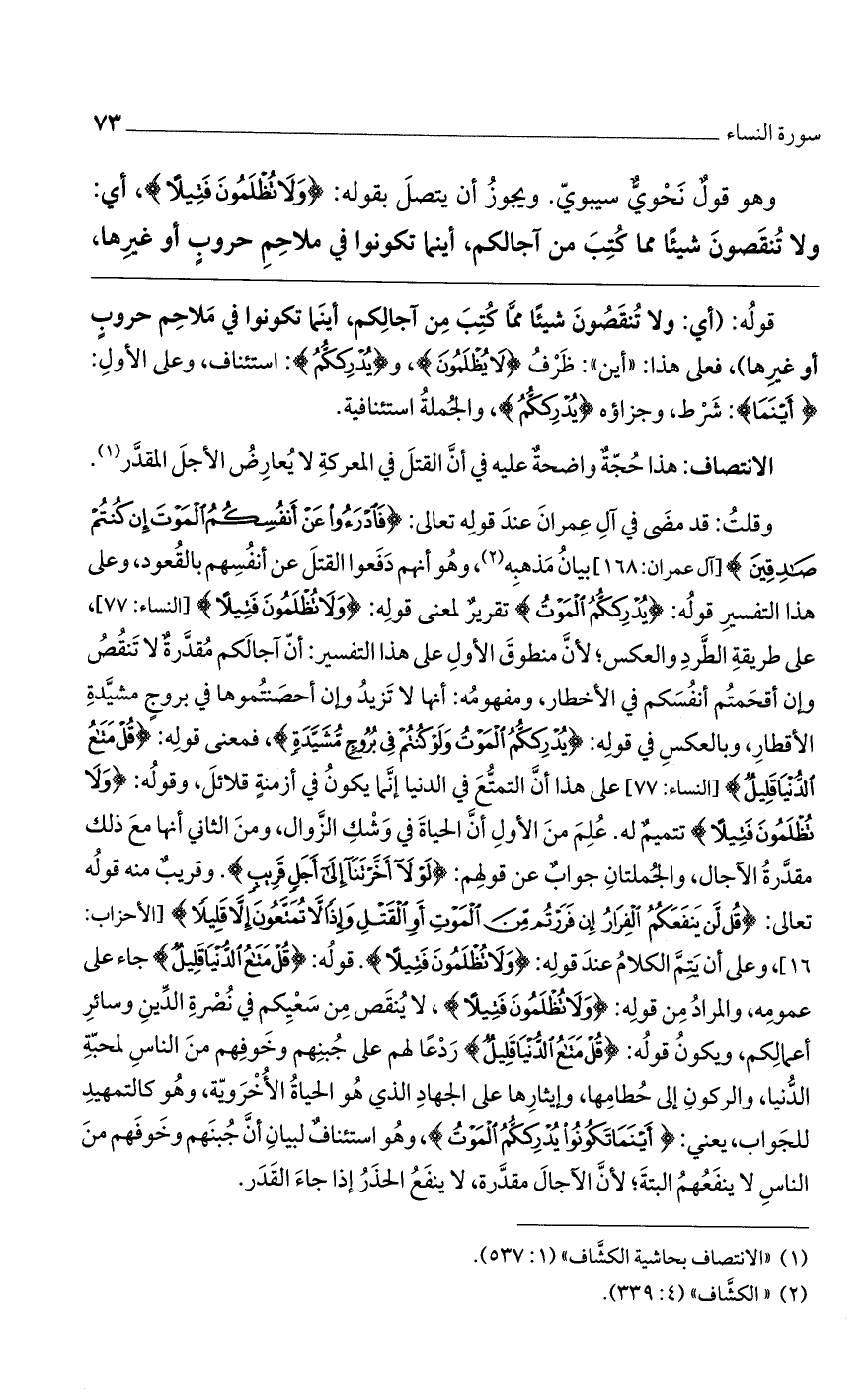 وقلت: قد مضى في آل عمران عند قوله تعالى: (فَادْرَءُوا عَنْ أَنفُسِكُمُ المَوْتَ إن كُنتُمْ صَادِقِينَ) [آل عمران: 168] بيان مذهبه، وهو أنهم دفعوا القتل عن أنفسهم بالقعود، وعلى هذا التفسير قوله: (يُدْرِككُّمُ المَوْتُ) تقريرٌ لمعنى قوله: (ولا تُظْلَمُونَ فَتِيلاً) [النساء: 77]، على طريقة الطرد والعكس؛ لأن منطوق الأول على هذا التفسير: أن آجالكم مقدرةٌ لا تنقص وإن أقحمتم أنفسكم في الأخطار، ومفهومه: أنها لا تزيد وإن أحصنتموها في بروجٍ مشيدة الأقطار، وبالعكس في قوله: (يُدْرِككُّمُ المَوْتُ ولَوْ كُنتُمْ فِي بُرُوجٍ مُّشَيَّدَةٍ)، فمعنى قوله: (قُلْ مَتَاعُ الدُّنْيَا قَلِيلٌ) [النساء: 77] على هذا أن التمتع في الدنيا إنما يكون في أزمنةٍ قلائل، وقوله: (ولا تُظْلَمُونَ فَتِيلاً)) تتميمٌ له. علم من الأول أن الحياة في وشك الزوال، ومن الثاني أنها مع ذلك مقدرة الآجال، والجملتان جوابٌ عن قولهم: (لَوْلا أَخَّرْتَنَا إلَى أَجَلٍ قَرِيبٍ). وقريبٌ منه قوله تعالى: (قُل لَّن يَنفَعَكُمُ الفِرَارُ إن فَرَرْتُم مِّنَ المَوْتِ أَوِ القَتْلِ وإذًا لاَّ تُمَتَّعُونَ إلاَّ قَلِيلاً) [الأحزاب: 16]، وعلى أن يتم الكلام عند قوله: (ولا تُظْلَمُونَ فَتِيلاً) قوله: (قُلْ مَتَاعُ الدُّنْيَا قَلِيلٌ) جاء على عمومه، والمراد من قوله: (ولا تُظْلَمُونَ فَتِيلاً)، لا ينقص من سعيكم في نصرة الدين وسائر أعمالكم، ويكون قوله: (قُلْ مَتَاعُ الدُّنْيَا قَلِيلٌ)) ردعاً لهم على جبنهم وخوفهم من الناس لمحبة الدنيا، والركون إلى حطامها، وإيثارها على الجهاد الذي هو الحياة الأخروية، وهو كالتمهيد للجواب، يعني: (أَيْنَمَا تَكُونُوا يُدْرِككُّمُ المَوْتُ)، وهو استئنافٌ لبيان أن جبنهم وخوفهم من الناس لا ينفعهم البتة؛ لأن الآجال مقدرة، لا ينفع الحذر إذا جاء القدر.