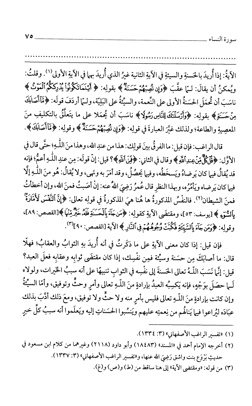 قال الراغب: فإن قيل: ما الفرق بين قولك: هذا من عند الله، وهذا من الله؛ حتى قال في الأول: (قُلْ كُلٌّ مِّنْ عِندِ اللَّهِ) وقال في الثاني: (فَمِنَ اللَّهِ)؟ قيل: إن قوله: من عند الله أعم؛ فإنه قد يقال فيما كان يرضاه ويسخطه، وفيما يحصل، وقد أمر به ونهى، ولا يقال: هو من الله إلا فيما يرضاه ويأمره، وبهذا النظر قال عمر رضي الله عنه: إن أصبت فمن الله، وإن أخطأت فمن الشيطان. فالنفس المذكورة في قوله تعالى: (إنَّ النَّفْسَ لأَمَّارَةٌ بِالسُّوءِ) [يوسف: 53]، ومقتضى الآية كقوله: (مَن جَاءَ بِالْحَسَنَةِ فَلَهُ خَيْرٌ مِّنْهَا) [القصص: 89]، وقوله: (ومَن جَاءَ بِالسَّيِّئَةِ فَكُبَّتْ وجُوهُهُمْ فِي النَّارِ) الآية: [القصص: 90].