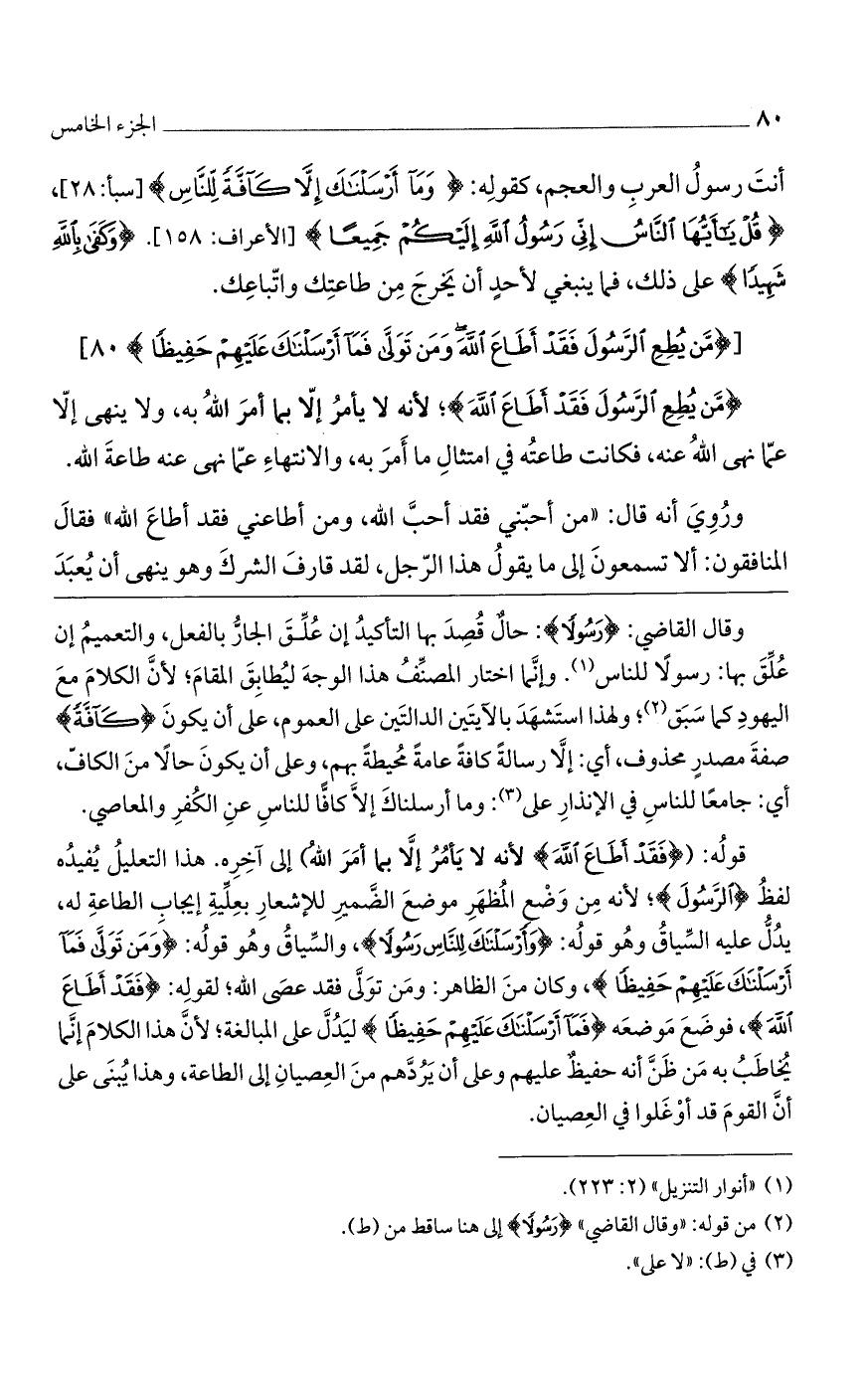 قوله: ((فَقَدْ أَطَاعَ اللَّهَ) لأنه لا يأمر إلا بما أمر الله) إلى آخره. هذا التعليل يفيده لفظ (الرَّسُولَ)؛ لأنه من وضع المظهر موضع الضمير للإشعار بعلية إيجاب الطاعة له، يدل عليه السياق وهو قوله: (وأَرْسَلْنَاكَ لِلنَّاسِ رَسُولاً)، والسياق وهو قوله: (ومَن تَوَلَّى فَمَا أَرْسَلْنَاكَ عَلَيْهِمْ حَفِيظًا)، وكان من الظاهر: ومن تولى فقد عصى الله؛ بقوله: (فَقَدْ أَطَاعَ اللَّهَ)، فوضع موضعه (فَمَا أَرْسَلْنَاكَ عَلَيْهِمْ حَفِيظًا) ليدل على المبالغة؛ لأن هذا الكلام إنما يخاطب به من ظن أنه حفيظٌ عليهم وعلى أن يردهم من العصيان إلى الطاعة، وهذا يبنى على أن القوم قد أوغلوا في العصيان.