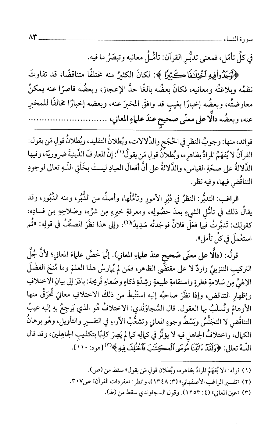 قوله: (دالاًّ على معنًى صحيحٍ عند علماء المعاني). إنما خص علماء المعاني؛ لأن جل التركيب التنزيلي وارد لا على مقتضى الظاهر، فمن لم يمارس هذا العلم وما منح الفضل الإلهي من سلامة فطرةٍ واستقامة طبيعةٍ وشدة ذكاءٍ وصفاء قريحة: بادر إلى بيان الاختلاف وإظهار التناقض، وإذا نظر صاحبه إليه استنبط من ذلك الاختلاف معاني تحرق منها الأوهام وتسلب بها العقول. قال السجاوندي: الاختلاف هو الذي يرجع به إليه عيب التناقض لا التجنس وبسط وجوه المعاني وتشعب الآراء في التفسير والتأويل، وهو برهان الكمال، واختلاف الجاهل فيه لا يؤثر في كماله كما لم يصر كذباً بتكذيب الجاهلين، وقد قال الله تعالى: (ولَقَدْ آتَيْنَا مُوسَى الكِتَابَ فَاخْتُلِفَ فِيهِ) [هود: 110].