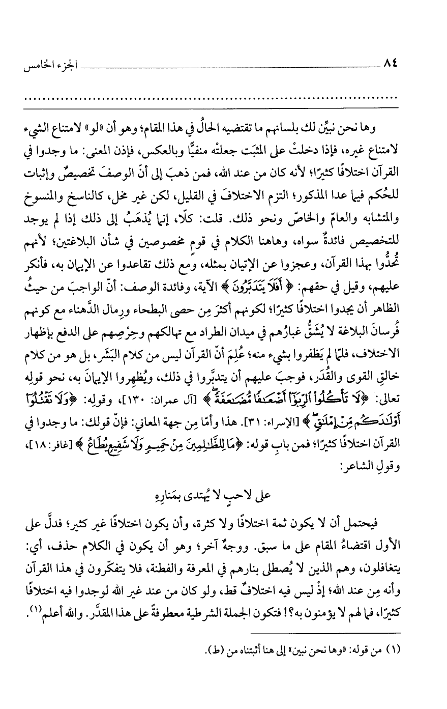 وها نحن نبين لك بلسانهم ما تقتضيه الحال في هذا المقام؛ وهو أن ((لو)) لامتناع الشيء لامتناع غيره، فإذا دخلت على المثبت جعلته منفيًّا وبالعكس، فإذن المعنى: ما وجدوا في القرآن اختلافاً كثيراً؛ لأنه كان من عند الله، فمن ذهب إلى أن الوصف تخصيصٌ وإثبات للحكم فيما عدا المذكور؛ التزم الاختلاف في القليل، لكن غير مخل، كالناسخ والمنسوخ والمتشابه والعام والخاص ونحو ذلك. قلت: كلا، إنما يذهب إلى ذلك إذا لم يوجد للتخصيص فائدةٌ سواه، وها هنا الكلام في قومٍ مخصوصين في شأن البلاغتين؛ لأنهم تحدوا بهذا القرآن، وعجزوا عن الإتيان بمثله، ومع ذلك تقاعدوا عن الإيمان به، فأنكر عليهم، وقيل في حقهم: (أَفَلا يَتَدَبَّرُونَ) الآية، وفائدة الوصف: أن الواجب من حيث الظاهر أن يجدوا اختلافاً كثيراً؛ لكونهم أكثر من حصى البطحاء ورمال الدهناء مع كونهم فرسان البلاغة لا يشق غبارهم في ميدان الطراد مع تهالكهم وحرصهم على الدفع بإظهار الاختلاف، فلما لم يظفروا بشيء منه؛ علم أن القرآن ليس من كلام البشر، بل هو من كلام خالق القوى والقدر، فوجب عليهم أن يتدبروا في ذلك، ويظهروا الإيمان به، نحو قوله تعالى: (لا تَاكُلُوا الرِّبَا أَضْعَافًا مُّضَاعَفَةً) [آل عمران: 130]، وقوله: (ولا تَقْتُلُوا أَوْلادَكُم مِّنْ إمْلاقٍ) [الإسراء: 31]. هذا وأما من جهة المعاني: فإن قولك: ما وجدوا في القرآن اختلافاً كثيراً؛ فمن باب قوله: (مَا لِلظَّالِمِينَ مِنْ حَمِيمٍ ولا شَفِيعٍ يُطَاعُ) [غافر: 18]، وقول الشاعر:
