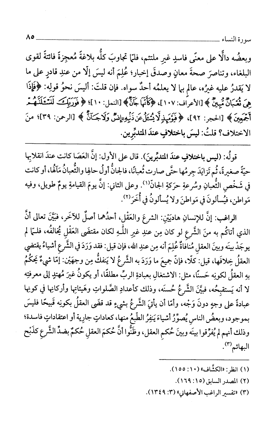 وبعضه دالاً على معنى فاسدٍ غير ملتئم، فلما تجاوب كله بلاغة معجزةً فائتةً لقوى البلغاء، وتناصر صحة معانٍ وصدق إخبار، علم أنه ليس إلا من عند قادر على ما لا يقدر عليه غيره، عالم بما لا يعلمه أحد سواه. فإن قلت: أليس نحو قوله: (فَإِذا هِيَ ثُعْبانٌ مُبِينٌ) [الأعراف: 107]، (كَأَنَّها جَانٌّ) [النمل: 10]؛ (فَوَ رَبِّكَ لَنَسْئَلَنَّهُمْ أَجْمَعِينَ) [الحجر: 92]، (فَيَوْمَئِذٍ لا يُسْئَلُ عَنْ ذَنْبِهِ إِنْسٌ وَلا جَانٌّ) [الرحمن: 39]؛ من الاختلاف؟ قلت: ليس باختلافٍ عند المتدبرين.