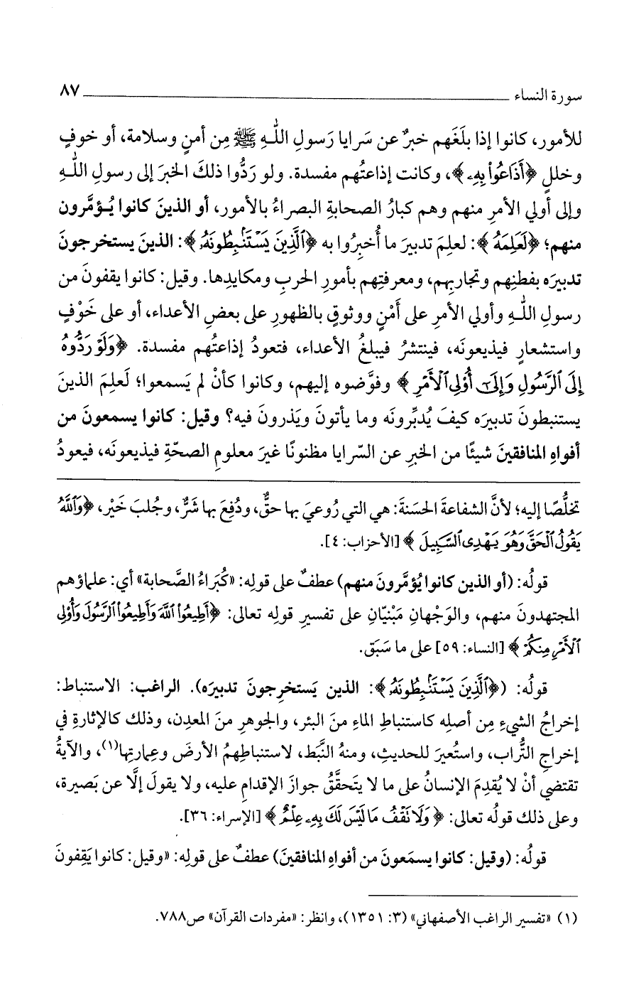 قوله: ((الَّذِينَ يَسْتَنبِطُونَهُ): الذين يستخرجون تدبيره). الراغب: الاستنباط: خرج الشيء من أصله كاستنباط الماء من البئر، والجوهر من المعدن، وذلك كالإثارة في خرج التراب، واستعير للحديث، ومنه النبط، لاستنباطهم الأرض وعمارتها، والآية تقتضي أن لا يقدم الإنسان على ما لا يتحقق جواز الإقدام عليه، ولا يقول إلا عن بصيرة، وعلى ذلك قوله تعالى: (ولا تَقْفُ مَا لَيْسَ لَكَ بِهِ عِلْمٌ) [الإسراء: 36].