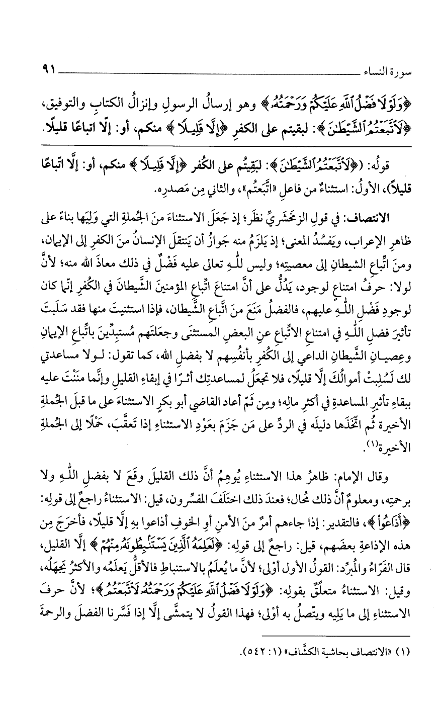 الانتصاف: في قول الزمخشري نظر؛ إذ جعل الاستثناء من الجملة التي وليها بناءً على ظاهر الإعراب، ويفسد المعنى؛ إذ يلزم منه جواز أن ينتقل الإنسان من الكفر إلى الإيمان، ومن إتباع الشيطان إلى معصيته؛ وليس لله تعالى عليه فضلٌ في ذلك معاذ الله منه؛ لأن لولا: حرف امتناعٍ لوجود، يدل على أن امتناع إتباع المؤمنين الشيطان في الكفر إنما كان لوجود فضل الله عليهم، فالفضل منع من إتباع الشيطان، فإذا استثنيت منها فقد سلبت تأثير فضل الله في امتناع الإتباع عن البعض المستثنى وجعلتهم مستبدين بإتباع الإيمان وعصيان الشيطان الداعي إلى الكفر بأنفسهم لا بفضل الله، كما تقول: لولا مساعدتي لك لسلبت أموالك إلا قليلاً، فلا تجعل لمساعدتك أثراً في إبقاء القليل وإنما مننت عليه ببقاء تأثير المساعدة في أكثر ماله؛ ومن ثم أعاد القاضي أبو بكرٍ الاستثناء على ما قبل الجملة الأخيرة ثم اتخذها دليله في الرد على من جزم بعود الاستثناء إذا تعقب، حملاً إلى الجملة الأخيرة.