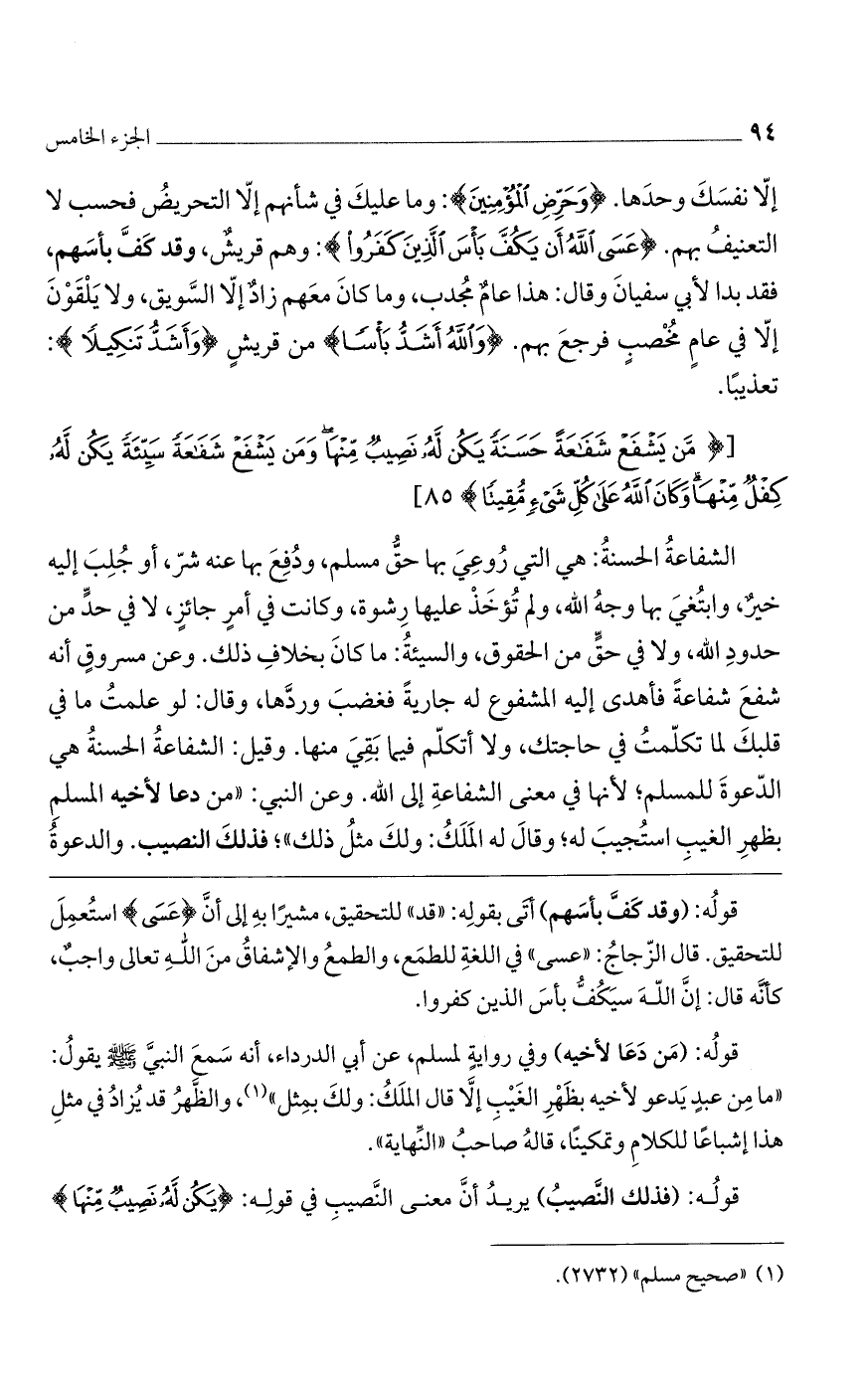 الشفاعة الحسنة: هي التي روعي بها حق مسلم، ودفع بها عنه شر، أو جلب إليه خير، وابتغي بها وجه اللَّه، ولم تؤخذ عليها رشوة، وكانت في أمرٍ جائزٍ، لا في حدّ من حدود اللَّه، ولا في حق من الحقوق، والسيئة: ما كان بخلاف ذلك. وعن مسروقٍ أنه شفع شفاعة فأهدى إليه المشفوع جاريةً فغضب وردها، وقال: لو علمت ما في قلبك لما تكلمت في حاجتك، ولا أتكلم فيما بقي منها. وقيل: الشفاعة الحسنة هي الدعوة للمسلم، لأنها في معنى الشفاعة إلى اللَّه. وعن النبي: «من دعا لأخيه المسلم بظهر الغيب استجيب له؛ قال له الملك: ولك مثل ذلك» فذلك النصيب. والدعوة