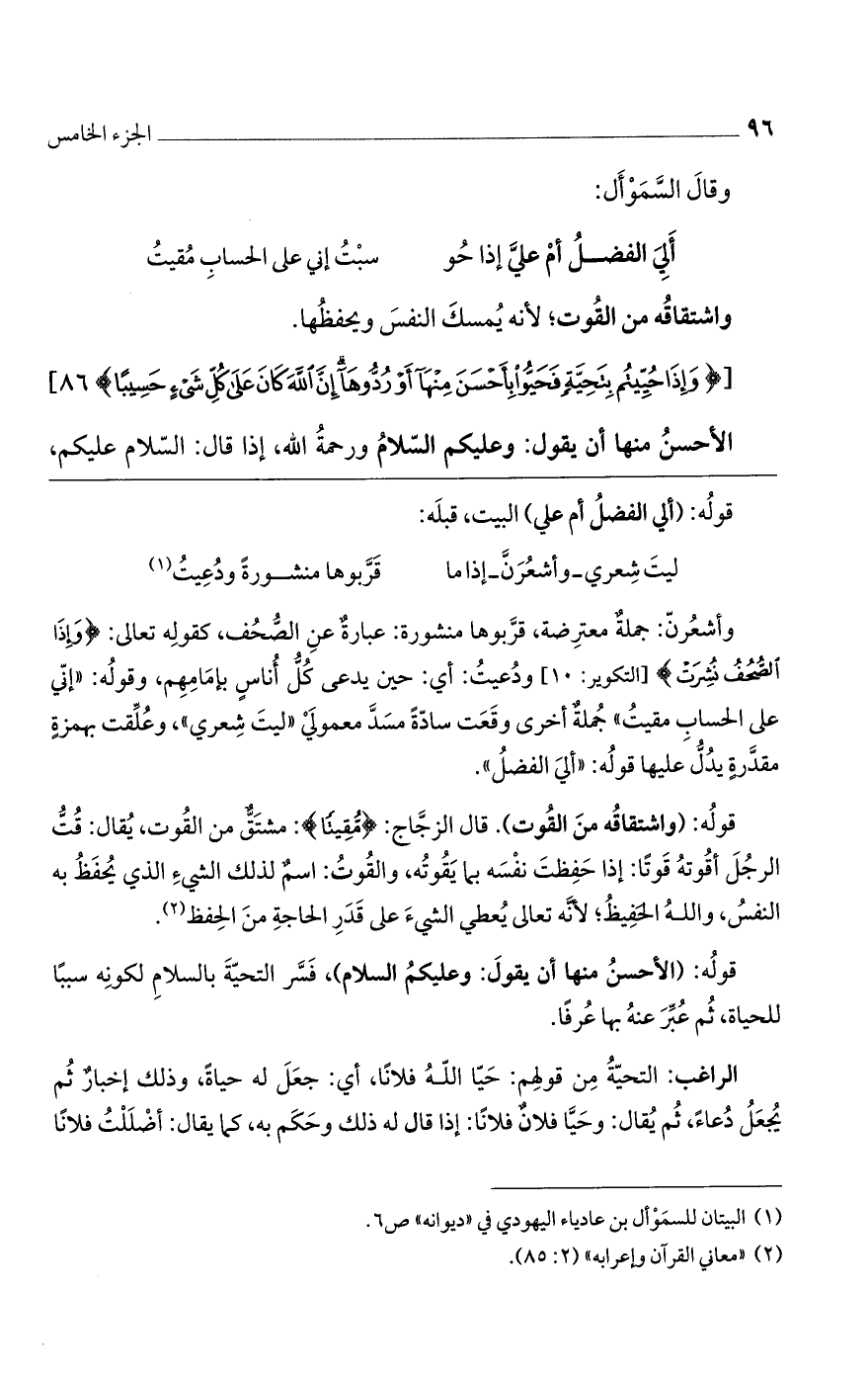 قوله: (واشتقاقه من القوت). قال الزجاج: (مُّقِيتًا): مشتقٌ من القوت، يقال: قت الرجل أقوته قوتاً: إذا حفظت نفسه بما يقوته، والقوت: اسم لذلك الشيء الذي يحفظ به النفس، والله الحفيظ؛ لأنه تعالى يعطي الشيء على قدر الحاجة من الحفظ.