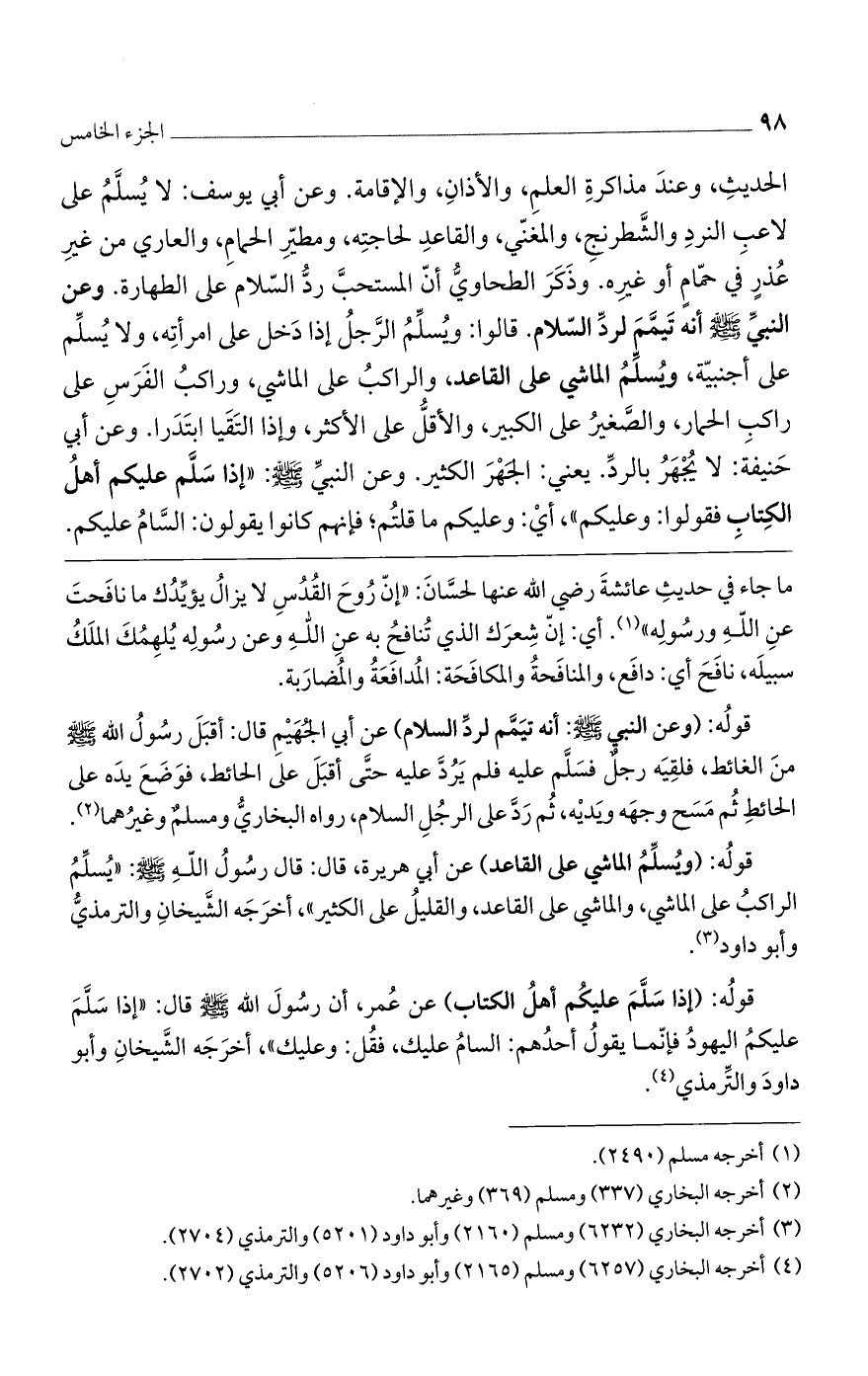 قوله: (ويسلم الماشي على القاعد) عن أبي هريرة، قال: قال رسول الله صلى الله عليه وسلم: ((يسلم الراكب على الماشي، والماشي على القاعد، والقليل على الكثير))، أخرجه الشيخان والترمذي وأبو داود.