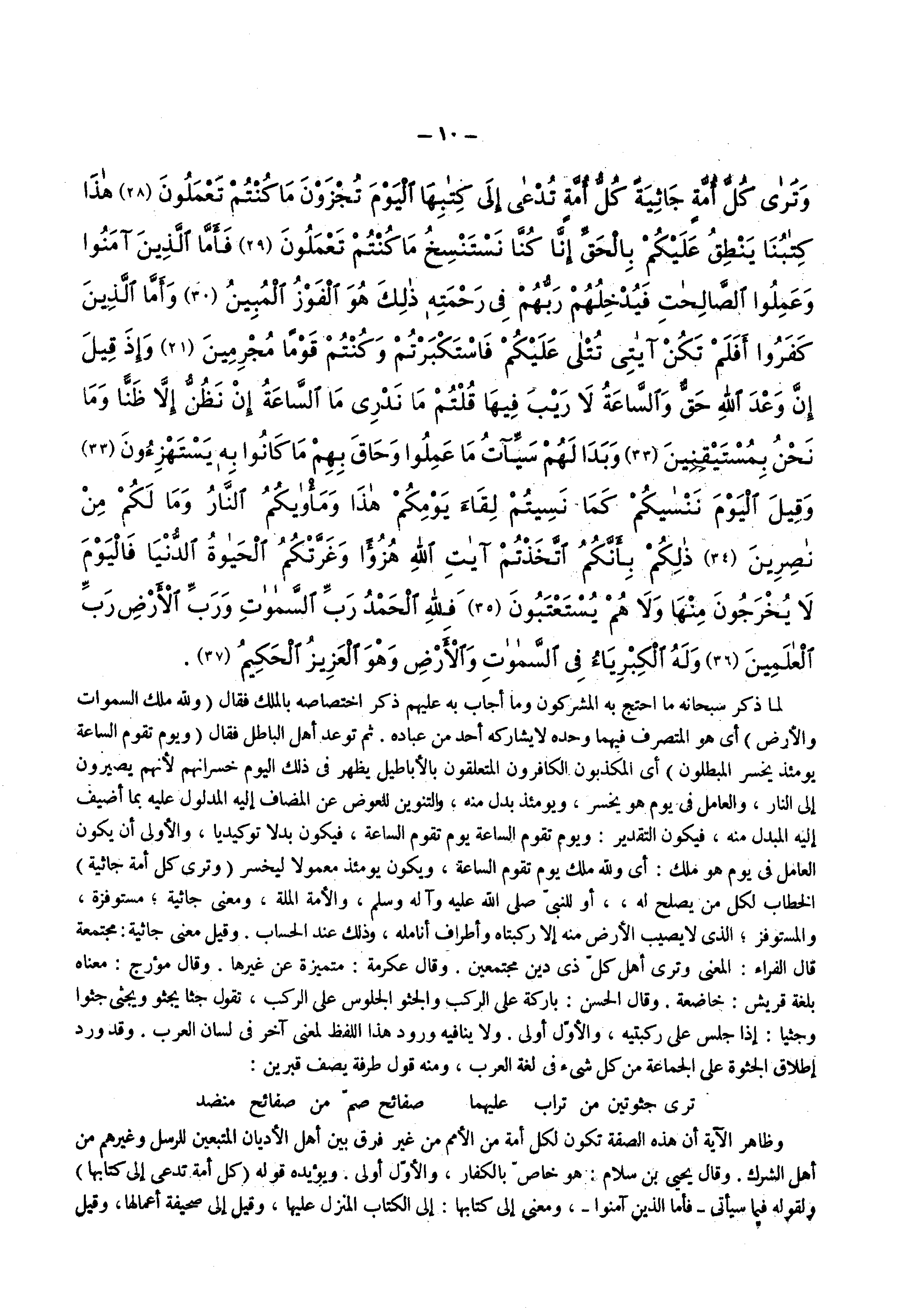 ( وترى كل أمة جاثية ) الخطاب لكل من يصلح له أو للنبي الله ( صلى الله عليه وسلم ) والأمة الملة ومعنى جاثية مستوفزة والمستوفز الذي لا يصيب الأرض منه إلا ركبتاه وأطراف أنامله وذلك عند الحساب وقيل معنى جاثية مجتمعة قال الفراء المعنى وترى أهل كل ذي دين مجتمعين وقال عكرمة متميزة عن غيرها وقال مؤرخ معناه بلغة قريش خاضعة وقال الحسن باركه على الركب والجثو والجلوس على الركب تقول جثا يجثو ويجثى جثيا وجيثا إذا جلس على ركبتيه والأول أولى ولا ينافيه ورود اللفظ لمعنى آخر في لسان العرب وقد ورد إطلاق الجثوة على الجماعة من كل شئ في لغة العرب ومنه قوله طرفة يصف قبرين ترى جثوتين من تراب عليهما