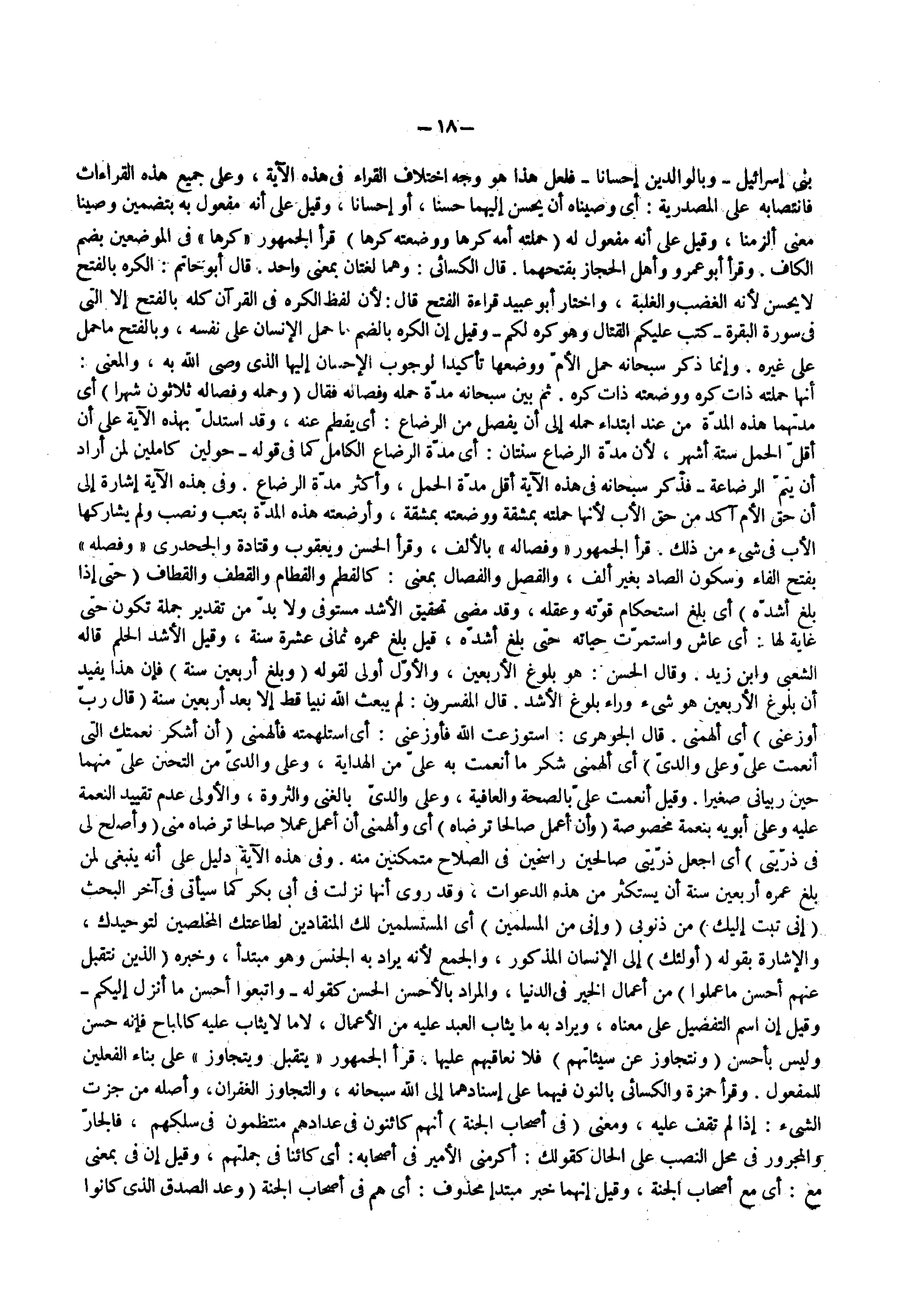 بني إسرائيل وبالوالدين إحسانا فلعل هذه هو وجه اختلاف القراء في هذه الاية وعلى جميع هذه القراءات فانتصابه على المصدرية أي وصيناه أن يحسن إليهما حسنا أو إحسانا وقيل على أنه مفعول به بتضمين وصينا معنى ألزمنا وقيل على أنه مفعول له ( حملته أمه كرها ووضعته كرها ) قرأ الجمهور ( كرها ) في الموضعين بضم الكاف وقرأ أبو عمرو وأهل الحجاز بفتحهما قال الكسائى وهما لغتان بمعنى واحد قال أبو حاتم الكره بالفتح لا يحسن لأنه الغضب والغلبة واختار أبو عبيد قراءة الفتح قال لأن لفظ الكره في القرآن كله بالفتح إلا التي في سورة البقرة كتب عليكم القتال وهو كره لكم وقيل أن الكره بالضم ما حمل الإنسان على نفسه وبالفتح ما حمل على غيره وإنما ذكر سبحانه حمل الأم ووضعها تأكيدا لوجوب الإحسان إليها الذي وصى الله به والمعنى أنها حملته ذات كره ووضعته ذات كره ثم بين سبحانه مدة حمله وفصاله فقال ( وحمله وفصاله ثلاثون شهرا ) أي مدتها هذه المدة من عند ابتداء حمله إلى أن يفصل من الرضاع أي يفطم عنه وقد استدل بهذ الآية على أن أقل الحمل ستة أشهر لأن مدة الرضاع سنتان أي مدة الرضاع الكامل كما قوله حولين كاملين لمن أراد أن يتم الرضاعة فذكر سبحانه في هذه الآية أقل مدة الحمل وأكثر مدة الرضاع وفي هذه الآية إشارة إلى أن حق الأم آكد من حق الأب لأنها حملته بمشقة ووضعته بمشقة وأرضعته هذه المدة بتعب ونصب ولم يشاركها الأب في شيء من ذلك قرأ الجمهور وفصاله بالألف وقرأ الحسن ويعقوب وقتادة والجحدرى ( وفصله ) بفتح الفاء وسكون الصاد بغير ألف والفصل والفصال بمعنى كالفطم والفطام والقطف والقطاف ( حتى إذا بلغ أشده ) أي بلغ استحكام قوته وعقله وقد مضى تحقيق الأشد مستوفى ولا بد من تقدير جملة تكون حتى غاية لها أي عاش واستمرت حياته حتى بلغ أشده قيل بلغ عمرة ثماني عشرة سنة وقيل الأشد الحلم قاله الشعبي وابن زيد وقال الحسن هو بلوغ الأربعين والأول أولى لقوله ( وبلغ أربعين سنة ) فإن هذا يفيد أن بلوغ الأربعين هو شيء وراء بلوغ الأشد قال المفسرون لم يبعث الله نبيا قط إلا بعد أربعين سنة ( قال رب أوزعني ) أي ألهمني قال الجوهري استوزعت الله فأوزعني أي أستلهمته فألهمني ( أن أشكر نعمتك التي أنعمت علي وعلى والدي ) أي الهمني شكر ما أنعمت به على من الهداية وعلى والدى من التحنن على منهما حين وبياني صغيرا وقيل أنعمت على بالصحة والعافية وعلى والدي بالغنى والثروة والأولى عدم تقييد النعمة عليه وعلى أبويه بنعمه مخصوصة ( وإن أعمل صالحا ترضاه ) أي والهمني أن أعمل عملا صالحا ترضاه منى ( وأصلح لى في ذريتي ) أي اجعل ذريتي صالحين راسخين في الصلاح متمكنين منه وفي هذه الآية دليل على أنه ينبغي لمن بلغ عمره أربعين سنة أن يستكثر من هذه الدعوات وقد روى أنها نزلت في أبي بكر كما سيأتي في آخر البحث ( أني تبت إليك ) من ذنوبي ( وإني من المسلمين ) أي المستسلمين لك المنقادين لطاعتك المخلصين لتوحيدك