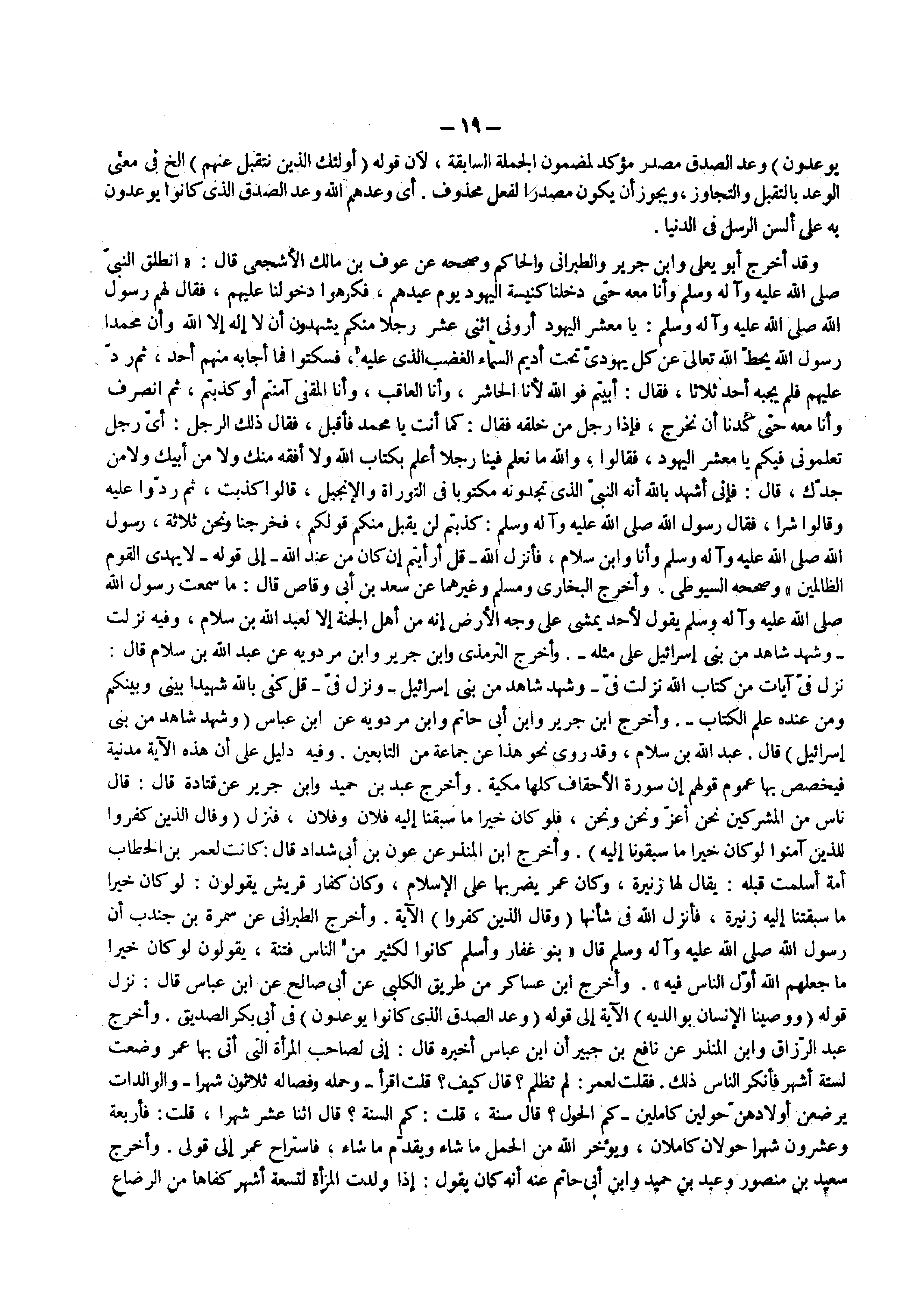وقد أخرج أبو يعلي وابن جرير والطبراني والحاكم وصححه عن عوف بن مالك الأشجعي قال أنطلق النبي ( صلى الله عليه وسلم ) وأنا معه حتى دخلنا كنيسة اليهود يوم عيدهم فكرهوا دخولنا عليهم فقال لهم رسول الله ( صلى الله عليه وسلم ) يا معشر اليهود أروني اثني عشر رجلا منكم يشهدون أن لا إله إلا الله وأن محمدا رسول الله يحط الله تعالى عن كل يهودي تحت أديم السماء الغضب الذي عليه فسكتوا فما أجابه منهم أحد ثم رد عليهم فلم يجبه أحد ثلاثا فقال أبيتم فوالله لأنا الحاشر وأنا العاقب وأنا المقفي آمنتم أو كذبتم ثم أنصرف وأنا معه حتى كدنا أن نخرج فإذا رجل من خلفه فقال كما أنت يا محمد فأقبل فقال ذلك الرجل أي رجل تعلموني فيكم يا معشر اليهود فقالوا والله ما نعلم فينا رجلا أعلم بكتاب الله ولا أفقه منك ولا من أبيك ولا من جدك قال فإنى أشهد بالله أنه النبي الذي تجدونه مكتوبا في التوراة والإنجيل قالوا كذبت ثم ردوا عليه وقالوا شرا فقال رسول الله ( صلى الله عليه وسلم ) كذبتم لن يقبل منكم قولكم فخرجنا ونحن ثلاثة رسول الله ( صلى الله عليه وسلم ) وأنا وابن سلام فأنزل الله قل أرأيتم إن كان من عند الله إلى قوله لا يهدي القوم الظالمين وصححه السيوطي وأخرج البخاري ومسلم وغيرهما عن سعد بن أبي وقاص قال ما سمعت رسول الله ( صلى الله عليه وسلم ) يقول لأحد يمشي على وجه الأرض إنه من أهل الجنة إلا لعبد الله بن سلام وفيه نزلت وشهد شاهد من بني إسرائيل على مثله وأخرج الترمذي وابن جرير وابن مردويه عن عبد الله بن سلام قال نزل في آيات من كتاب الله نزلت في وشهد شاهد من بني إسرائيل ونزل في قل كفى بالله شهيدا بيني وبينكم ومن عنده علم الكتاب وأخرج ابن جرير وابن أبي حاتم وابن مردويه عن ابن عباس ( وشهد شاهد من بني إسرائيل ) قال عبد الله بن سلام وقد روى نحو هذا عن جماعة من التابعين وفيه دليل على أن هذه الآية مدنية فيخصص بها عموم قولهم إن سورة الأحقاف كلها مكية وأخرج عبد بن حميد وأبن جرير عن قتادة قال قال ناس من المشركين نحن أعز ونحن ونحن فلو كان خيرا ما سبقنا إليه فلان وفلان فنزل ( وقال الذين كفروا للذين امنوا لو كان خيرا ما سبقونا إليه ) وأخرج ابن المنذر عن عون عن أبي شداد قال كانت لعمر بن الخطاب أمة أسلمت قبله يقال لها زنيرة وكان عمر يضربها على الإسلام وكان كفار قريش يقولون لو كان خيرا ما سبقتنا إليه زنيرة فأنزل الله في شأنها ( وقال الذين كفروا ) الآية وأخرج الطبراني عن سمرة بن جندب أن رسول الله ( صلى الله عليه وسلم ) قال بنو غفار وأسلم كانوا لكثير من الناس فتنة يقولون لو كان خيرا ما جعلهم الله أول الناس فيه ) وأخرج ابن عساكر من طريق الكلبي عن أبي صالح عن ابن عباس قال نزل قوله ووصينا الإنسان بوالديه الآية إلى قوله ( وعد الصدق الذي كانوا يوعدون ) في أبي بكر الصديق وأخرج عبد الرزاق وابن المنذر عن نافع بن جبير أن ابن عباس أخبره قال إني لصاحب المرأة التي أتى بها عمر وضعت لستة أشهر فأنكر الناس ذلك فقلت لعمر لم تظلم قال كيف قلت أقرأ وحمله وفصاله ثلاثون شهرا والوالدات يرضعن أولادهن حولين كاملين كم الحول قال سنة قلت كم السنة قال اثنا عشر شهرا قلت فأربعة وعشرون شهرا حولان كاملان ويؤخر الله من الحمل ما شاء ويقدم ما شاء فاستراح عمر إلى قولي وأخرج سعيد بن منصور وعبد بن حميد وابن أبي حاتم عنه أنه كان يقول إذا ولدت المرأة لتسعة أشهر كفاها من الرضاع
