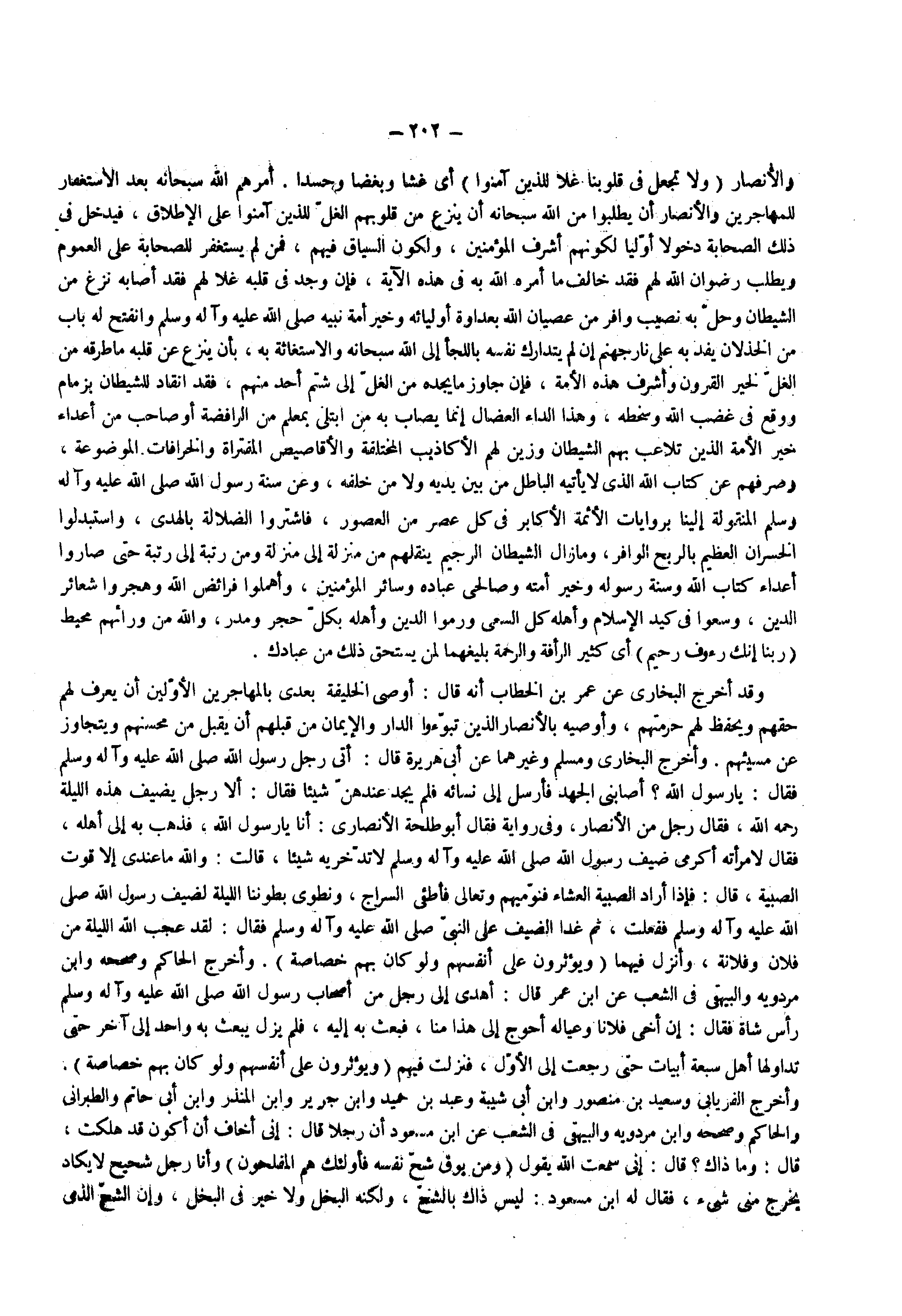 وقد أخرج البخاري عن عمر بن الخطاب إنه قال أوصى الخليفة بعدي بالمهاجرين الأولين أن يعرف لهم حقهم ويحفظ لهم حرمتهم وأوصيه بالأنصار الذين تبوؤوا الدار والإيمان من قبلهم أن يقبل من محسنهم ويتجاوز عن مسيئهم وأخرج البخاري ومسلم وغيرهما عن أبي هريرة قال أتى رجل رسول الله ( صلى الله عليه وسلم ) فقال يا رسول الله أصابني الجهد فأرسل إلى نسائه فلم يجد عندهن شيئا فقال ألا رجل يضيف هذه الليلة رحمه الله فقال رجل من الأنصار وفي رواية فقال أبو طلحة الأنصاري أنا يا رسول الله فذهب به إلى أهله فقال لأمرأته اكرمي ضيف رسول الله ( صلى الله عليه وسلم ) لا تدخريه شيئا قالت والله ما عندي إلا قوت الصبية قال فإذا أراد الصبية العشاء فنوميهم وتعالى فأطفئي السراج ونطوي بطوننا الليلة لضيف رسول الله ( صلى الله عليه وسلم ) ففعلت ثم غدا الضيف على النبي ( صلى الله عليه وسلم ) فقال لقد عجب الله الليلة من فلان وفلانة وأنزل فيهما ( ويؤثرون على أنفسهم ولو كان بهم خصاصة ) وأخرج الحاكم وصححه ابن مردويه والبيهقي في الشعب عن ابن عمر قال أهدى إلي رجل من أصحاب رسول الله ( صلى الله عليه وسلم ) رأس شاة فقال إن أخي فلانا وعياله أحوج إلى هذا منا فبعث به إليه فلم يزل يبعث به واحد إلى آخر حتى تداولها أهل سبعة أبيات حتى رجعت إلى الأول فنزلت فيهم ( ويؤثرون على أنفسهم ولو كان بهم خصاصة ) وأخرج الفريابي وسعيد بن منصور وابن أبي شيبة وعبد بن حميد وابن جرير وابن المنذر وابن أبي حاتم والطبراني والحاكم وصححه وابن مردويه والبيهقي في الشعب عن ابن مسعود أن رجلا قال إني أخاف أن أكون قد هلكت قال وما ذاك قال إني سمعت الله يقول ( ومن يوق شح نفسه فأولئك هم المفلحون ) وأنا رجل شحيح لا يكاد يخرج مني شيء فقال له أبن مسعود ليس ذاك بالشح ولكنه البخل ولا خير في البخل وإن الشح الذي