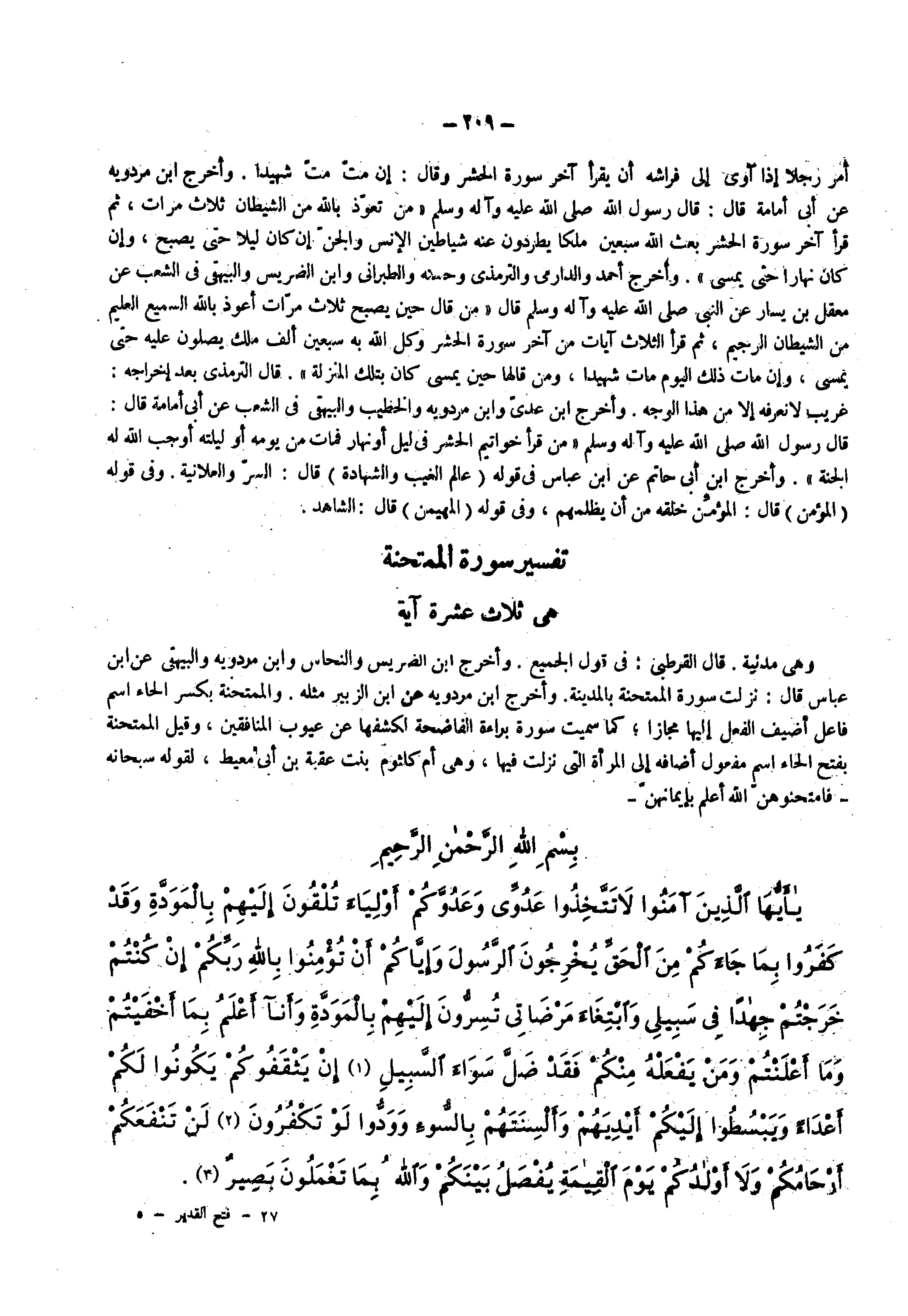 وهي مدنية قال القرطبي في قول الجميع وأخرج ابن الضريس والنحاس وابن مردويه والبيهقي عن ابن عباس قال نزلت سورة الممتحنة بالمدينة وأخرج ابن مردويه عن ابن الزبير مثله والممتحنة بكسر الحاء اسم فاعل أضيف الفعل إليها مجازا كما سميت سورة براءة الفاضحة لكشفها عن عيوب المنافقين وقيل الممتحنة بفتح الحاء اسم مفعول أضافه إلى المرأة التي نزلت فيها وهي أم كلثوم بنت عقبة بن أبي معيط لقوله سبحانه فامتحنوهن الله أعلم بإيمانهن
