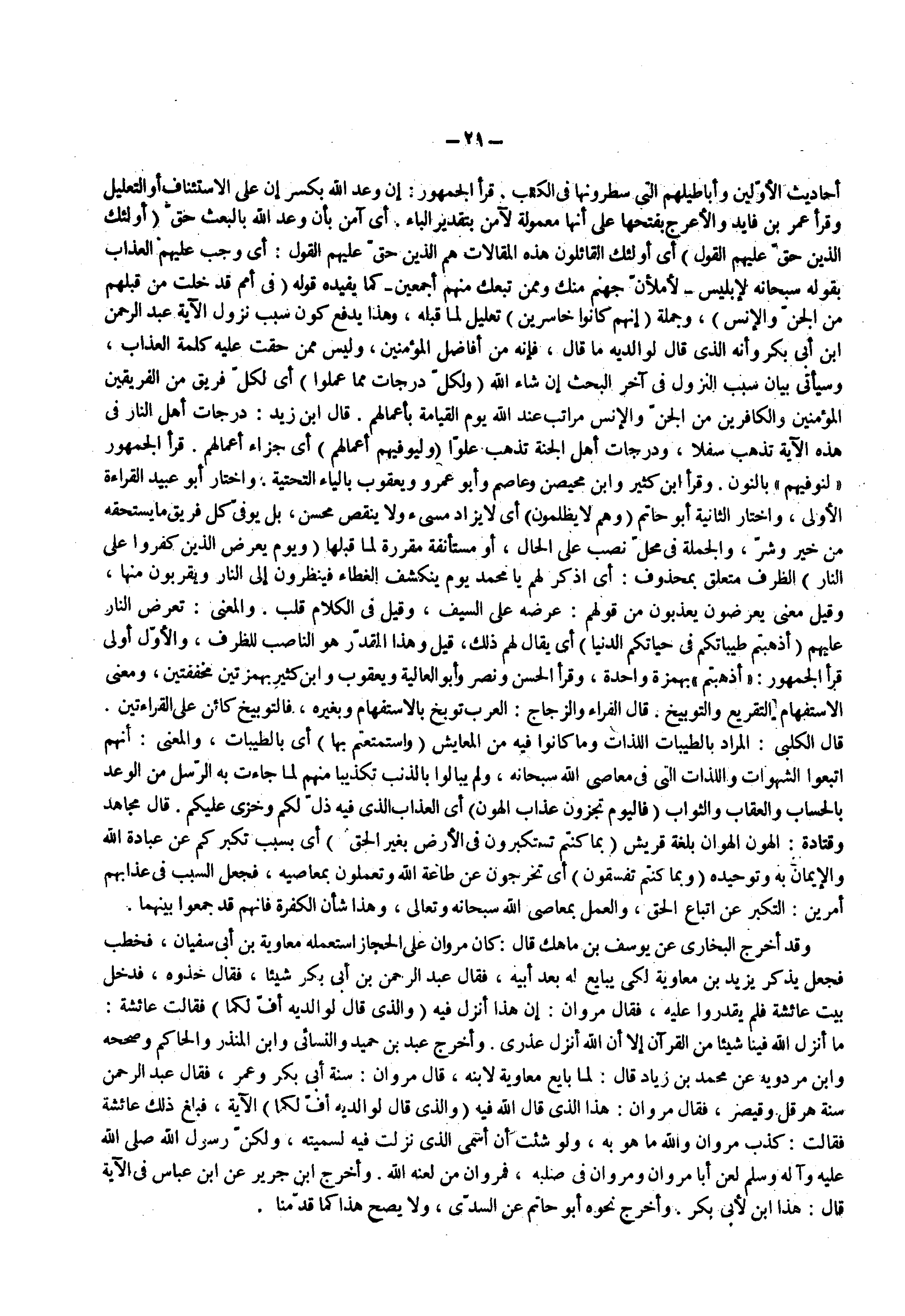 وقد أخرج البخاري عن يوسف بن ماهك قال كان مروان على الحجاز استعمله معاوية بن أبي سفيان فنخطف فجعل يذكر يزيد بن معاوية لكي يبايع له بعد أبيه فقال عبد الرحمن بن أبي بكر شيئا فقال خذوه فدخل بيت عائشة فلم يقدوا عليه فقال مروان إن هذا أنزل فيه ( والذي قال لوالديه أف لكما ) فقالت عائشة ما أنزل الله فينا شيئا من القرآن إلا أن الله أنزل عذري وأخرج عبد بن حميد والنسائي وابن المنذر والحاكم وصححه وا بن مردويه عن محمد بن زياد قال لما بايع معاوية لابنه قال مروان سنة أبي بكر وعمر فقال عبد الرحمن سنة هرقل وقيصر فقال مروان هذا الذي قال الله فيه ( والذي قال لوالديه أف لكما ) الاية فبلغ ذلك عائشة فقالت كذب مروان والله ما هو به ولو شئت أن أسمى الذي نزلت فيه لسميته ولكن رسول الله ( صلى الله عليه وسلم ) لعن أبا مروان في صلبه مروان من لعنه الله وأخرج ابن جرير عن ابن عباس في الآية قال هذا ابن لأبي بكر وأخرج نحوه أبو حاتم عن السدى ولا يصح هذا كما قدمنا