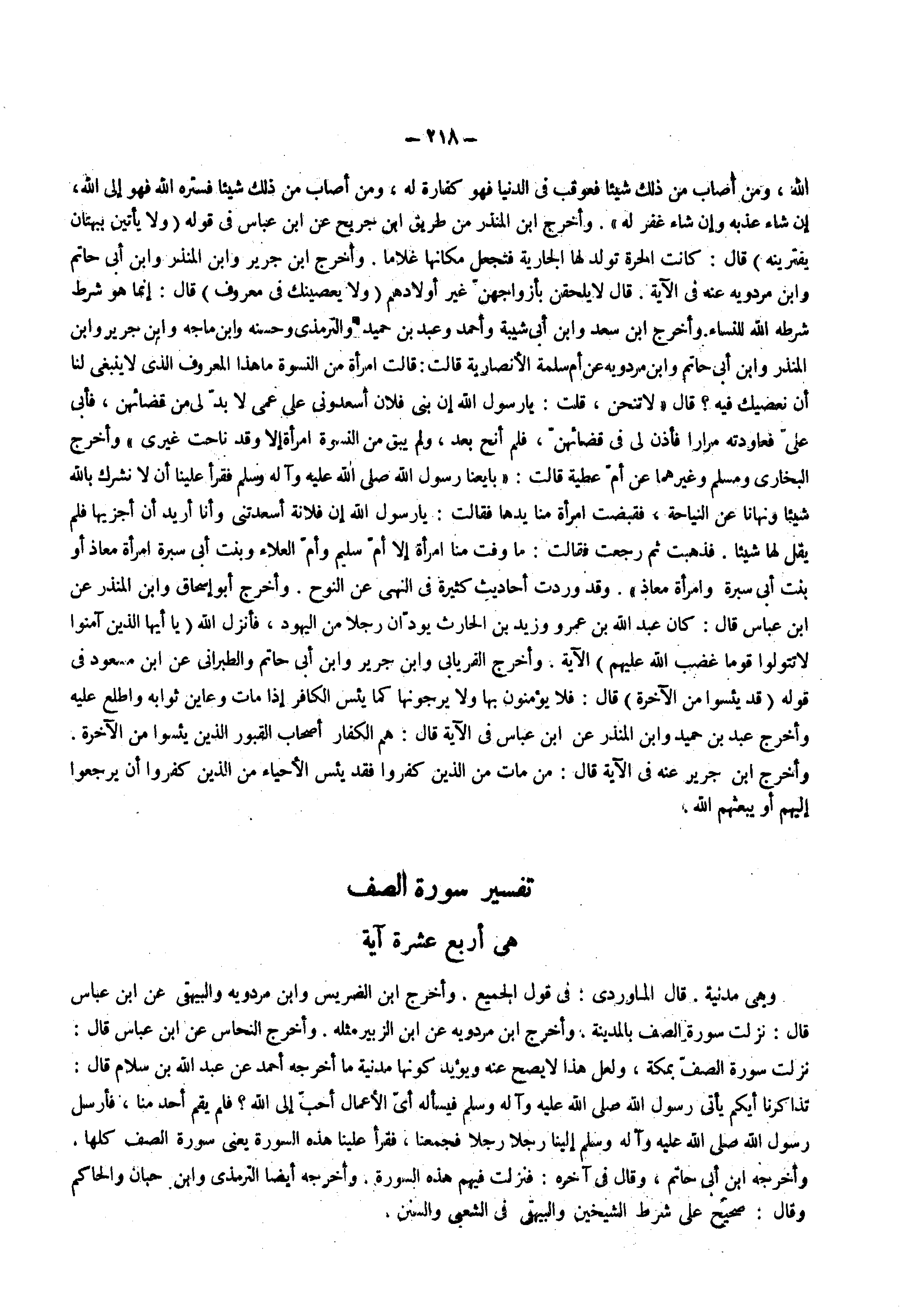 وهي مدنية قال الماوردي في قول الجميع وأخرج ابن الضريس وابن مردويه والبيهقي عن ابن عباس قال نزلت سورة الصف بالمدينة وأخرج ابن مردويه عن ابن الزبير مثله وأخرج النحاس عن ابن عباس قال نزلت سورة الصف بمكة ولعل هذا لا يصح عنه ويؤيد كونها مدنية ما أخرجه أحمد عن عبد الله بن سلام قال تذاكرنا أيكم يأتي رسول الله ( صلى الله عليه وسلم ) فيسأله أي الأعمال أحب إلى الله فلم يقم أحد منا فأرسل رسول الله ( صلى الله عليه وسلم ) إلينا رجلا رجلا فجمعنا فقرأ علينا هذه السورة يعنى سورة الصف كلها وأخرجه ابن أبي حاتم وقال في آخره فنزلت فيهم هذه السورة وأخرجه أيضا الترمذي وابن حبان والحاكم وقال صحيح على شرط الشيخين والبيهقي في الشعبي والسنن