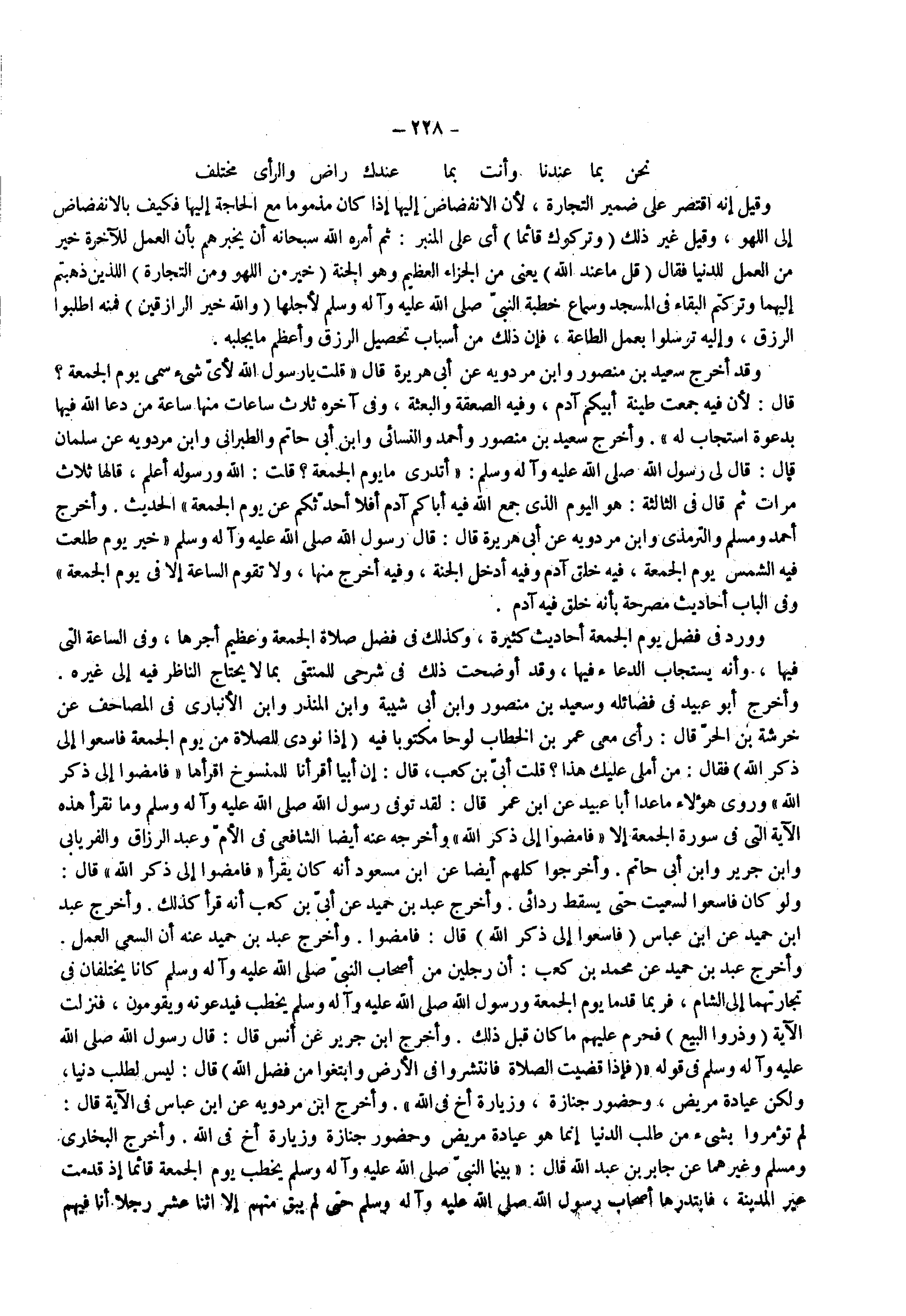 وقد اخرج سعيد بن منصور وأبن مردويه عن أبي هريرة قال قلت يا رسول الله لأي شيء سمى يوم الجمعة قال لأن فيه جمعت طينة أبيكم آدم وفيه الصعقة والبعثة وفي آخره ثلاث ساعات منها ساعة من دعا الله فيها بدعوة أستجاب له وأخرج سعيد بن منصور وأحمد والنسائي وأبن أبي حاتم والطبرا ني وأبن مردويه عن سلمان قال قال لي رسول الله صلى الله عليه وإله وسلم أتدري ما يوم الجمعة قلت الله ورسوله أعلم قالها ثلاث مرات ثم قال في الثالثة هو اليوم الذي جمع الله فيه أباكم آدم أفلا أحدثكم عن يوم الجمعة الحديث وأخرج أحمد ومسلم والترمذي وابن مردويه عن أبي هريرة قال قال رسول الله صلى الله عليه وإله وسلم خير يوم طلعت فيه الشمس يوم الجمعة فيه خلق آدم وفيه أدخل الجنة وفيه اخرج منها ولا تقوم الساعة إلا في يوم الجمعة وفي الباب أحاديث مصرحة بأنه خلق فيه آدم وورد في فضل يوم الجمعة أحاديث كثيرة وكذلك في فضل صلاة الجمعة وعظيم أجرها وفي الساعة التي فيها وأنه يستجاب الدعاء فيها وقد أوضحت ذلك في شرحي للمنتقى بما لا يحتاج الناظر فيه إلى غيره وأخرج أبو عبيدة في فضائله وسعيد بن منصور وابن أبي شيبة بن المنذر أبن الأنباري في المصاحف عن خرشة بن الحر قال رأي معى عمر بن الخطاب لوحا مكتوبا فيه ( إذا نودي للصلاة من يوم الجمعة فاسعوا إلى ذكر الله ) فقال من املى عليك هذا قلت أبي بن كعب قال إن أبيا أقرأنا للمنسوخ أقرأها فأمضوا إلى ذكر الله وروى هؤلاء ما عدا أبا عبيد عن أبن عمر قال لقد توفي رسول الله صلى الله عليه وإله وسلم وما نقرأ هذه الآية التي في سورة الجمعة إلا فامضوا إلى ذكر الله وأخرجه عنه ايضا الشافعي في الأيام وعبد الرزاق والفريابي وأبن جرير وأبن أبي حاتم وأخرجوا كلهم أيضا عن أبن مسعود أنه كان يقرا فامضوا إلى ذكر الله قال ولو كان فاسعوا لسعيت حتى يسقط ردائي وأخرج عبد بن حميد عن أبي بن كعب أنه قرأ كذلك واخرج عبد أبن حميد عن أبن عباس ( فاسعوا إلى ذكر الله ) قال فامضوا وأخرج عبد بن حميد عنه أن السعي العمل وأخرج عبد بن حميد عن محمد بن كعب أن رجلين من اصحاب النبي صلى الله عليه وإله وسلم كانا يختلفان في تجارتهما إلى الشام فربما قدما يوم الجمعة ورسول الله صلى الله عليه وإله وسلم يخطب فيدعونه ويقومون فنزلت الآية ( وذروا البيع ) فحرم عليهم ما كان قبل ذلك وأخرج أبن جرير عن أنس قال قال رسول الله صلى الله عليه وإله وسلم في قوله فإذا قضيت الصلاة فانتشروا في الأرض وابتغوا من فضل الله قال ليس الطلب دنبا ولكن عيادة مريض وحضور جنازة وزيارة أخ في الله وأخرج أبن مردويه عن ابن عباس في الآية قال لم تؤمروا بشيء من طلب الدنيا إنما هو عيادة مريض وحضور جنازة وزيارة أخ في الله واخرج البخاري ومسلم وغيرهما عن جابر عن عبد الله قال بينما النبي صلى الله عليه وإله وسلم يخطب يوم الجمعة قائما إذا قدمت عير المدينة فابتدرها أصحاب رسول الله صلى الله عليه وإله وسلم حتى لم يبق منهم إلا اثنا عشر رجلا منهم أنا فيهم