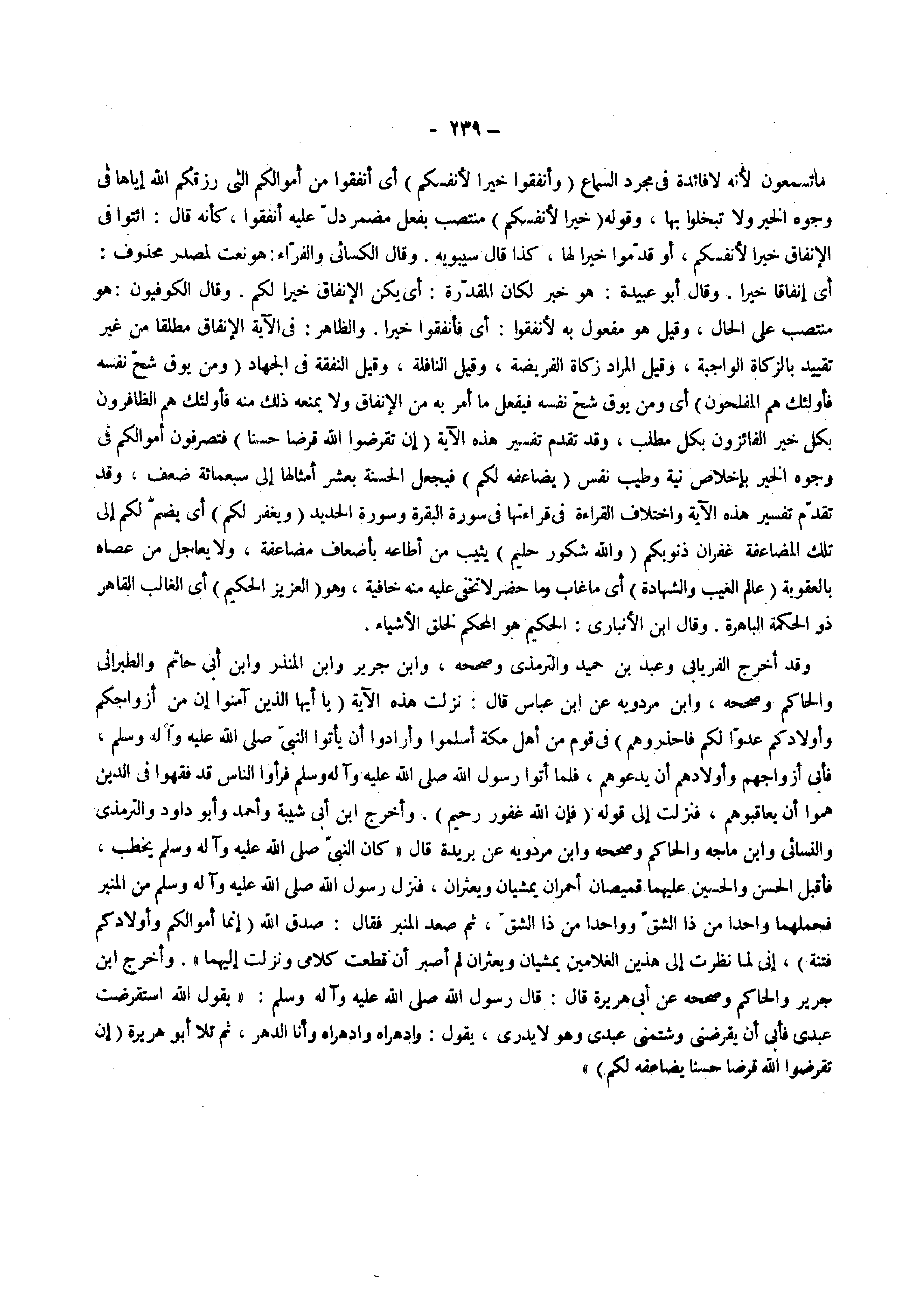 وقد أخرج الفريابي وعبد بن حميد والترمذي وصححه وابن جرير وابن المنذر وابن أبي حاتم والطبراني والحاكم وصححه وابن مردويه عن ابن عباس قال نزلت هذه الآية ) يا أيها الذين آمنوا إن من أزواجكم وأولادكم عدوا لكم فاحذروهم ( في قوم من أهل مكة أسلموا وأرادوا أن يأتوا النبي ( صلى الله عليه وسلم ) فأبى أزواجهم وأولادهم أن يدعوهم فلما أتوا رسول الله ( صلى الله عليه وسلم ) فرأوا الناس قد فقهوا في الدين هموا أن يعاقبوهم فنزلت إلى قوله ) فإن الله غفور رحيم ( وأخرج ابن أبي شيبة وأحمد وأبو داود والترمذي والنسائي وابن ماجة والحاكم وصححه وابن مردويه عن بريدة قال كان النبي ( صلى الله عليه وسلم ) يخطب فأقبل الحسن والحسين عليهما قميصان أحمران يمشيان ويعثران فنزل رسول الله ( صلى الله عليه وسلم ) من المنبر فحملهما واحدا من ذا الشق وواحدا من ذا الشق ثم صعد المنبر فقال صدق الله ) أنما أموالكم وأولادكم فتنة ( إني لما نظرت إلى هذين الغلامين يمشيان ويعثران لم أصبر أن قطعت كلامي ونزلت إليهما وأخرج ابن جرير والحاكم وصححه عن أبي هريرة قال قال رسول الله ( صلى الله عليه وسلم ) يقول الله استقرضت عبدي فأبى أن يقرضني وشتمني عبدي وهو لا يدري يقول وادهراه وادهراه وأنا الدهر ثم تلا أبو هريرة ( إن تقرضوا الله قرضا حسنا يضاعفه لكم )
