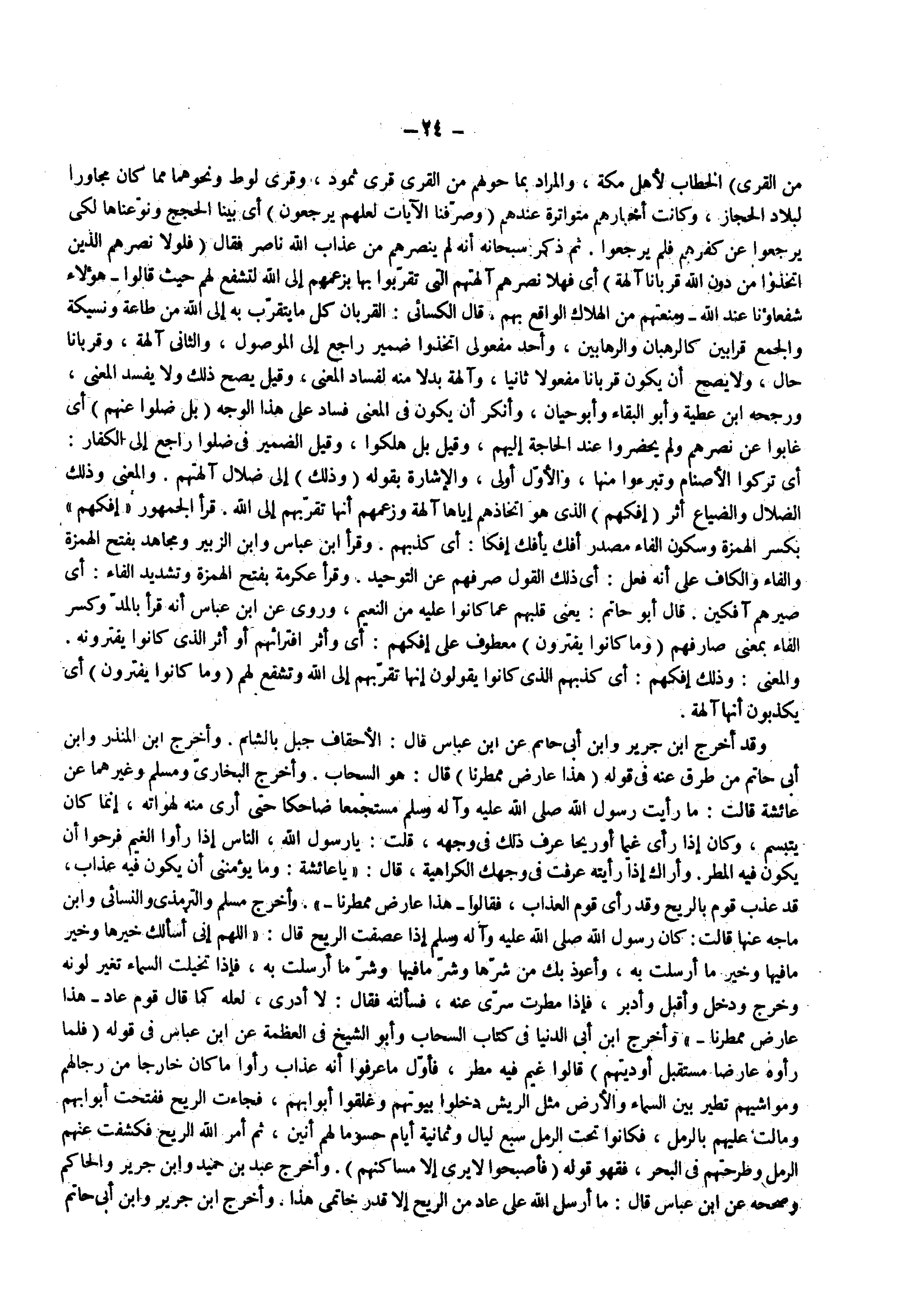 وقد أخرج ابن جرير وابن أبي حاتم عن ابن عباس قال الأحقاف جبل بالشام وأخرج ابن المنذر وابن أبي حاتم من طرق عنه في قوله ( هذا عارض ممطرنا ) قال هو السحاب وأخرج البخاري ومسلم وغيرهما عن عائشة قالت ما رأيت رسول الله ( صلى الله عليه وسلم ) مستجمعا ضاحكا حتى أرى منه لهواته إنما كان يتبسم وكان إذا رأى غيما أو ريحا عرف ذلك في وجهه قلت يا رسول الله الناس إذا رأو الغيم فرحوا أن يكون فيه المطر وأراك إذا رأيته عرفت في وجهك الكراهية قال يا عائشة وما يؤمنني أن يكون فيه عذاب قد عذب قوم بالريح وقد رأى قوم العذاب فقالوا هذا عارض ممطرنا وأخرج مسلم والترمذي والنسائي وابن ماجه عنها قالت كان رسول الله ( صلى الله عليه وسلم ) إذا عصفت الريح قال اللهم أني أسألك خيرها وخير ما فيها وخير ما أرسلت به وأعوذ بك من شرها وشر ما فيها وشرح أرسلت به فإذا تخيلت السماء تغير لونه وخرج ودخل وأقبل وأدبر فإذا مطرت سرى عنه فسألته فقال لا أدري لعله كما قال قوم عاد هذا عارض ممطرنا وأخرج ابن أبي الدنيا في كتاب السحاب وأبو الشيخ في العظمة عن ابن عباس في قوله ( فلما رأوه عارضا مستقبل أوديتهم ) قالو غيم فيه مطر فأول ما عرفوا أنه عذاب رأوا ما كان خارجا من رجالهم ومواشيهم تطير بين السماء والأرض مثل الريش دخلوا بيوتهم وغلقوا أبوابهم فجاءت الريح ففتحت أبوابهم ومالت عليهم بالرمل فكانوا تحت الرمل سبع ليال وثمانية أيام حسوما مالهم أنين ثم أمر الله الريح فكشفت عنهم الرمل وطرحتهم في البحر فقه قوله ( فأصبحوا لا يرى إلا مساكنهم ) وأخرج عبد بن حميد وابن جرير والحاكم وصححه عن ابن عباس قال ما أرسل الله على عاد من الريح إلا قدر خاتمي هذا وأخرج ابن جرير وابن أبي حاتم