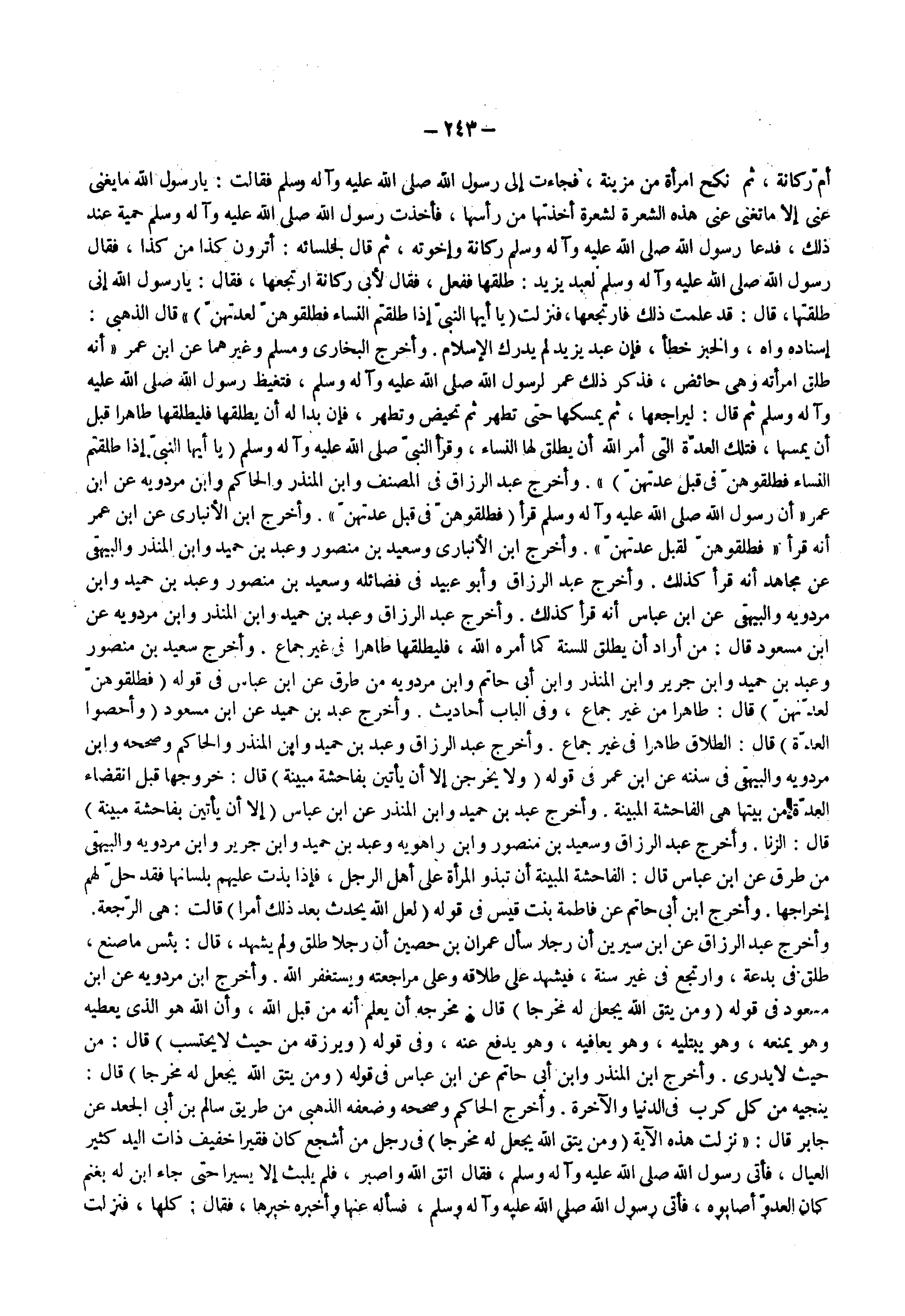 أم ركانة ثم نكح امرأة من مزينة فجاءت إلى رسول الله ( صلى الله عليه وسلم ) فقالت يا رسول الله ما يغني عني إلا ما تغني عني هذه الشعرة لشعرة أخذتها من رأسها فأخذت رسول الله ( صلى الله عليه وسلم ) حمية عند ذلك فدعا رسول الله ( صلى الله عليه وسلم ) ركانة وأخوته ثم قال لجلسائه أترون كذا من وكذا فقال رسول الله ( صلى الله عليه وسلم ) لعبد يزيد طلقها ففعل فقال لأبي ركانة ارتجعها فقال يا رسول الله إني طلقتها قال قد علمت ذلك فارتجعها فنزلت ( يا ايها النبي إذا طلقتم النساء فطلقوهن لعدتهن ) قال الذهبي إسناده واه والخبر خطأ فإن عبد يزيد لم يدرك الإسلام وأخرج البخاري ومسلم وغيرهما عن أبن عمر أنه طلق امراته وهي حائض فذكر ذلك عمر لرسول الله صلى الله عليه وإله وسلم فتغيظ رسول الله صلى الله عليه وإله وسلم ثم قال ليراجعها ثم يمسكها حتى تطهر ثم تحيض وتطهر فإن بدأ له أن يطلقها فليطلقها طاهرا قبل أن يمسها فتلك العدة التي أمر الله أن يطلق لها النساء وقرأ النبي صلى الله عليه وإله وسلم ( يا أيها النبي إذا طلقتم النساء فطلقوهن من قبل بعدتهن ) وأخرج عبد الرزاق في المصنف وأبن المنذر والحاكم وأبن مردويه عن أبن عمر ان رسول الله صلى الله عليه وإله وسلم قرأ ( فطلقوهن في قبل عدتهن ) وأخرج أبن الأنباري عن أبن عمر أنه قرأ فطلقوهن لقبل عدتهن وأخرج أبن الأنباري وسعيد بن منصور وعبد بن حميد وأبن المنذر والبيهقي عن مجاهد أنه قرأ كذلك واخرج عبد الرزاق وأبو عبيد في فضائله وسعيد بن منصور وعبد بن حميد وأبن مردويه والبيهقي عن ابن عباس أنه قرأ كذلك وأخرج عبد الرزاق وعبد بن حميد وابن المنذر وأبن مردويه عن ابن مسعود قال من أراد أن يطلق للسنة كما أمره الله فليطلقها طاهرا في غير جماع وأخرج سعيد بن منصور وعبد بن حميد وأبن جرير وأبن المنذر وأبن أبي حاتم وابن مردويه من طرق عن ابن عباس في قوله ( فطلقوهن لعدتهن ) قال طاهرا من غير جماع وفي الباب أحاديث وأخرج عبد بن حميد عن أبن مسعود ( وأحصوا العدة ) قال الطلاق طاهرا في غير جماع وأخرج عبد الرزاق وعبد بن حميد وأبن المنذر والحاكم وصححه وابن مردويه والبيهقي في سننه عن ابن عمر في قوله 0 ولا يخرجن إلا أن ياتين بفاحشة مبينة ) قال خروجها قبل انقضاء العدة من بيتها هي الفاحشة المبينة وأخرج عبد بن حميد وأبن المنذر عن أبن عباس ( إلا أن يأتين بفاحشة مبينة ) قال الزنا واخرج عبد الرزاق وسعيد بن منصور وابن راهويه وعبد بن حميد وأبن جرير وابن مردويه والبيهقي من طرق عن أبن عباس قال الفاحشة المبينة أن تبدو المراة على أهل الرجل فإذا بذت عليهم بلسانها فقد حل لهم إخراجها وأخرج أبن أبي حاتم عن فاطمة بنت قيس في قوله ( لعل الله يحدث بعد ذلك أمرا ) قالت هي الرجعة وأخرج عبد الرزاق عن أبن سيرين أن رجلا سأل عمران بن حصين أن رجلا طلق ولم يشهد قال بئس ما صنع طلق في بدعة وارتجع في غير سنة فيشهد على طلاقه وعلى مراجعته ويستغفر الله وأخرج ابن مردويه عن ابن مسعود في قوله ( ومن يتق الله يجعل له مخرجا ) قال مخرجه أن يعلم أنه من قبل الله وأن الله هو الذي يعطيه وهو يمنعه وهو يبتليه وهو يعافيه وهو يدفع عنه وفي قوله ( ويرزقه من حيث لا يحتسب قال من حيث لا يدري وأخرج أبن المنذر وأبن أبي حاتم عن أبن عباس في قوله ( ومن يتق الله يجعل له مخرجا ) قال ينجيه من كل كرب في الدنيا والآخرة واخرج الحاكم وصححه وضعفه الذهبي من طريق سالم بن أبي الجعد عن جابر قال ط نزلت هذه الآية ( ومن يتق الله يجعل له مخرجا ) في رجل من أشجع كان فقيرا خفيف ذات اليد كثير العيال فأتي رسول الله ( صلى الله عليه وسلم ) فقال أتق الله واصبر فلم يلبث إلا يسيرا حتى جاء أبن له بغنم كان العدو أصابوه فأتي رسول الله ( صلى الله عليه وسلم ) فسأله عنها وأخبره خبرها فقال كلها فنزلت