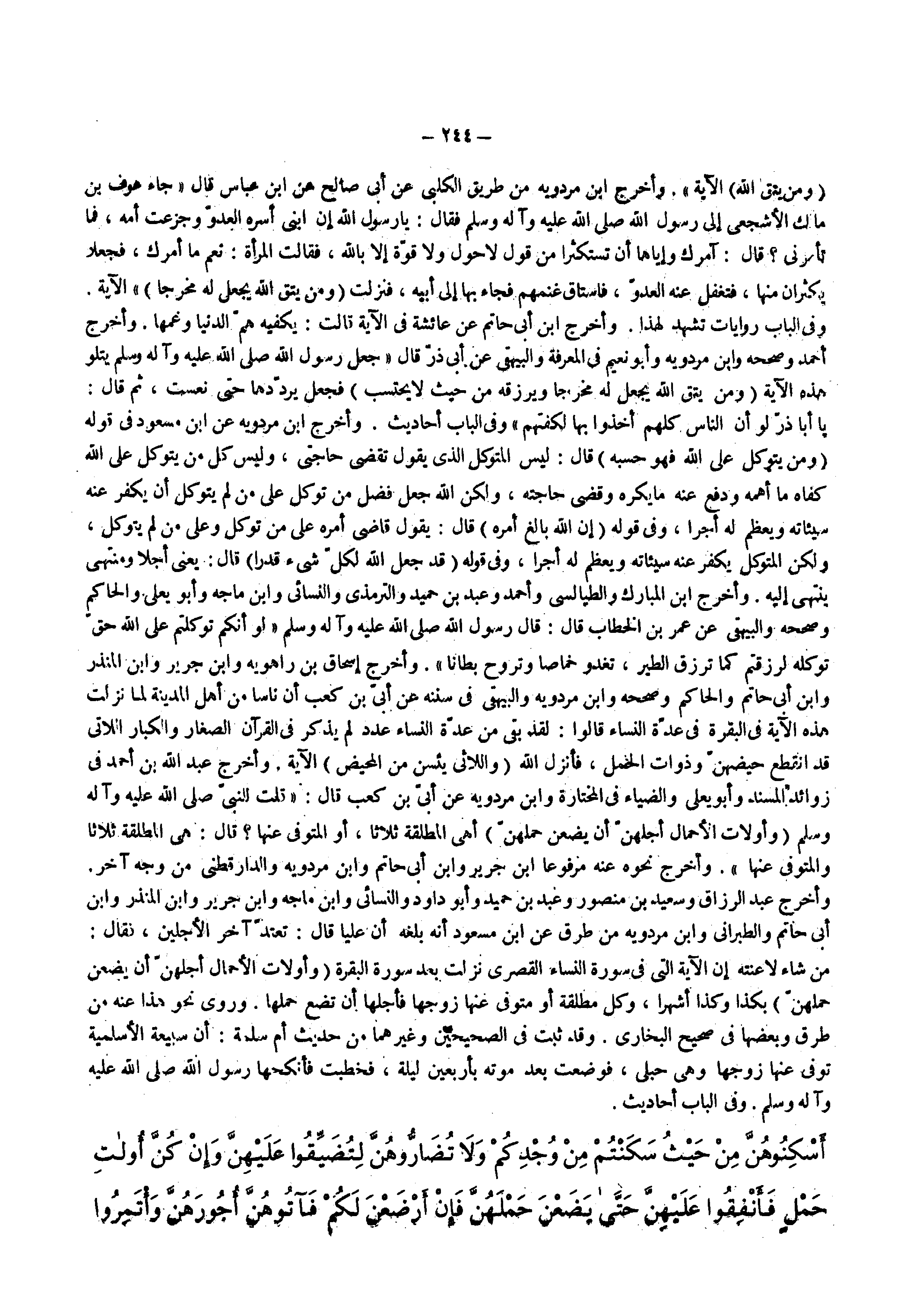 ومن يتق الله الآية واخرج أبن مردويه من طريق الكلبي عن أبي صالح عن أبن عباس قال جاء عوف بن مالك الأشجعي إلى رسول الله ( صلى الله عليه وسلم ) فقال يا رسول الله إن أبني أسره العدو وجزعت أمه فما تأمرني قال آمرك وإياها أن تستكثرا من قول لا حول ولا قوة إلا بالله فقالت المرأة نعم ما أمرك فجعلا يكثران منها فتغفل عنه العدو فاستاق غنمهم فجاء بها إلى أبيه فنزلت ( ومن يتق الله يجعل له مخرجا ) الآية وفي الباب روايات تشهد لهذا وأخرج أبن أبي حاتم عن عائشة في الآية قالت يكفيه هم الدنيا وغمها وأخرج أحمد وصححه وأبن مردويه وابو نعيم في المعرفة والبيهقي عن أبي ذر قال جعل رسول الله صلى الله عليه وإله وسلم يتلو هذه الآية ( ومن يتق الله يجعل له مخرجا ويرزقه من حيث لا يحتسب ) فجعل يردوها حتى نعست ثم قال يا أبا ذر لو أن الناس كلهم أخذوا بها لكفتهم وفي الباب أحاديث وأخرج أبن مردويه عن أبن مسعود في قال ( ومن يتوكل على الله فهو حسبه ) قال ليس المتوكل الذي يقول تقضي حاجتي وليس كل من يتوكل على الله كفاه ما أهمه ودفع عنه ما يكره وقضى حاجته ولكن الله جعل فضل من توكل على من لم يتوكل أن يكفر عنه سيئاته ويعظم له أجرا وفي قوله 0 إن الله بالغ أمره ) قال يقول قاضي أمره على من توكل وعلى من لم يتوكل ولكن المتوكل يكفر عنه سيئاته ويعظم له أجرا وفي قوله 0 قد جعل الله لكل شيء قدرا ) قال يعني أجلا ومنتهى ينتهي إليه واخرج ابن المبارك والطيالسي وأحمد وعبد بن حميد والترمذي والنسائي وأبن ماجه وابو يعلي والحاكم وصححه والبيهقي عن عمر بن الخطاب قال قال رسول الله صلى الله عليه وإله وسلم لو أنكم توكلتم على الله حق توكله لرزقتم كما ترزق خ الطير تغدو خماصا وتروح بطانا وأخرج إسحاق بن راهويه وأبن جرير وأبن المنذر وأبن أبي حاتم والحاكم وصححه وأبن مردويه والبيهقي في سننه عن أبي كعب أن ناسا من أهل المدينة لما نزلت هذه الآية في البقرة في عدة النساء قالوا لقد بقي من عدة النساء عدد لم يذكر في القرآن الصغار والكبار اللاتي قد انقطع حيضهن وذوات الحمل فأنزل الله ( واللائي يئسن من المحيض ) الآية وأخرج عبد الله بن أحمد في زوائد المسند وأبو يعلي والضياء في المختارة وأبن مردويه عن أبي كعب قال قلت للنبي صلى الله عليه وإله وسلم ( وأولات الأحمال أجلهن أن يضعن حملهن ) أهي المطلقة ثلاثا أو المتوفي عنها قال هي المطلقة ثلاثا والمتوفي عنها وأخرج نحوه عنه مرفوعا أبن جرير وأبن أبي حاتم وأبن مردويه والدارقطني من وجه آخر وأخرج عبد الرزاق وسعيد بن منصور وعبد بن حميد وأبو داود والنسائي وأبن ماجه وأبن جرير وأبن المنذر وأبن أبي حاتم والطبراني وأبن مردويه من طرق عن أبن مسعود أنه بلغه أن عليا قال تعتد آخر الأجلين فقال من شاء لاعنته إن الآية في سورة النساء القصرى نزلت بعد سورة البقرة ( وأولات الأحمال أجلهن ان يضعن حملهن ) بكذا وكذا أشهرا وكل مطلقة أو متوفي عنها زوجها فأجلها أن تضع حملها وروى نحو هذا عنه من طرق وبعضها في صحيح البخاري وقد ثبت في الصحيحين وغيرهما من حديث أم سلمة أن سبيعة الأسلمية توفي عنها زوجها وهي حبلى فوضعت بعد موته بأربعين ليلة فخطبت فأنكحها رسول الله صلى الله عليه وإله وسلم وفي الباب أحاديث سورة الطلاق ( 6 7 )