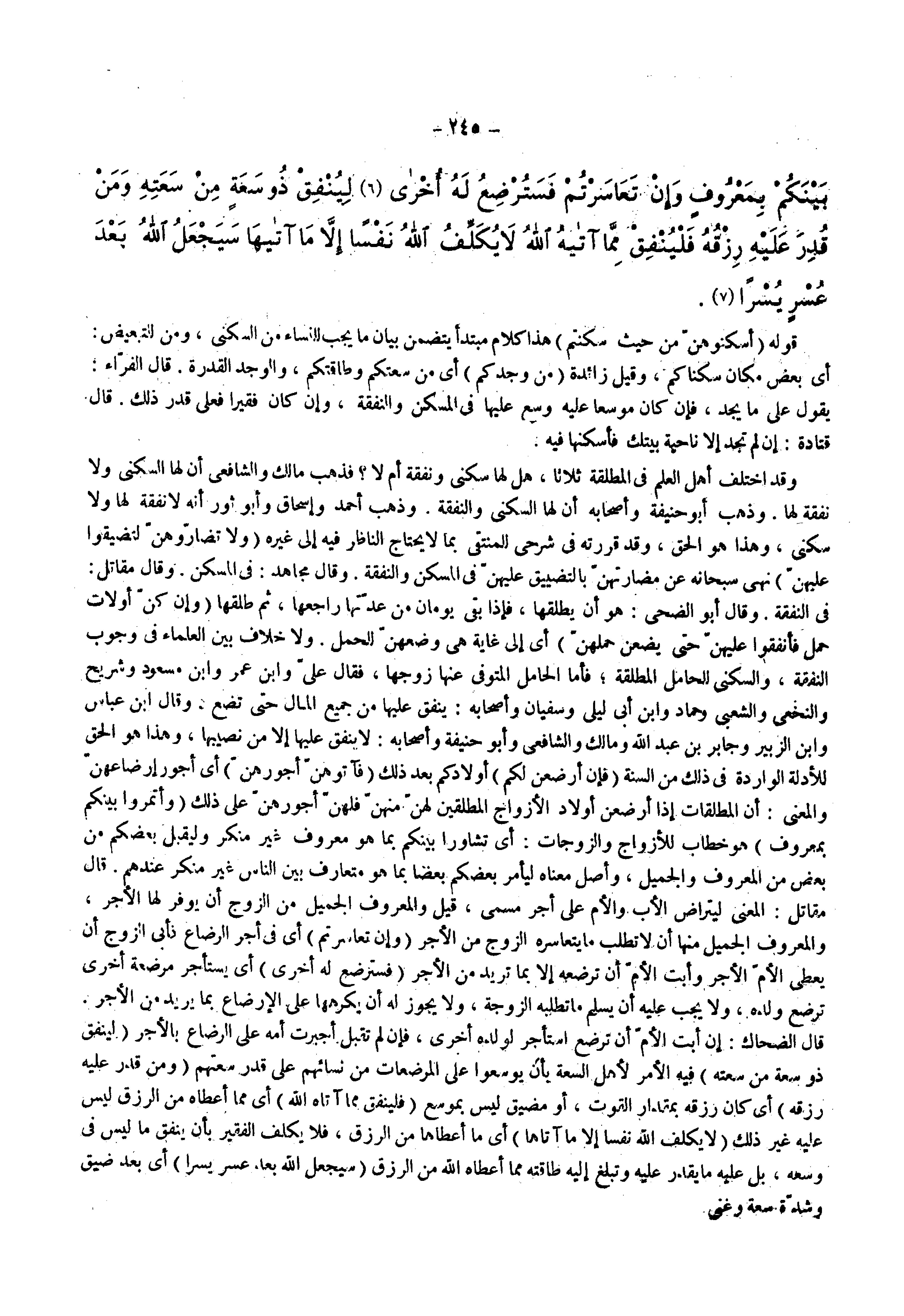 قوله ( آسكنوهن من حيث سكنتم ) هذا كلام متبدأ يتضمن بيان ما يجب للنساء من السكنى ومن للتبعيض أي بعض مكان سكناكم وقيل زائدة ( من وجدكم ) أي من سعتكم وطاقتكم والوجد القدرة قال الفراء يقول على ما يجد فإن كان موسعا عليه وسع عليها في المسكن والنفقة وإن كان فقيرا فعلى قدر ذلك قال قتادة إن لم تجد إلا ناحية بيتك فأسكنها فيه وقد اختلف أهل العلم في المطلقة ثلاثا هل لها سكنى ونفقة أم لا فذهب مالك والشافعي أن لها السكنى ولا نفقة لها وذهب أبو حنيفة وأصحابه أن لها السكنى والنفقة وذهب أحمد وإسحاق وأبو ثور أنه لا نفقة لها ولا سكنى وهذا هو الحق وقد قررته في شرحي للمنتقى بما لا يحتاج الناظر فيه إلى غيره ( ولا تضاروهن لتضيقوا عليهن ) نهى سبحانه عن مضارتهن بالتضيق عليهن في المسكن والنفقة وقال مجاهد في المسكن وقال مقاتل في النفقة وقال أبو الضحى هو أن يطلقها فإذا بقي يومان من عدتها راجعها ثم طلقها ( وإن كن أولات حمل فأنفقوا عليهن حتى يضعن حملهن ) أي إلى غاية هي وضعهن للحمل ولا خلاف بين العلماء في وجوب النفقة والسكنى للحامل المطلقة فأما الحامل المتوفي عنها زوجها فقال علي وأبن عمر وأبن مسعود وشريح والنخعي والشعبي وحماد وأبن أبي ليلى وسفيان وأصحابه ينفق عليها من جميع المال حتى تضع وقال أبن عباس وأبن الزبير وجابر بن عبد الله ومالك والشافعي وأبو حنيفة وأصحابه لا ينفق عليها إلا من نصيبها وهذا هو الحق للأدلة الواردة في ذلك من السنة ( فإن أرضعن لكم ) أولادكم بعد ذلك ( فآتوهن أجورهن ) أي أجور إرضاعهن والمعنى أن المطلقات إذا أرضعن أولاد الأزواج المطلقين لهن منهن فلهن أجورهن على ذلك ( وأتمروا بينكم بمعروف ) هو خطاب للأزواج والزجات أي تشاوروا بينكم بما هو المعروف غير منكر وليقبل بعضكم من بعض من المعروف والجميل وأصل معناه ليأمر بعضكم بعضا بما هو متعارف بين الناس غير منكر عندهم قال مقاتل المعنى ليتراض الأب والأم على أجر مسمى قيل والمعروف الجميل من الزوج أن يوفر لها الأجر والمعروف الجميل منها أن لا تطلب ما يتعاسر الزوج من الأجر ( وإن تعاسرتم ) أي في أجر الرضاع فأبى الزوج أن يعطي الأم الأجر وأبت الأم أن ترضعه إلا بما تريد من الأجر ( فسترضع له أخرى ) أي يستأجر مرضعة اخرى ترضع ولده ولا يجب عليه أن يسلم ما تطلبه الزوجة ولا يجوز له أن يكرهها على الأرضاع بما يريد من الأجر قال الضحاك إن أبت الأم أن ترضع استأجر لولده أخرى فإن لم تقبل فإن لم تقبل أجبرت أمه على الرضاع بالأجر