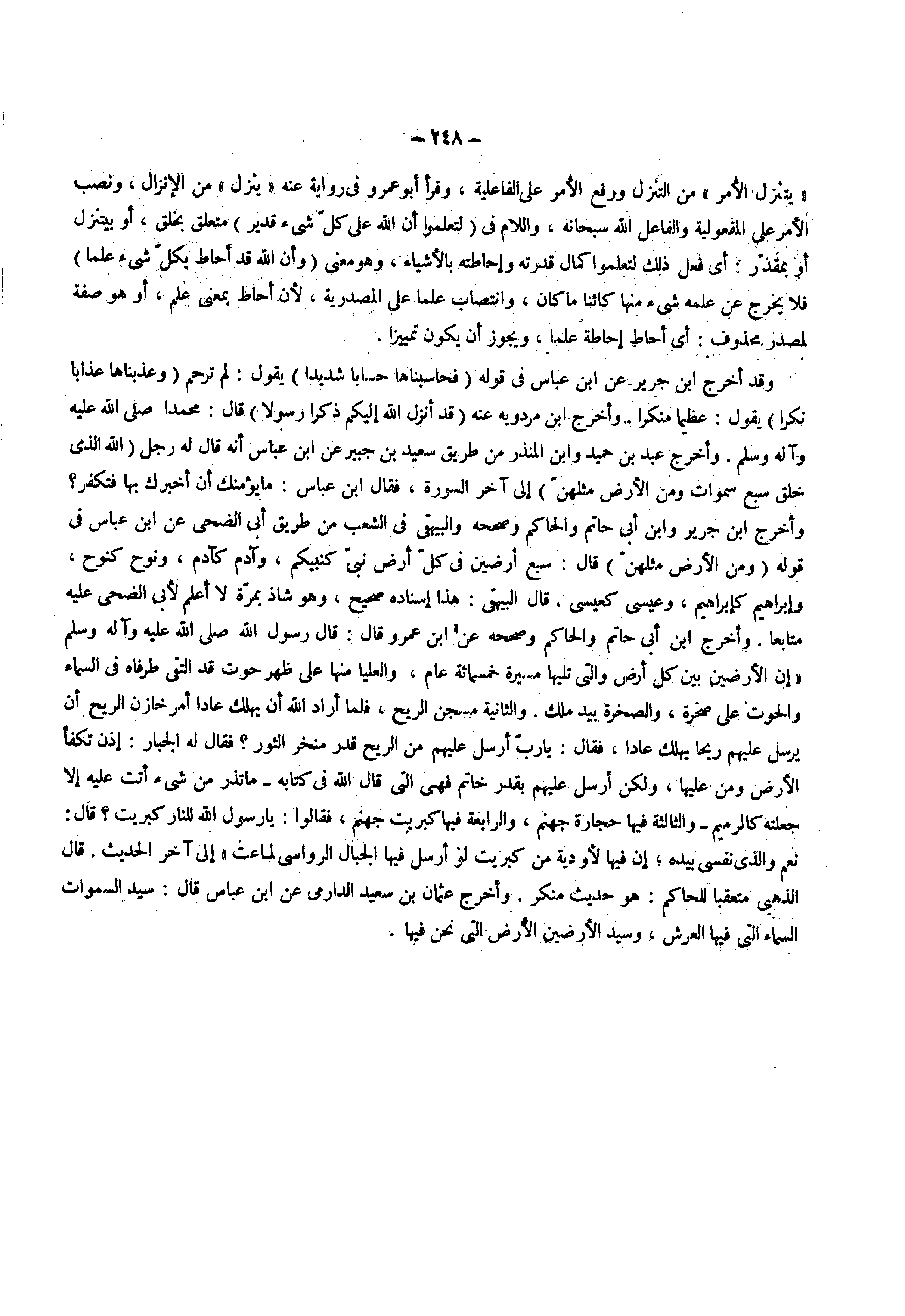 وقد أخرج أبن جرير عن أبن عباس في قوله ( فحاسبناها حسابا شديدا ) يقول لم ترحم ( وعذبناها عذابا نكرا ) يقول عظيما منكرا واخرج أبن مردويه عنه ( قد أنزل الله إليكم ذكرا رسولا ) قال محمد صلى الله عليه وإله وسلم وأخرج عبد بن حميد وأبن المنذر من طريق سعيد بن جبير عن أبن عباس أنه قال له رجل ( الله الذي خلق سبع سموات ومن الأرض مثلهن ) إلى آخر السورة فقال أبن عباس ما يؤمنك أن أخبرك بها فتكفر وأخرج أبن جرير وأبن أبي حاتم والحاكم وصححه والبيهقي في الشعب من طريق أبي الضحى عن ابن عباس في قوله ( ومن الأرض مثلهن ) قال سبع أرضين في كل أرض نبي كنبيكم وآدم كآدم ونوح كنوح وإبراهيم كإبراهيم وعيسى كعيسى قال البيهقي هذا إسناده صحيح وهو شاذ بمرة لا أعلم لأبي الضحى عليه متابعا وأخرج أبن أبي حاتم والحاكم وصححه عن أبن عمرو قال قال رسول الله صلى الله عليه وإله وسلم إن الأرضيين بين كل أرض والتي تليها مسيرة خمسمائة عام والعليا منها على ظهر حوت قد التقى طرفاه في السماء والحوت على صخرة والصخرة بيد ملك والثانية مسجن الريح فلما أراد الله أن يهلك عادا أمر خازن الريح أن يرسل علي ريحا يهلك عادا فقال يا رب أرسل عليهم من الريح قدر منخر الثور فقال له الجبار إذن تكفا الأرض ومن عليها ولكن أرسل عليهم بقدر خاتم فهي التي قال الله في كتابه ما تذر من شيء أتت عليه إلا جعلته كالرميم والثالثة فيها حجارة جهنم والرابعة فيها كبريت جهنم فقالوا يا رسول الله للنار كبريت قال نعم والذي نفسي بيده إن فيها لأدوبة من كبريت لو أرسل فيها الجبال الرواسي لماعت إلى آخر الحديث قال الذهبي متعقبا للحاكم هو حديث منكر وأخرج عثمان بن سعيد الدرامي عن أبن عباس قال سيد السموات السماء التي فيها العرش وسيد الأرضين الأرض التي نحن فيها