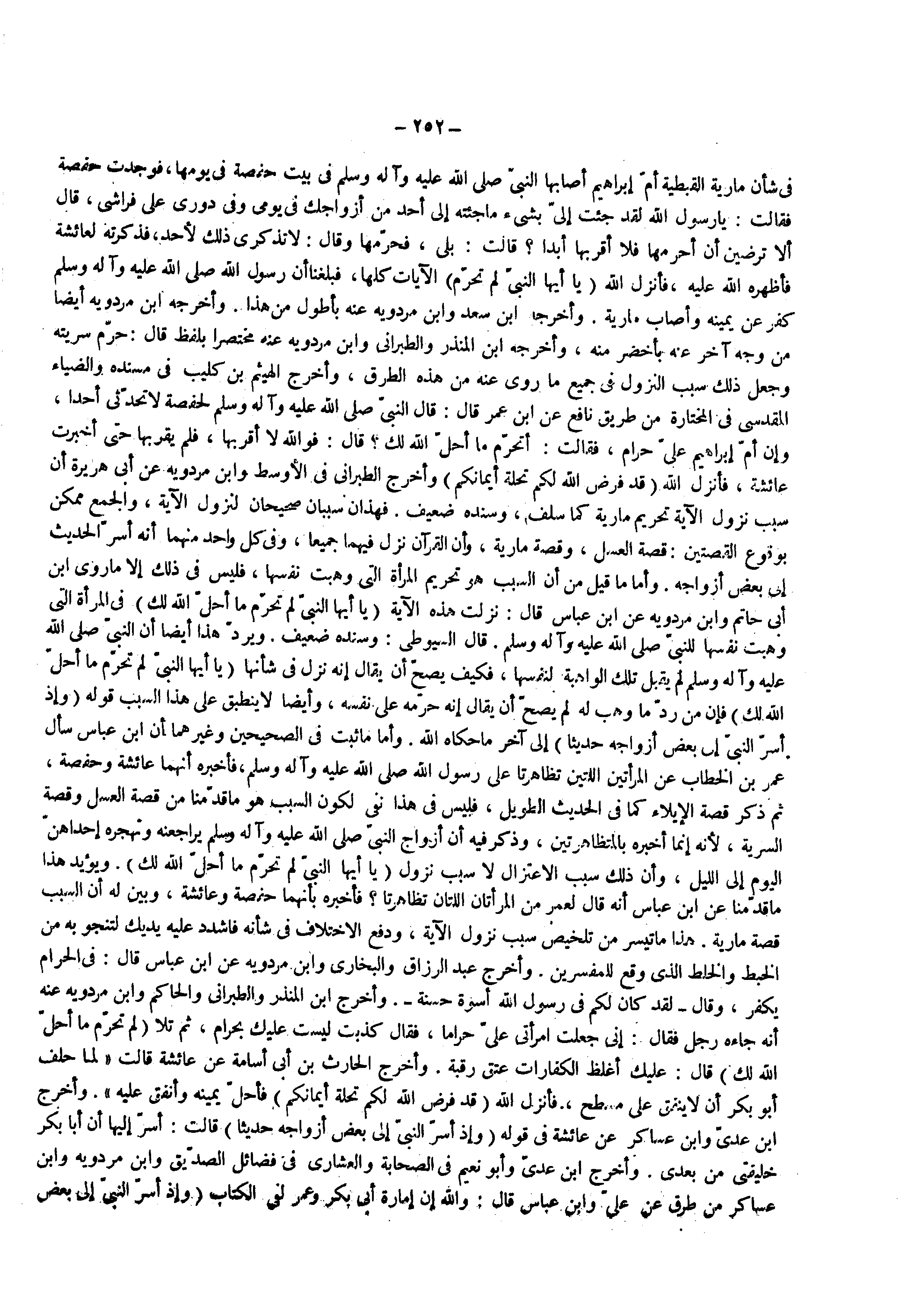في شأن مارية القبطية أم إبراهيم أصابها النبي صلى الله عليه وإله وسلم في بيت حفصة في يومها فوجدت حفصة فقالت يا رسول الله لقد جئت إلى بشيء ما جئته إلى أحد من أزواجك في يومي وفي دوري على فراشي قال ألا ترضين أن أحرمها فلا أقربها أبدا قالت بلى فحرمها وقال لا تذكري ذلك لأحد فذكرته لعائشة فأظهره الله عليه فأنزل الله ( يا ايها النبي لم تحرم ) الآيات كلها فبلغنا أن رسول الله صلى الله عليه وإله وسلم كفر عن يمينه واصاب مارية وأخرجه أبن سعد وأبن مردويه عنه بأطول من هذا وأخرجه أبن مردويه أيضا من وجه آخر عنه بأخصر منه وأخرجه أبن المنذر والطبراني وأبن مردويه عنه مختصرا بلفظ قال حرم سريته وجعل ذلك سبب النزول في جميع ما روى عنه من هذه الطرق واخرج الهيثم بن كليب في مسنده والضياء المقدسي في المختارة من طريق نافع عن أبن عمر قال قال النبي صلى الله عليه وإله وسلم لحفصة لا تحدثي أحدا وإن أن إبراهيم على حرام فقالت أتحرم ما احل الله لك قال فوالله لا أقربها فلم يقربها حتى أخبرت عائشة فأنزل الله ( قد فرض الله لكم تحلة أيمانكم ) وأخرج الطبراني في الأوسط وأبن مردويه عن أبي هريرة أن سبب نزول الآية تحريم مارية كما سلف وسنده ضعيف فهذان سببان صحيحان لنزول الآية والجمع ممكن بوقوع القصتين قصة العسل وقصة مارية وأن القرآن نزل فيهما جميعا وفي كل واحد منهما أنه أسر الحديث إلى بعض أزواجه وأما ما قيل من أن السبب هو تحريم المرأة التي وهبت نفسها فليس في ذلك إلا ما روى أبن أبي حاتم وابن مردويه عن أبن عباس قال نزلت هذه الآية ( يا ايها النبي لم تحرم ما أحل الله لك ) في المرأة التي وهبت نفسها للنبي صلى الله عليه وإله وسلم قال السيوطي وسنده ضعيف ويرد هذا أيضا أن النبي صلى الله عليه وإله وسلم لم يقبل تلك الواهبة لنفسها فكيف يصح أن يقال إنه نزل في شأنها ( يا أيها النبي لم تحرم ما أحل الله لك ) فإن من رد ما وهب له لم يصح أن يقال إنه حرمه على نفسه وايضا لا ينطبق على هذا السبب قوله ( وإذا أسر النبي إلى بعض أزواجه حديثا ) إلى آخره ما حكاه الله وأما ما ثبت في الصحيحين وغيرهما أن أبن عباس سأل عمر بن الخطاب عن المرأتين اللتين تظاهرتا على رسول الله صلى الله عليه وإله وسلم فأخبره أنهما عائشة وحفصة ثم ذكر قصة الإيلاء كما في الحديث الطويل فليس في هذا نفي لكون السبب هو ما قدمناه من قصة العسل وقصة السرية لأنه إنما أخبره بالمتظاهرتين وذكر فيه أن ازواج النبي صلى الله عليه وإله وسلم يراجعنه وتهجره حداهن اليوم إلى الليل وأن ذلك سبب الأعتزال لا سبب نزول ( يا ايها النبي لم تحرم ما أحل الله لك ) ويؤيد هذا ما قدمنا عن ابن عباس أنه قال لعمر من المرأتان اللتان تظاهرتا فأخبره بأنهما حفصة وعائشة وبين له أن السبب قصة مارية هذا ما تيسر من تلخيص سبب نزول الآية ودفع الاختلاف في شأنه فاشدد عليه يديك لتنجو به من الخبط والخلط الذي وقع للمفسرين واخرج عبد الرزاق والبخاري وأبن مردويه عن أبن عباس قال في الحرام يكفر وقال لقد كان لكم في رسول الله أسوة حسنة وأخرج أبن المنذر والطبراني والحاكم وأبن مردويه عنه أنه جاءه رجل فقال إني جعلت امرتي على حراما فقال كذبت ليست عليك بحرام ثم تلا ( لم تحرم ما أحل الله لك ) قال عليك أغلظ الكفارات عتق رقبة واخرج الحارث بن أبي أسامة عن عائشة قالت لما حلف أبو بكر أن لا ينفق على مسطح فأنزل الله ( قد فرض الله لكم تحلة أيمانكم ) فأحل يمينه وانفق عليه وأخرج أبن عدي وأبن عساكر عن عائشة في قوله ( وإذا اسر النبي إلى بعض أزواجه حديثا قالت أسر إليها أن أبا بكر خليفتي من بعدي وأخرج أبن عدي وأبو نعيم في الصحابة والعشارى في فضائل الصديق وأبن مردويه وأبن عساكر من طرق عن علي وأبن عباس قال والله ان إمارة أبي بكر وعمر لفي الكتاب ( وإذا اسر النبي إلى بعض