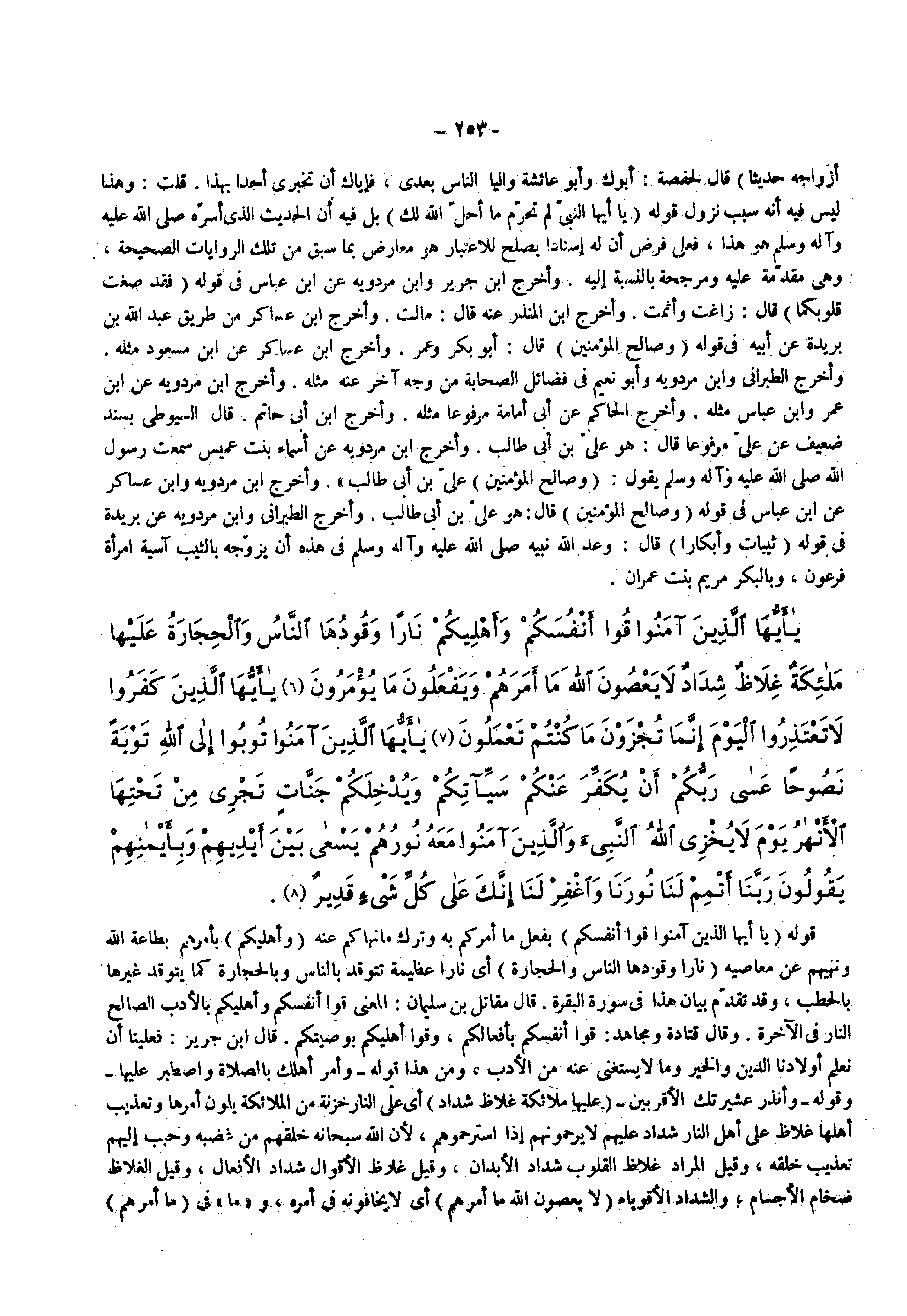 أزواجه حديثا ) قال لحفصة أبوك وأبو عائشة واليا الناس بعدي فإياك أن تخبري أحدا بهذا قلت وهذا ليس فيه أنه سبب نزول قوله ( يا أيها النبي لم تحرم ما أحل الله لك ) بل فيه أن الحديث الذي أسره صلى الله عليه وإله وسلم هو هذا فعلى فرض أن له إسنادا يصلح للاعتبار هو معارض بما سبق من تلك الروايات الصحيحة وهي مقدمة عليه ومرجحة بالنسبة إليه واخرج أبن جرير وأبن مردويه عن ابن عباس في قوله ( فقد صغت قلوبكما ) قال زاغت وأتخت وأخرج أبن المنذر عنه قال مالت وأخرج أبن عساكر من طريق عبد الله بن بريدة عن أبيه في قوله ( وصالح المؤمنين ) قال أبو بكر وعمر وأخرج أبن عساكر عن أبن مسعود مثله وأخرج الطبراني وأبن مردويه وأبو نعيم في فضائل الصحابة من وجه آخر عنه مثله واخرج أبن مردويه عن ابن عمر وأبن عباس مثله واخرج الحاكم عن أبي أمامة مرفوعا مثله وأخرج أبن أبي حاتم قال السيوطي بسند ضعيف عن على مرفوعا قال هو علي بن أبي طالب واخرج أبن مردويه عن اسماء بنت عميس سمعت رسول الله صلى الله عليه وإله وسلم يقول ( وصالح المؤمنين ) علي بن أبي طالب واخرج ابن مردويه وأبن عساكر عن ابن عباس في قوله 0 وصالح المؤمنين ) قال هو علي بن أبي طالب وأخرج الطبراني وابن مردويه عن بريدة في قوله ( ثيبات وابكارا ) قال وعد الله نبيه صلى الله عليه وإله وسلم في هذه أن يزوجه بالثيب آسية امرأة فرعون وبالبكر مريم بنت عمران