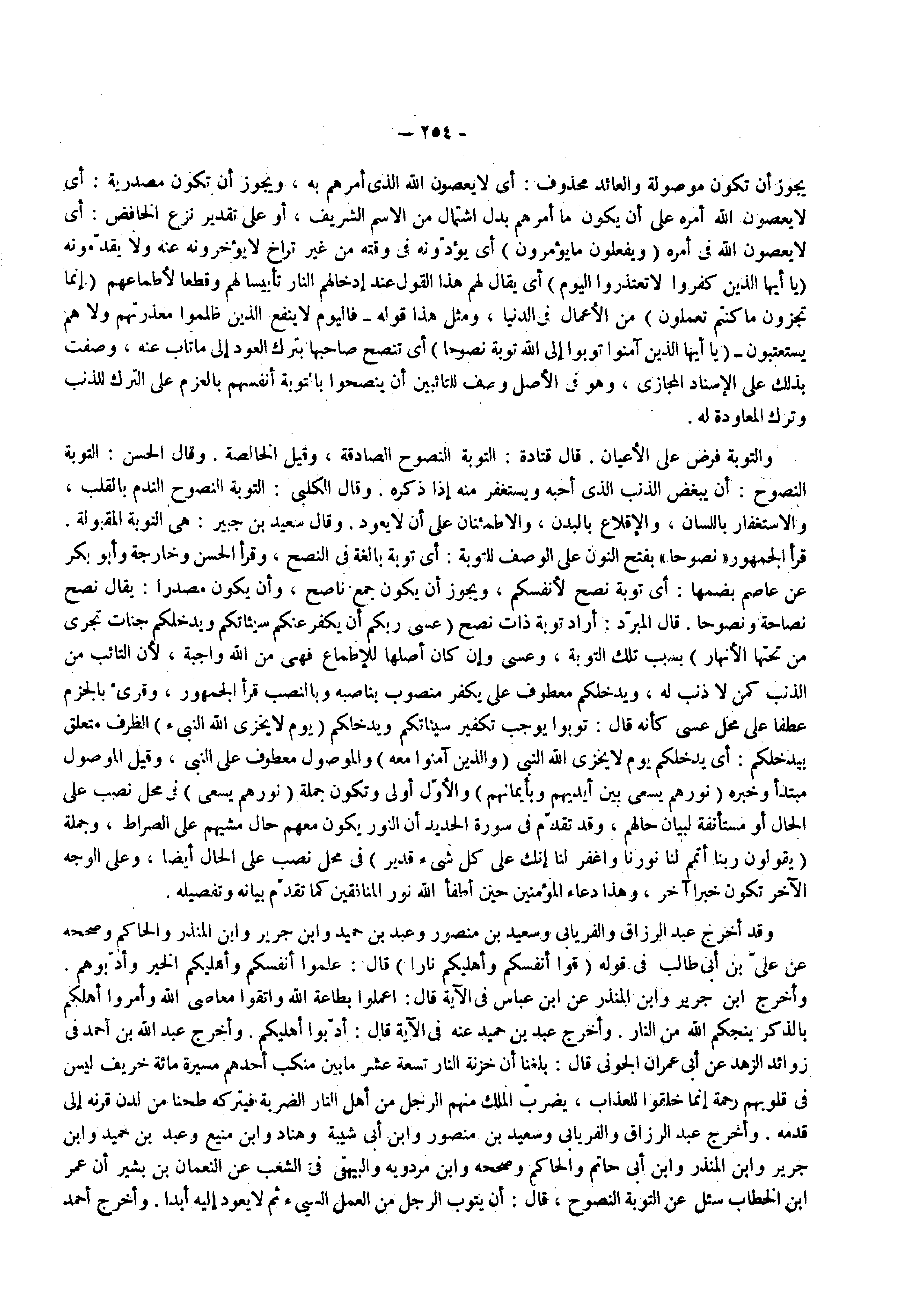 ( يا ايها الذين آمنوا توبوا إلى الله توبة نصوحا ) أي تنصح صاحبها بترك العودة إلى ما تاب عنه وصنف بذلك على الإسناد المجازي وهو في الأصل وصف للتائبين أن ينصحوا بالتوبة من أنفسهم بالعزم على الترك للذنب وترك المعاودة له والتوبة فرض على الأعيان قال قتادة التوبة النصوح الصادقة وقيل الخالصة وقال الحسن التوبة النصوح أن يبغض الذنب الذي أحبه ويستغفر منه إذا ذكره وقال الكلبي التوبة النصوح الندم بالقلب والاستغفار باللسان والإقلاع بالبدن والاطمئنان على أن لا يعود وقال سعيد بن جبير هي التوبة المقبولة قرأ الجمهور نصوحا بفتح النون على الوصف للتوبة أي توبة بالغة في النصح وقرا الحسن وخارجه وأبو بكر عن عاصم بضمها أي توبة نصح لأنفسكم ويجوز أن يكون جمع ناصح وأن يكون مصدرا يقال نصح نصاحة ونصوحا قال المبرد أراد توبة ذات نصح ( عسى ربكم أن يكفر عنكم سيئاتكم ويدخلكم جنات تجري من تحتها الأنهار ) بسبب تلك التوبة وعسى وإن كان أصلها للإطماع فهي من الله واجبة لأن التائب من الذنب كمن لا ذنب له ويدخلكم معطوف على يكفر منصوب بناصبة وبالنصب قرأ الجمهور وقرئ بالجزم عطفا على محل عسى كأنه قال توبوا يوجب تكفير سيئاتكم ويدخلكم ( يوم لا يخزي الله النبي ) الظرف متعلق بيدخلكم اي يدخلنكم يوم لا يخزي الله النبي ( والذين آمنوا معه ) والموصول معطوف على النبي وقيل الموصول مبتدا وخبره ( نورهم يسعى بين أيديهم وبأيمانهم ) والأول أولى وتكون جملة ( نورهم يسعى ) في محل نصب على الحال أو مستأنفة لبيان حالهم وقد تقدم في سورة الحديد أن النور يكون معهم حال الحال مشيهم على الصراط وجملة ( يقولون ربنا أتمم لنا نورنا واغفر لنا إنك على كل شيء قدير ) في محل نصب على الحال أيضا وعلى الوجه الآخر تكون خبرا آخر وهذا دعاء المؤمنين حين أطفأ الله نور المنافقين كما تقدم بيانه وتفصيله