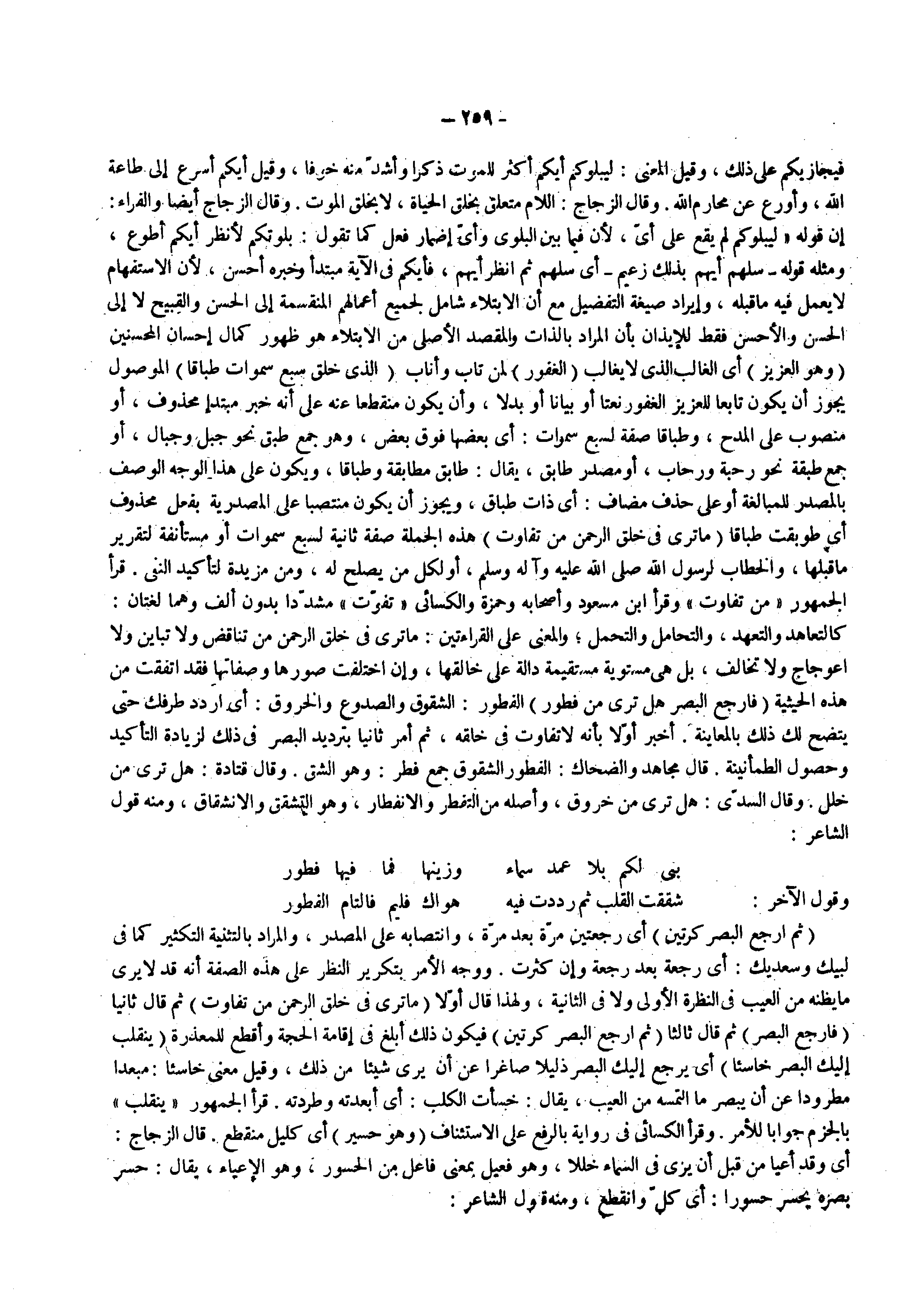 ( الذي خلق سبع سموات طباقا ) الموصول يجوز أن يكون تابعا للعزيز الغفور نعتا أو بيانا أو بدلا وأن يكون منقطعا عنه على إنه خبر مبتدأ محذوف أو منصوب على المدح وطباقا صفة لسبع سموات أي بعضها فوق بعض وهو جمع طبق نحو جبل و جبال أو جمع طبقة نحو رحبة ورحاب أو مصدر طابق يقال طابق مطابقة وطباقا ويكون على هذا الوجه الوصف بالمصدر للمبالغة أو على حذف مضاف أي ذات طباق ويجوز أن يكون منتصبا على المصدرية بفعل محذوف أي طوبقت طباقا ( ما ترى في خلق الرحمن من تفاوت ) هذه الجملة صفة ثانية لسبع سموات أو مستأنفة لتقرير ما قبلها والخطاب لرسول الله صلى الله عليه وإله وسلم أو لكل من يصلح له ومن مزيده لتأكيدالنفي قرأ الجمهور من تفاوت وقرأ ابن مسعود واصحابه وحمزة والكسائي تفوت مشددا بدون الف وهما لغتان كالتعاهد والتعهد والتحامل والتحمل والمعنى على القراءتين ما ترى في خلق الرحمن من تناقض ولا تباين ولا اعوجاج ولا تخالف بل هي مستوية مستقيمة دالة على خالقها وإن اختلفت صورها وصفاتها فقد اتفقت من هذه الحيثية ( فارجع البصر هل ترى من فطور ) الفطور الشقوق والصدوع والخروق أي اردد طرفك حتى يتضح لك ذلك بالمعاينة أخبر أولا بأنه لا تفاوت في خلقه في خاتمة ثم امر ثانيا بترديد البصر في ذلك لزيادة التأكيد وحصول الطمأنينة قال مجاهد والضحاك الفطور الشقوق جمع فطر وهو الشق وقال قتادة هل ترى من خلل وقال السدي هل ترى من خروق وأصله من التفطر والانفطار وهو التشقق والانشقاق ومنه قول الشاعر بنى لكم بلا عمد سماء وزينها فما فيها فطور
