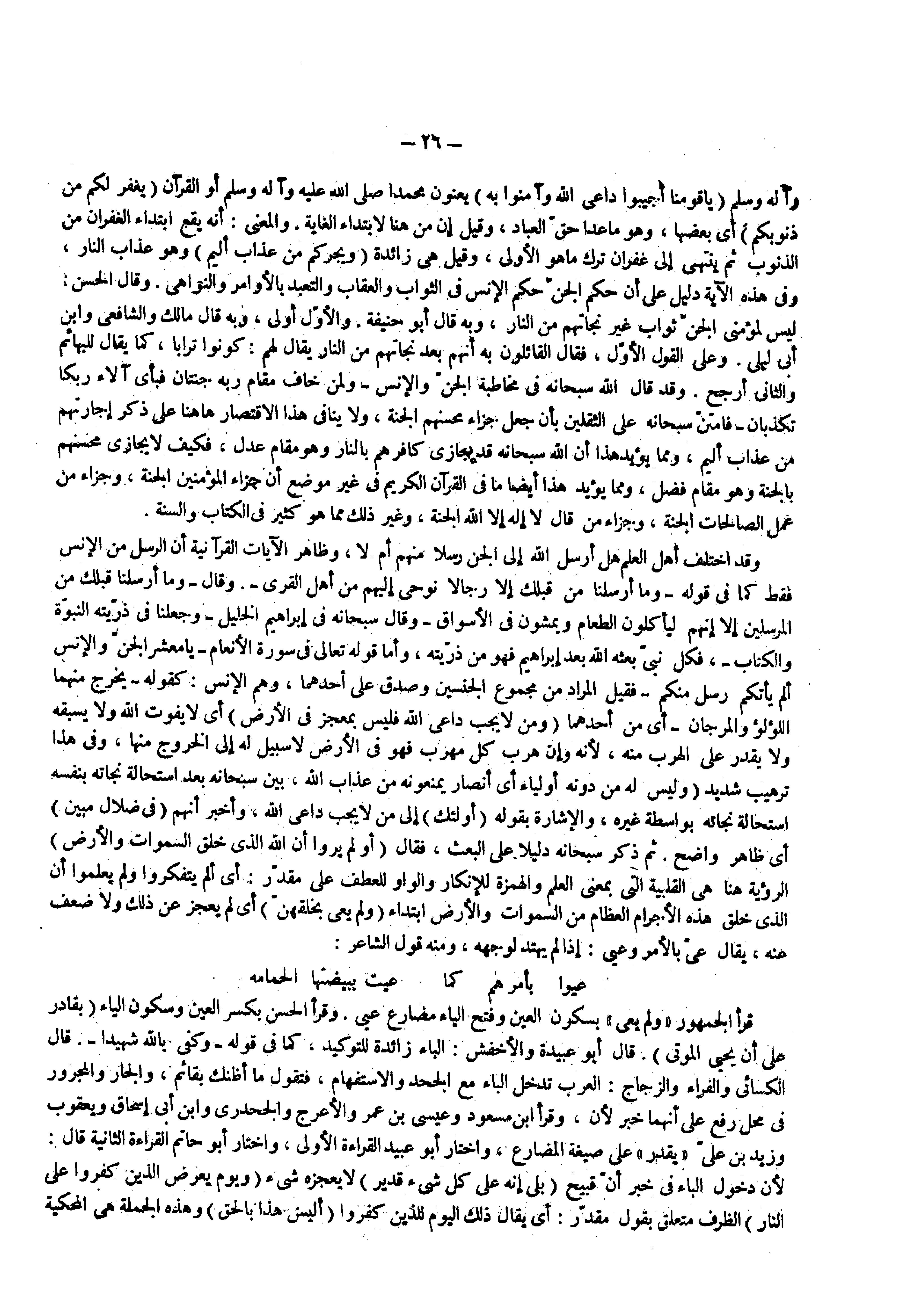 أي بعضها وهو ما عدا حق العباد وقيل إن من هنا لابتداء الغاية والمعنى أنه يقع ابتداء الغفران من الذنوب ثم ينتهي إلى غفران ترك ما هو الأولى وقيل هي زائدة ( ويجركم من عذاب أليم ) وهو عذاب النار وفي هذه الآية دليل على إن حكم الجن حكم الإنس في الثواب والعقاب والتعبد بالأوامر والنواهي وقال الحسن ليس لمؤمني الجن ثواب غير نجاتهم من النار وبه قال أبو حنيفة والأول أولى وبه قال مالك والشافعي وابن أبي ليلى وعلى القول الأول فقال القائلون به أنهم بعد نجاتهم من النار يقال لهم كونوا ترابا كما يقال للبهائم والثاني أرجح وقد قال الله سبحانه في مخاطبة الجن والأنس ولمن خاف مقام ربه جنتان فبأي آلاء ربكما تكذبان فأمتن سبحانه على الثقلين بأن جعل جزاء محسنهم الجنة ولا ينافي هذا الاقتصار ها هنا على ذكر إجارتهم من عذاب أليم ومما يؤيد هذا أن الله سبحانه قد جازى كافرهم بالنار وهو مقام عدل فكيف لا يجازي محسنهم بالجنة وهو مقام فضل ومما يؤيد هذا أيضا ما في القرآن الكريم في غير موضع أن جزاء المؤمنين الجنة وجزاء من عمل الصالحات الجنة وجزاء من قال لاإله إلا الله الجنة وغير ذلك مما هو كثير في الكتاب والسنة وقد اختلف أهل العلم هل أرسل الله إلى الجن رسلا منهم أم لا وظاهر الآيات القرآنية أن الرسل من الإنس فقط كما في قوله وما أرسلنا من قبلك إلا رجالا نوحي إليهم من أهل القرى وقال وما أرسلنا قبلك من المرسلين إلا إنهم ليأكلون الطعام ويمشون في الأسواق وقال سبحانه في إبراهيم الخليل وجعلنا في ذريته النبوة والكتاب فكل نبي بعثه الله بعد إبراهيم فهو من ذريته وأما قوله تعالى في سورة الأنعام يا معشر الجن والأنس ألم يأتكم رسل منكم فقيل المراد من مجموع الجنسين وصدق على إحدهما وهو الإنس كقوله يخرج منهما اللؤلؤ والمرجان أي من أحدهما