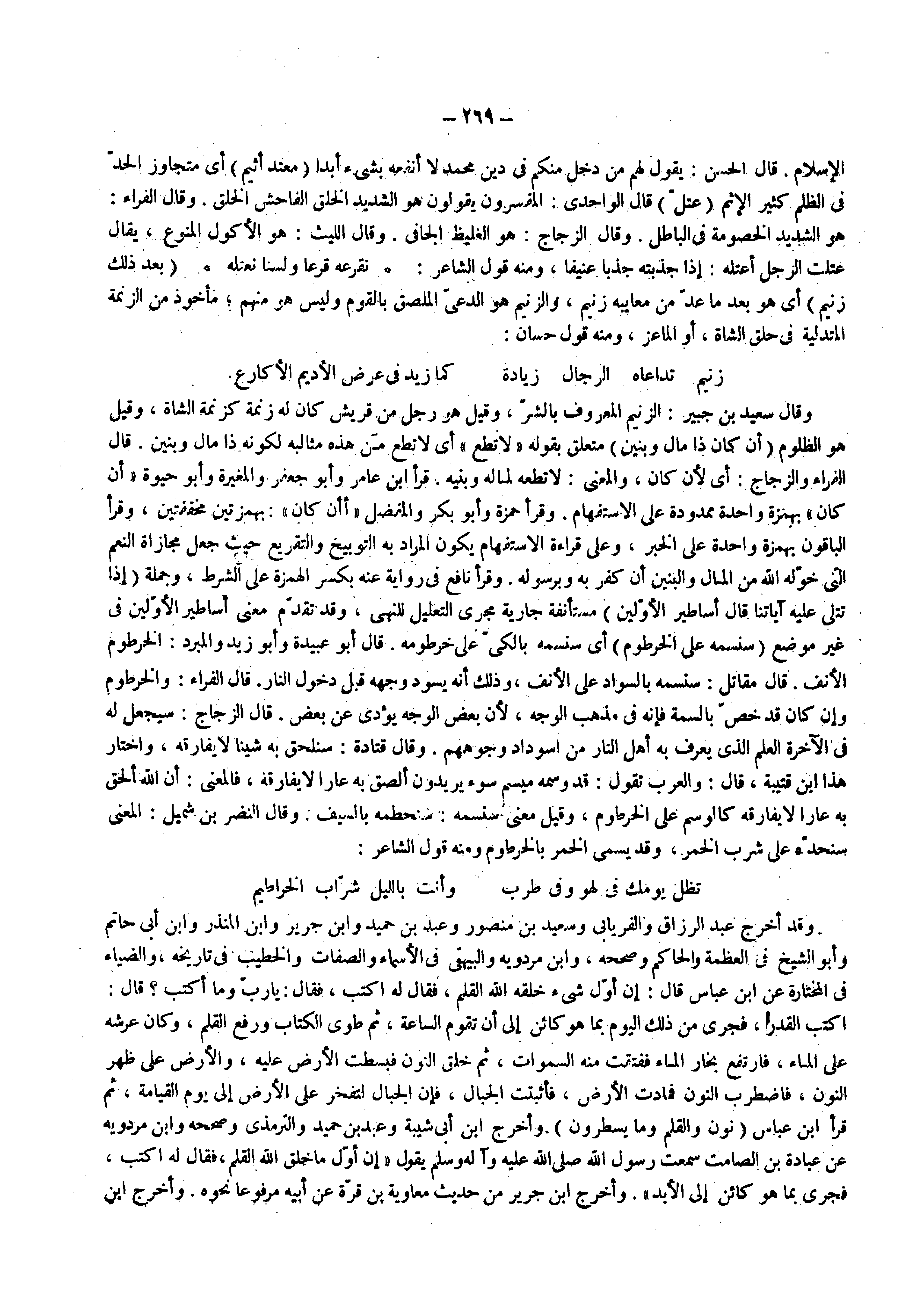 وقال سعيد بن جبير الزنيم المعروف بالشر وقيل هو رجل من قريش كان له زنمة كزنمة الشاة وقيل هو المظلوم