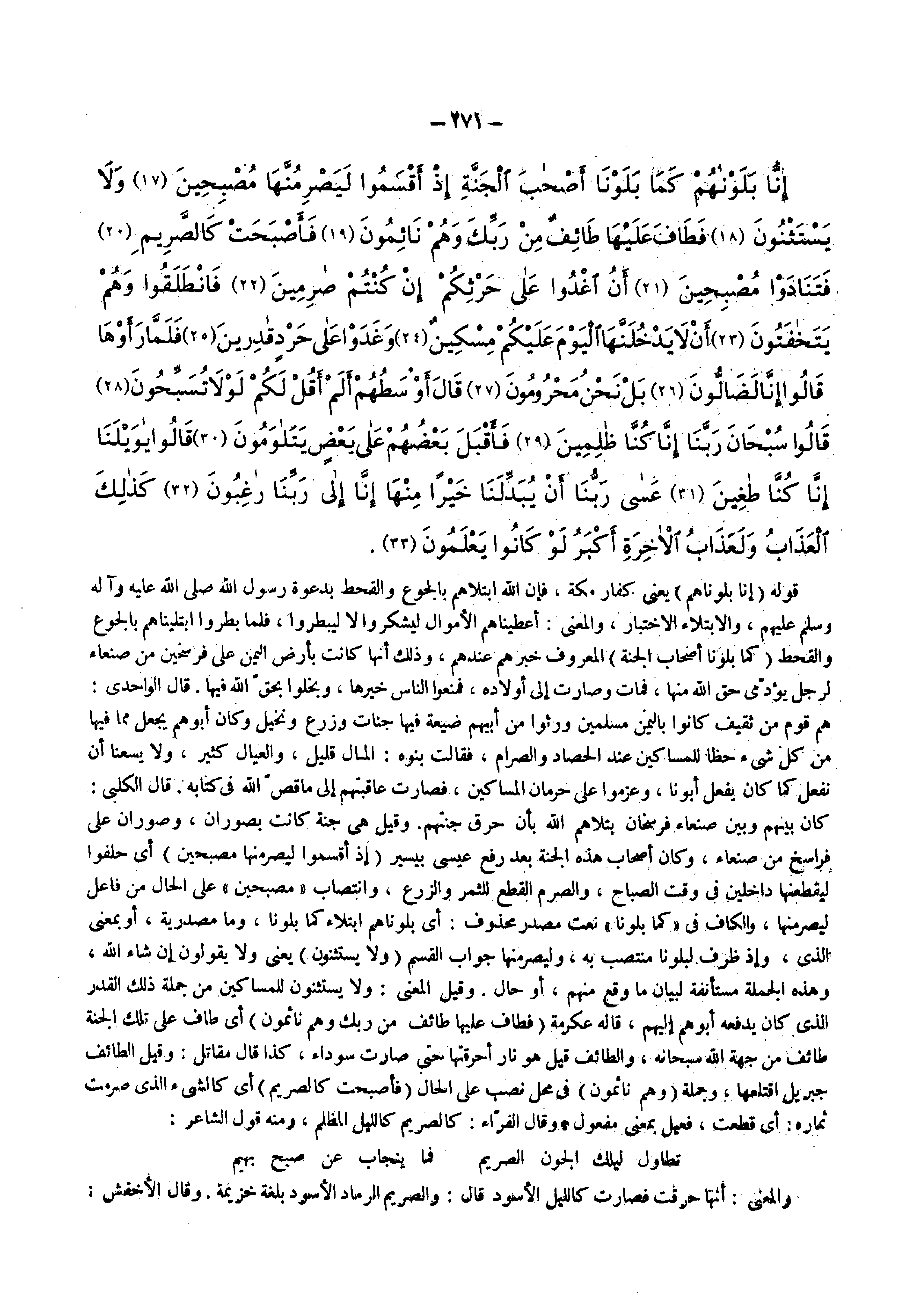 قوله ( إنا بلوناهم ) يعني كفار مكة فإن الله ابتلاهم بالجوع والقحط بدعوة رسول الله ( صلى الله عليه وسلم ) عليهم والابتلاء الاختبار والمعنى أعطيناهم الأموال ليشكروا لا ليبطروا فلما بطروا ابتليناهم بالجوع والقحط ( كما بلونا أصحاب الجنة ) المعروف خبرهم عندهم وذلك أنها كانت بأرض اليمن على فرسخين من صنعاء لرجل يؤدي حق الله منها فمات وصارت إلى أولاده فمنعوا الناس خيرها وبخلوا بحق الله فيها قال الواحدى هم قوم من ثقيف كانوا باليمن مسلمين ورثوا من أبيهم ضيعة فيها جنات وزرع ونخيل وكان أبوهم بجعل مما فيها من كل شيء حظا للمساكين عند الحصاد والصرام فقالت بنوه المال قليل والعيال كثير ولا يسعنا أن نفعل كما كان يفعل أبونا وعزموا على حرمان المساكين فصارت عاقبتهم إلى ما قص الله في كتابه قال الكلبي كان بينهم وبين صنعاء فرسخان فبلاهم الله بأن حرق جنتهم وقيل هي جنة كانت بصوران وصوران على فراسخ من صنعاء وكان أصحاب هذه الجنة بعد رفع عيسى بيسير ( إذ أقسموا ليصرمنها مصبحين ) أي حلفوا ليقطعنها داخلين في وقت الصباح والصرم القطع للثمر والزرع وانتصاب مصبحين على الحال من فاعل ليصرمنها والكاف في كما بلونا نعت مصدر محذوف أي بلوناهم ابتلاء كما بلونا وما مصدرية أو بمعنى الذي وإذ ظرف لبلونا منتصب به وليصرمنها جواب القسم