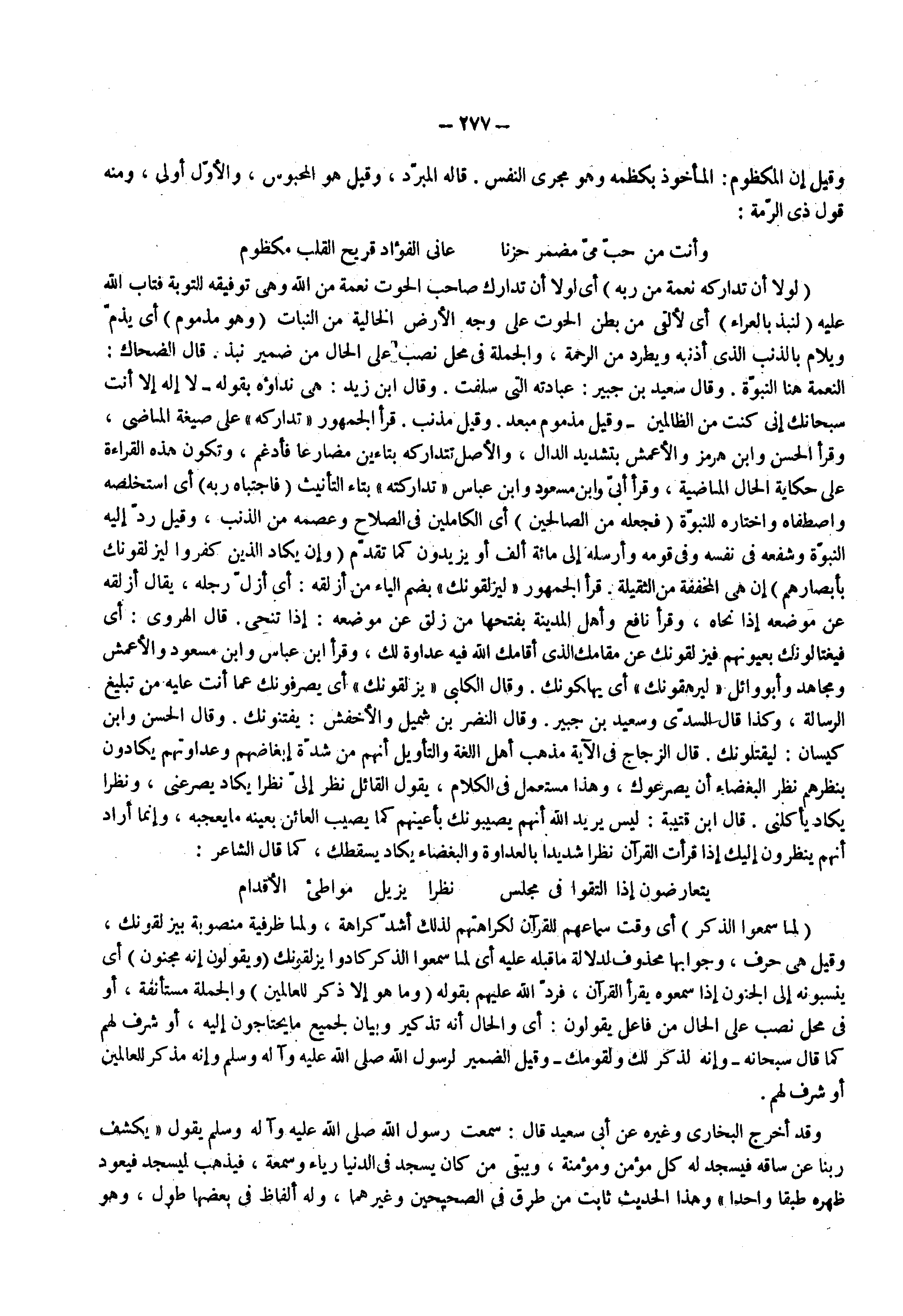 ( وإن يكاد الذين كفروا ليزلقونك بأبصارهم ) إن هي المخففة من الثقيلة قرأ الجمهور ليزلقونك بضم الياء من أزلقه أي أزل رجله يقال أزلقه عن موضعه إذا نحاه وقرأ نافع وأهل المدينة بفتحها من زلق عن موضعه إذا تنحى قال الهروى أي فيغتالونك بعيونهم فيزلقونك عن مقامك الذي أقامك الله فيه عداوة لك وقرأ ابن عباس وابن مسعود والأعمش ومجاهد وأبو وائل ليرهقونك أي يهلكونك وقال الكلبي يزلقونك أي يصرفونك عما أنت عليه من تبليغ الرسالة وكذا قال السدى وسعيد بن جبير وقال النضر بن شميل والأخفش يفتنونك وقال الحسن وابن كيسان ليقتلونك قال الزجاج في الآية مذهب أهل اللغة والتأويل أنهم من شدة إبغاضهم وعداوتهم يكادون ينظرهم نظر البغضاء أن يصرعوك وهذا مستعمل في الكلام يقول القائل نظر إلى نظرا يكاد يصرعنى ونظرا يكاد يأكلني قال ابن قتيبة ليس يريد الله أنهم يصيبونك بأعينهم كما يصيب العائن بعينه ما يعجبه وإنما أراد أنهم ينظرون إليك إذا قرأت القرآن نظرا شديدا بالعداوة والبغضاء يكاد يسقطك كما قال الشاعر يتعارضون إذا التقوا في مجلس