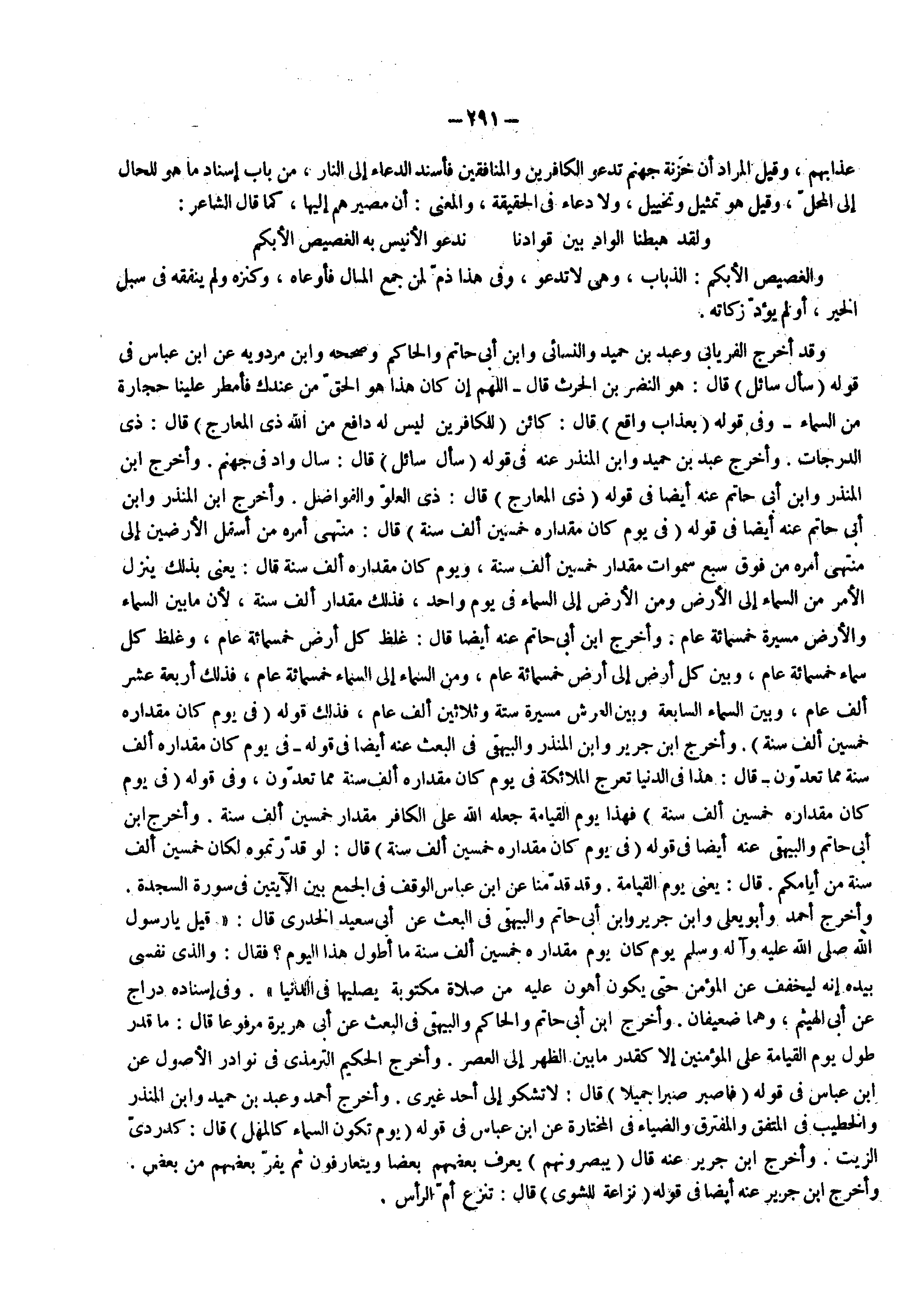 وقد أخرج الفريابي وعبد بن حميد والنسائي وأبن أبي حاتم والحاكم وصححه وأبن مردويه عن ابن عباس في قوله 0 سأل سائل ) قال هو النضر بن الحرث قال اللهم إن كان هذا هو الحق من عندك فأمطر علينا حجارة من السماء وفي قوله 0 بعذاب واقع ) قال كائن ( للكافرين ليس له دافع من الله ذي المعارج ) قال ذي الدرجات وأخرج عبد بن حميد وأبن المنذر عنه في قوله 0 سأل سائل ) قال سال واد في جهنم وأخرج أبن المنذر وأبن أبي حاتم عنه أيضا في قوله ( ذي المعارج ) قال ذي العلو والفواضل وأخرج أبن المنذر وأبن أبي حاتم عنه أيضا في قوله ( في يوم كان مقداره خمسين ألف سنة ) قال منتهى أمره من أسفل الأرضين إلى منتهى أمره من فوق سبع سموات مقدار خمسين ألف سنة ويوم كان مقداره ألف سنة قال يعني بذلك ينزل الأمر من السماء إلى الأرض ومن الأرض إلى السماء في يوم واحد فذلك مقدار ألف سنة لأن ما بين السماء والأرض مسيرة خمسمائة عام واخرج أبن أبي حاتم عنه أيضا قال غلظ كل أرض خمسمائة عام وغلظ كل سماء خمسمائة عام وبين كل أرض إلى أرض خمسمائة عام ومن السماء إلى السماء خمسمائة عام فذلك أربعة عشر ألف عام وبين السماء السابعة وبين العرش مسيرة ستة وثلاثين ألف عام فذلك قوله ( في يوم كان مقداره خمسين ألف سنة ) وأخرج أبن جرير وأبن المنذر والبيهقي في البعث عنه أيضا في قوله في يوم كان مقداره ألف سنة مما تعدون قال هذا في الدنيا تعرج الملائكة في يوم كان مقداره ألف سنة مما تعدون وفي قوله ( في يوم كان مقداره خمسين ألف سنة ) فهذا يوم القيامة جعله الله على الكافر مقدار خمسين ألف سنة وأخرج أبن أبي حاتم والبيهقي عنه أيضا في قوله ( في يوم كان مقداره خمسين الف سنة ) قال لو قدرتموه لكان خمسين ألف سنة من أيامكم قال يعني يوم القيامة وقد قدمنا عن أبن عباس الوقف في الجمع بين الآيتين في سورة السجدة وأخرج أحمد وأبو يعلي وأبن جرير وأبن أبي حاتم والبيهقي في البعث عن أبي سعيد الخدري قال قيل يا رسول الله صلى الله عليه وإله وسلم يوم كان يوم مقداره خمسين ألف سنة ما أطول هذا اليوم فقال والذي نفس بيده إنه ليخفف عن المؤمن حتى يكون أهون عليه من صلاة مكتوبة يصليها في الدنيا وفي إسناده دراج عن أبي الهيثم وهما ضعيفان وأخرج أبن أبي حاتم والحاكم والبيهقي في البعث عن أبي هريرة مرفوعا قال ما قدر طول يوم القيامة على المؤمنين إلا كقدر ما بين الظهر إلى العصر وأخرج الحكيم الترمذي في نوادر الأصول عن أبن عباس في قوله ( فاصبر صبرا جميلا ) قال لا تشكو إلى أحد غيري واخرج أحمد وعبد بن حميد وأبن المنذر والخطيب في المتفق والمفترق والضياء في المنحتارة عن ابن عباس في قوله ( يوم تكون السماء كالمهل ) قال كدردى الزيت وأخرج أبن جرير عنه قال ( يبصرونهم ) يعرف بعضهم بعضا ويتعارفون ثم يفر بعضهم من بعض وأخرج أبن جرير عنه أيضا في قوله ( نزاعة للشوى ) قال تنزع أم الرأس