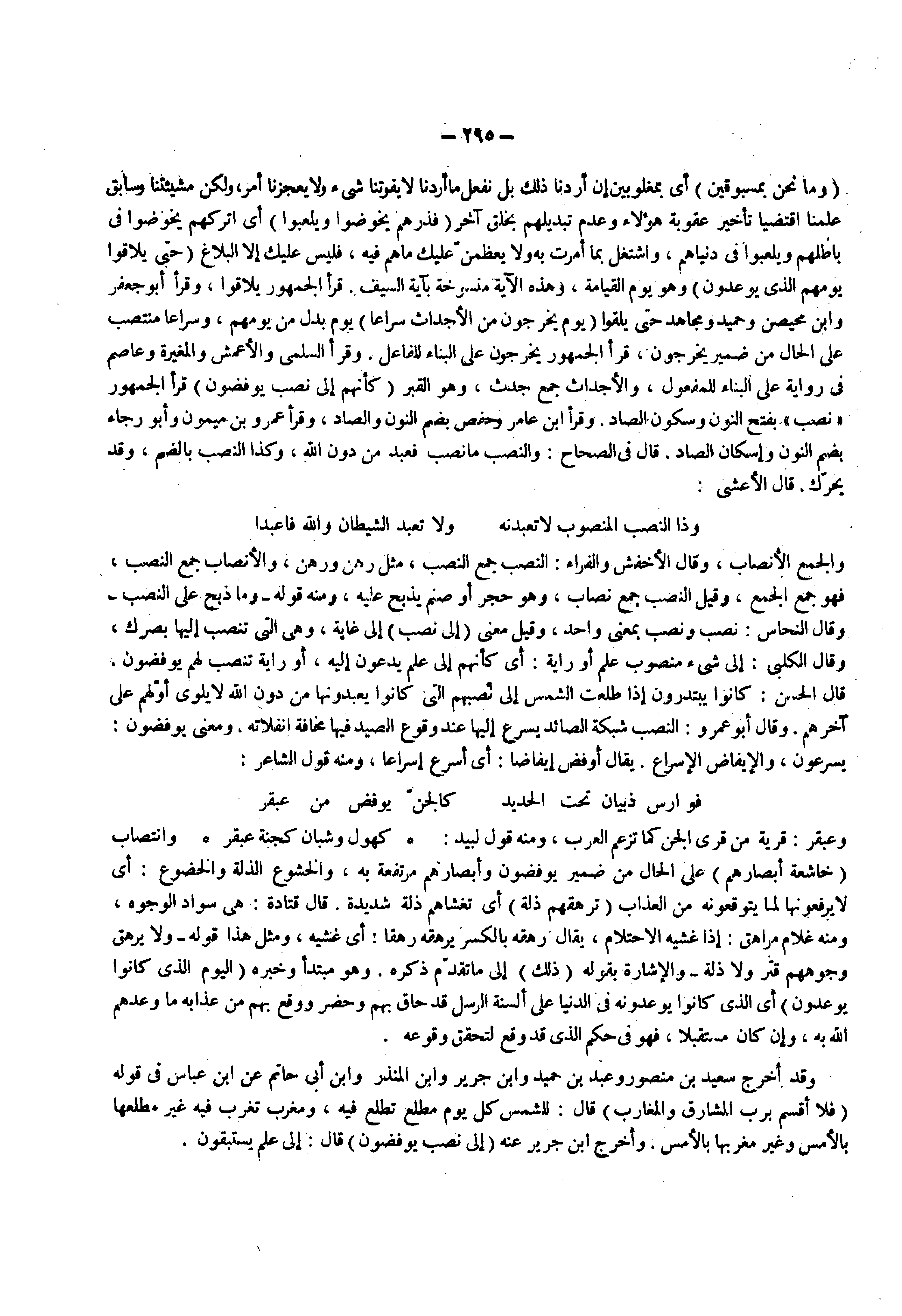 والجمع والأنصاب وقال الأخفش والفراء النصب جمع النصب مثل رهن ورهن والأنصاب جمع النصب فهو جمع الجمع وقيل النصب جمع نصاب وهو حجر أو صنم يذبح عليه ومنه قوله وما ذبح على النصب وقال النحاس نصب ونصب بمعنى واحد وقيل معنى ( إلى نصب ) إلى غاية وهي التي تنصب إليها بصرك وقال الكلبي إلى شيء منصوب علم أو راية أي كأنهم إلى علم يدعون إليه أو راية تنصب لهم يوفضون قال الحسن كانوا يبتدرون إذا طلعت الشمس إلى نصبهم التي كانوا يعبدونها من دون الله لا يلوى أولهم على آخرهم وقال أبو عمرو النصب شبكة الصائد يسرع إليها عند وقوع الصيد فيها مخافة انفلاته ومعنى يوفضون يسرعون والإيفاض الإسراع يقال أوفض إيفاضا أي أسرع إسراعا ومنه قول الشاعر