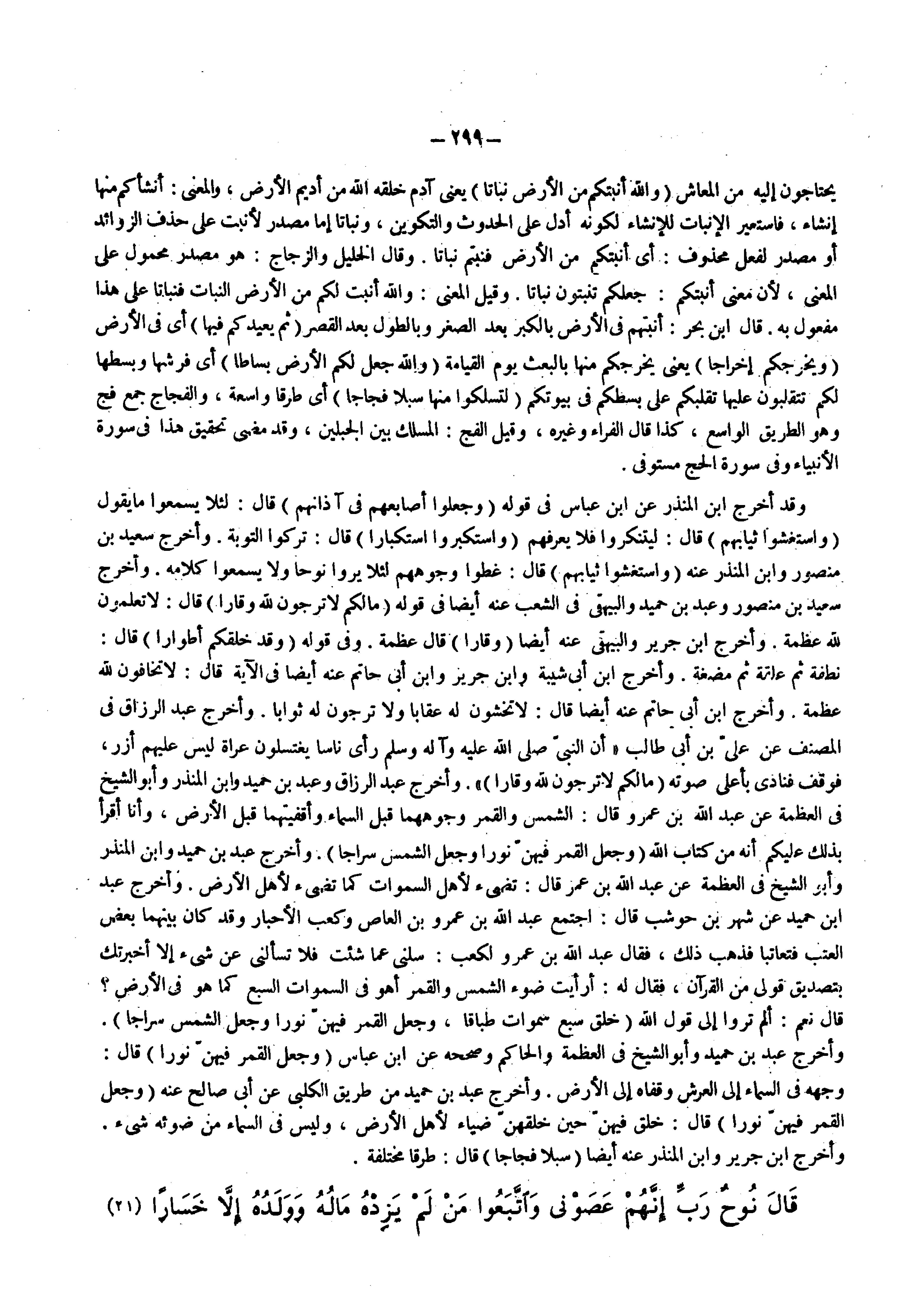 وقد أخرج ابن المنذر عن ابن عباس في قوله ) جعلوا أصابعهم في آذانهم ( قال لئلا يسمعوا ما يقول ) واستغشوا ثيابهم ( قال ليتنكروا فلا يعرفهم ) واستكبروا استكبارا ( قال تركوا التوبة وأخرج سعيد بن منصور وابن المنذر عنه ) واستغشوا ثيابهم ( قال غطوا وجوههم لئلا يروا نوحا ولا يسمعوا كلامه وأخرج سعيد بن منصور وعبد بن حميد والبيهقي في الشعب عنه أيضا في قوله ) ما لكم لا ترجون لله وقارا ( قال لا تعلمون لله عظمة وأخرج ابن جرير والبيهقي عنه أيضا ( وقارا ) قال عظمة وفي قوله ) وقد خلقكم أطوارا ( قال نطفة ثم علقة ثم مضغة وأخرج ابن أبي شيبة وابن جرير وابن أبي حاتم عنه أيضا في الآية قال لا تخافون لله عظمة وأخرج ابن أبي حاتم عنه أيضا قال لا تخشون له عقابا ولا ترجون له ثوابا وأخرج عبد الرزاق في المصنف عن علي بن أبي طالب أن النبي ( صلى الله عليه وسلم ) رأى ناسا يغتسلون عراة ليس عليهم أزر فوقف فنادى بأعلى صوته ( ما لكم لا ترجون لله وقارا ) وأخرج عبد الرزاق وعبد بن حميد وابن المنذر وأبو الشيخ في العظمة عن عبد الله بن عمرو قال الشمس والقمر وجوههما قبل السماء وأقفيتهما قبل الأرض وأنا أقرأ بذلك عليكم انه من كتاب الله ) وجعل القمر فيهن نورا وجعل الشمس سراجا ( وأخرج عبد بن حميد وابن المنذر وابو الشيخ في العظمة عن عبد الله بن عمر قال تضيء لأهل السموات كما تضيء لأهل الأرضر وأخرج عبد ابن حميد عن شهر بن حوشب قال اجتمع عبد الله بن عمرو بن العاص وكعب الإحبار وقد كان بينهما بعض العتب فتعاتبا فذهب ذلك فقال عبد الله بن عمرو لكعب سلني عما شئت فلا تسألني عن شيء إلا أخبرتك بتصديق قولي من القرآن فقال له أرأيت ضوء الشمس والقمر أهو في السموات السبع كما هو في الأرض قال نعم ألم تروا إلى قول الله ) خلق الله سبع سماوات طباقا وجعل القمر فيهن نورا وجعل الشمس سراجا ( وأخرج عبد بن حميد وأبو الشيخ في العظمة والحاكم وصححه عن ابن عباس ) وجعل القمر فيهن نورا ( قال وجهه في السماء إلى العرش وقفاه إلى الأرض وأخرج عبد بن حميد من طريق الكلبي عن أبي صالح عنه ) وجعل القمر فيهن نورا ( قال خلق فيهن حين خلقهن ضياء لأهل الأرض وليس في السماء من ضوئه شيء وأخرج ابن جرير وابن المنذر عنه أيضا ) سبلا فجاجا ( قال طرقا مختلفة