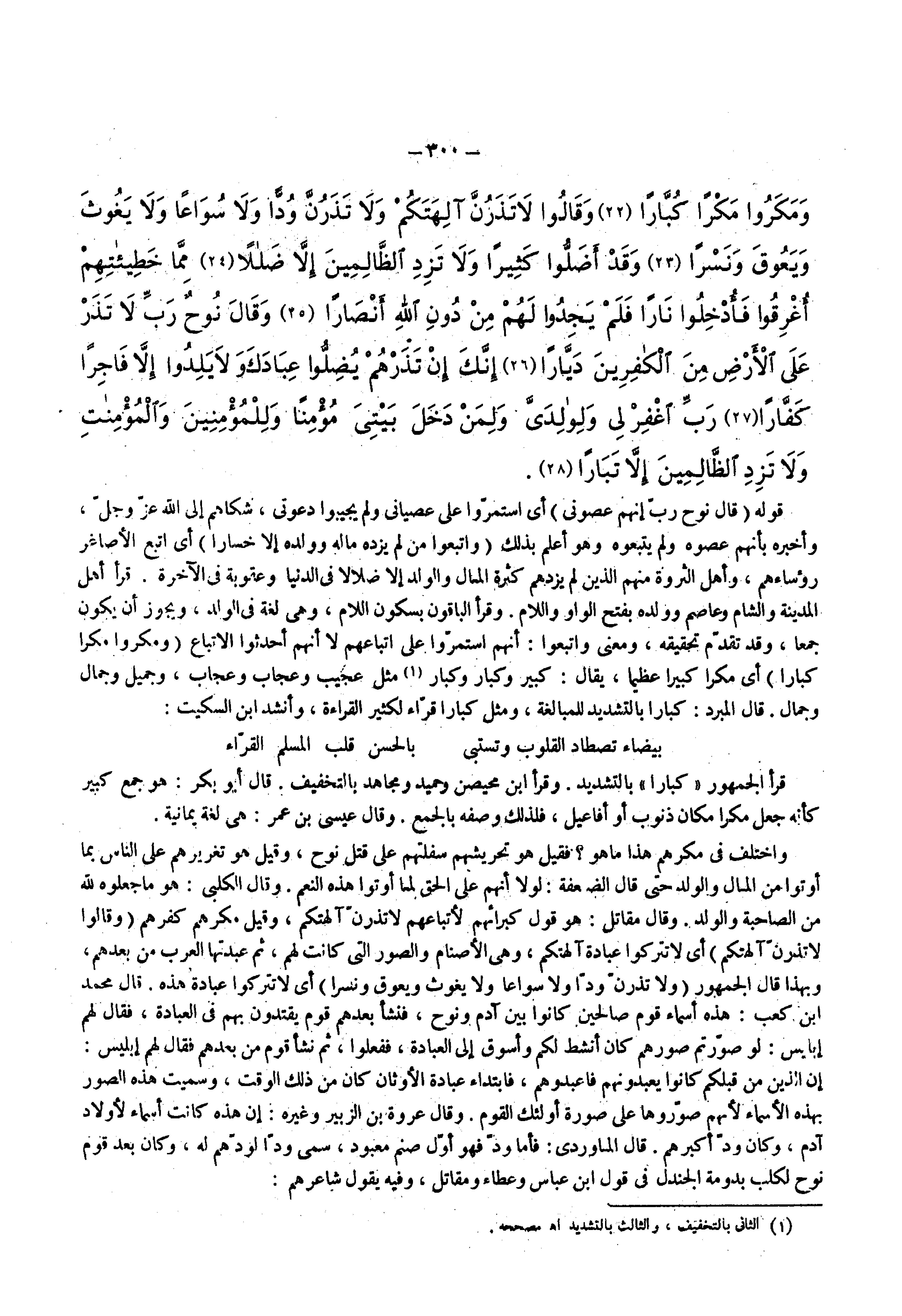 قرأ الجمهور كبارا بالتشديد وقرأ ابن محيصن وحميد ومجاهد بالتخفيف قال أبو بكر هو جمع كبير كأنه جعل مكرا مكان ذنوب أو أفاعيل فلذلك وصفه بالجمع وقال عيسى بن عمر هي لغة يمانية واختلف في مكرهم هذا ما هو فقيل هو تحريشهم سفلتهم على قتل نوح وقيل هو تغريدهم على الناس بما أوتوا من المال والولد حتى قال الضعفة لولا أنهم على الحق لما أوتوا هذه النعم وقال الكلبي هو ما جعلوه لله من الصاحبة والولد وقال مقاتل هو قول كبرائهم لأتباعهم لا تذرن آلهتكم وقيل مكرهم كفرهم
